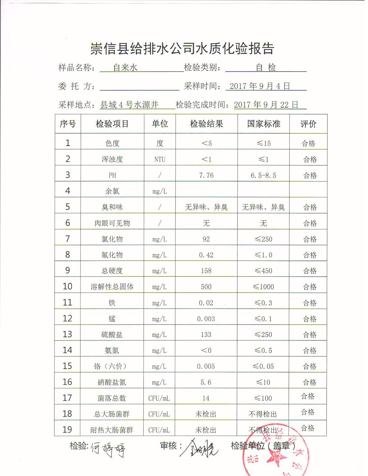 自来水9月水质化验报告单-县城4号水源井 发文日期:2017-09-30 11:33 来源:崇信县住房和城乡建设局 作者:崇信住建局 编辑:崇信住建局 扫一扫在手机打开当前页 上一篇: 自来水9月水质化验报告单-新窑水厂院内清水池 下一篇: 自来水9月水质化验报告单-县城水厂院内清水池9.22