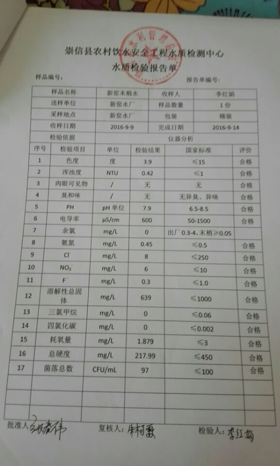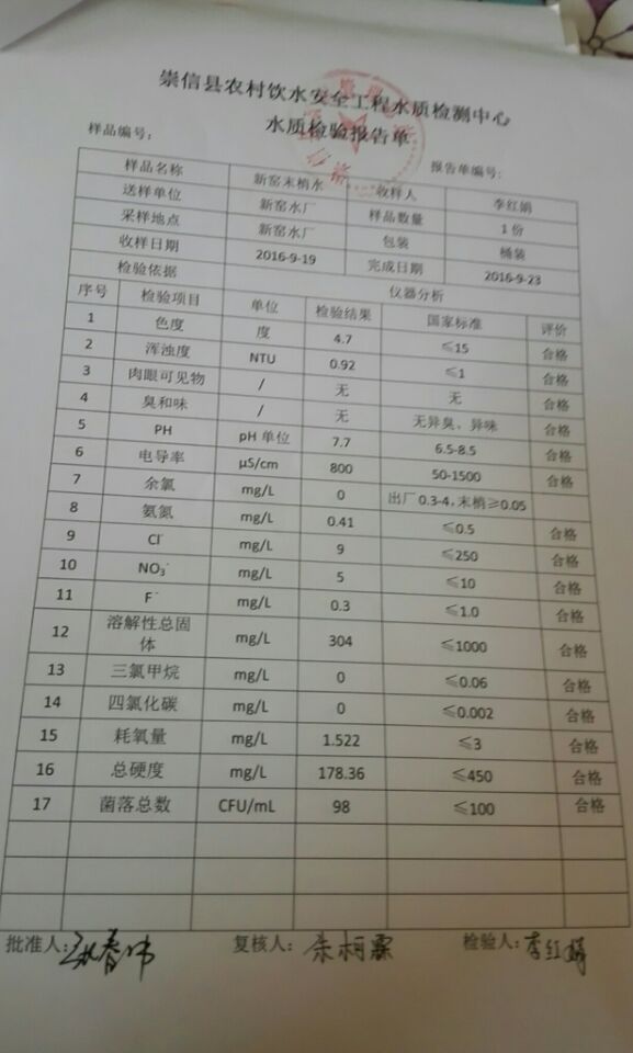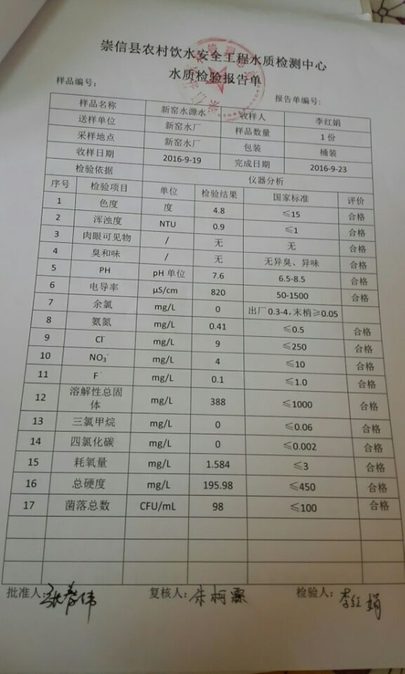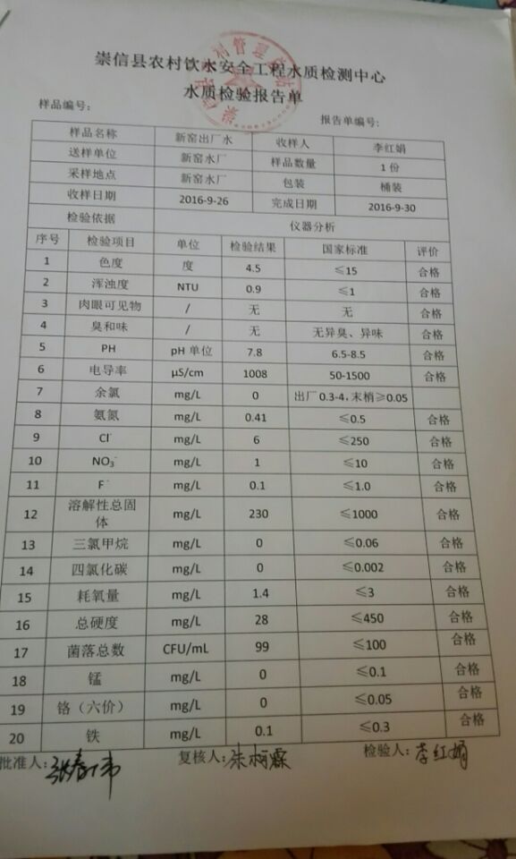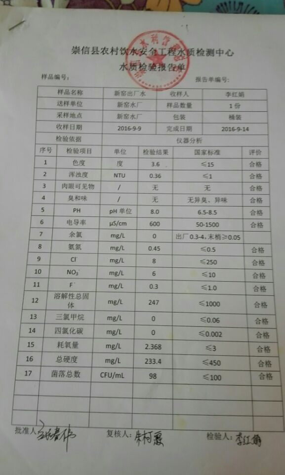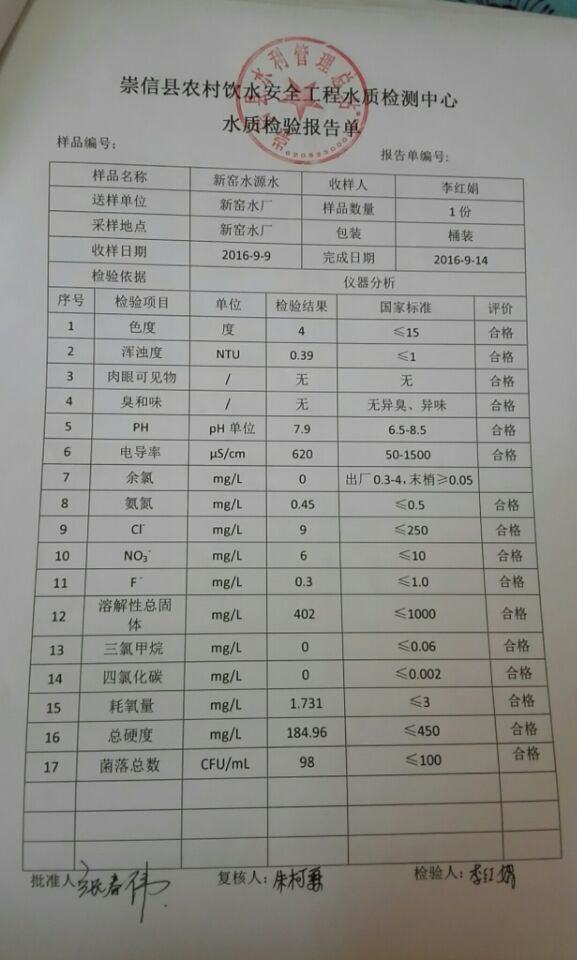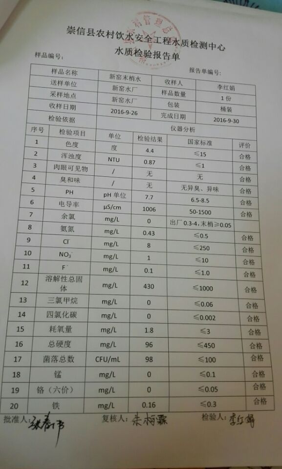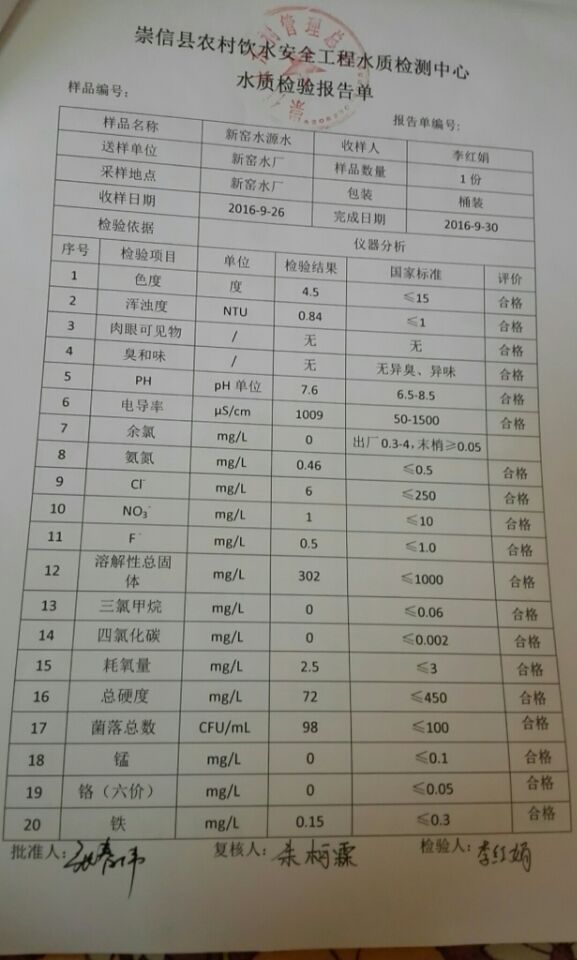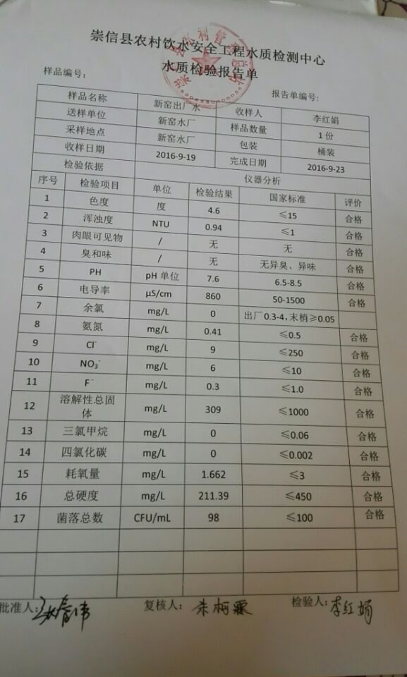 新窑水厂9月份水质检测报告单