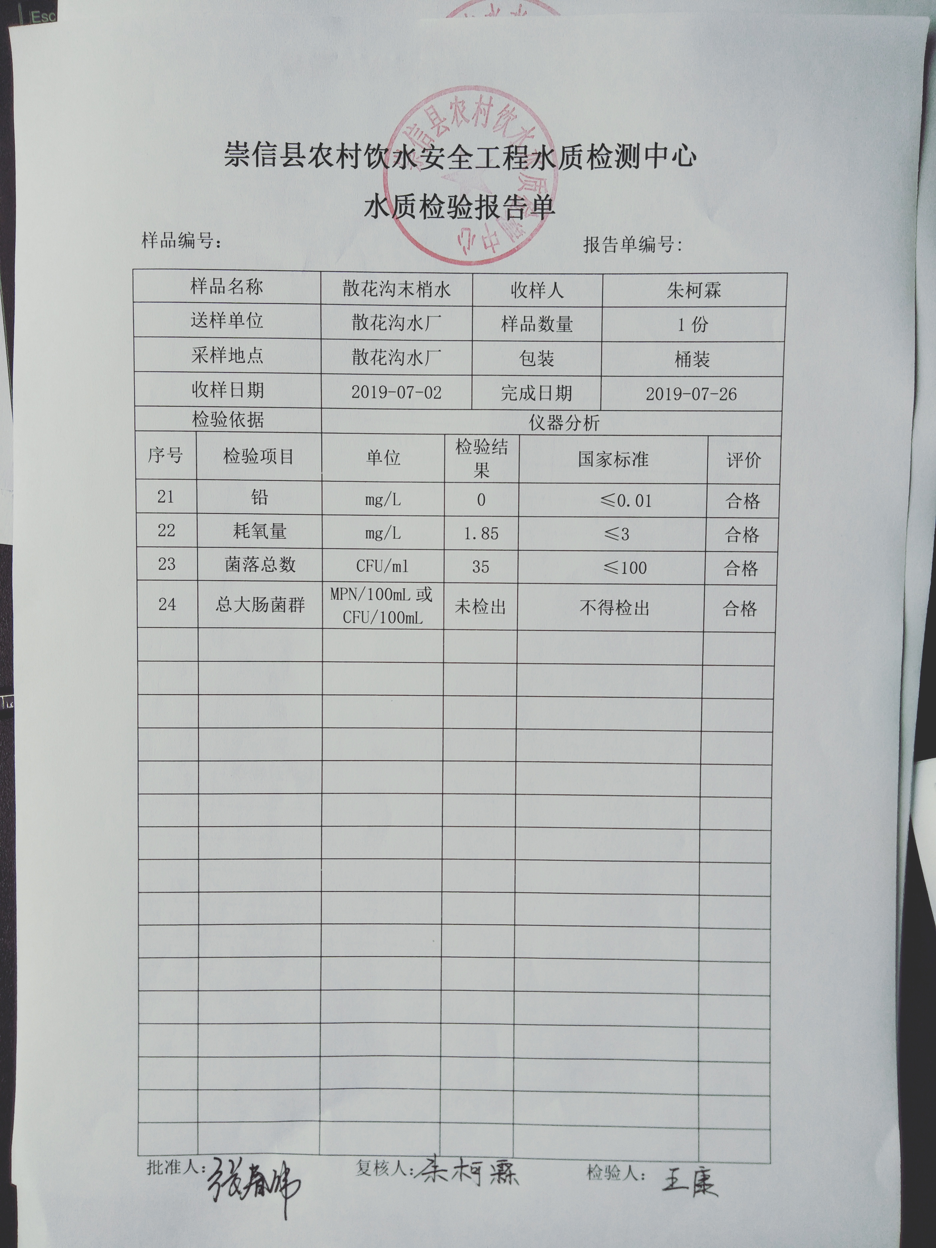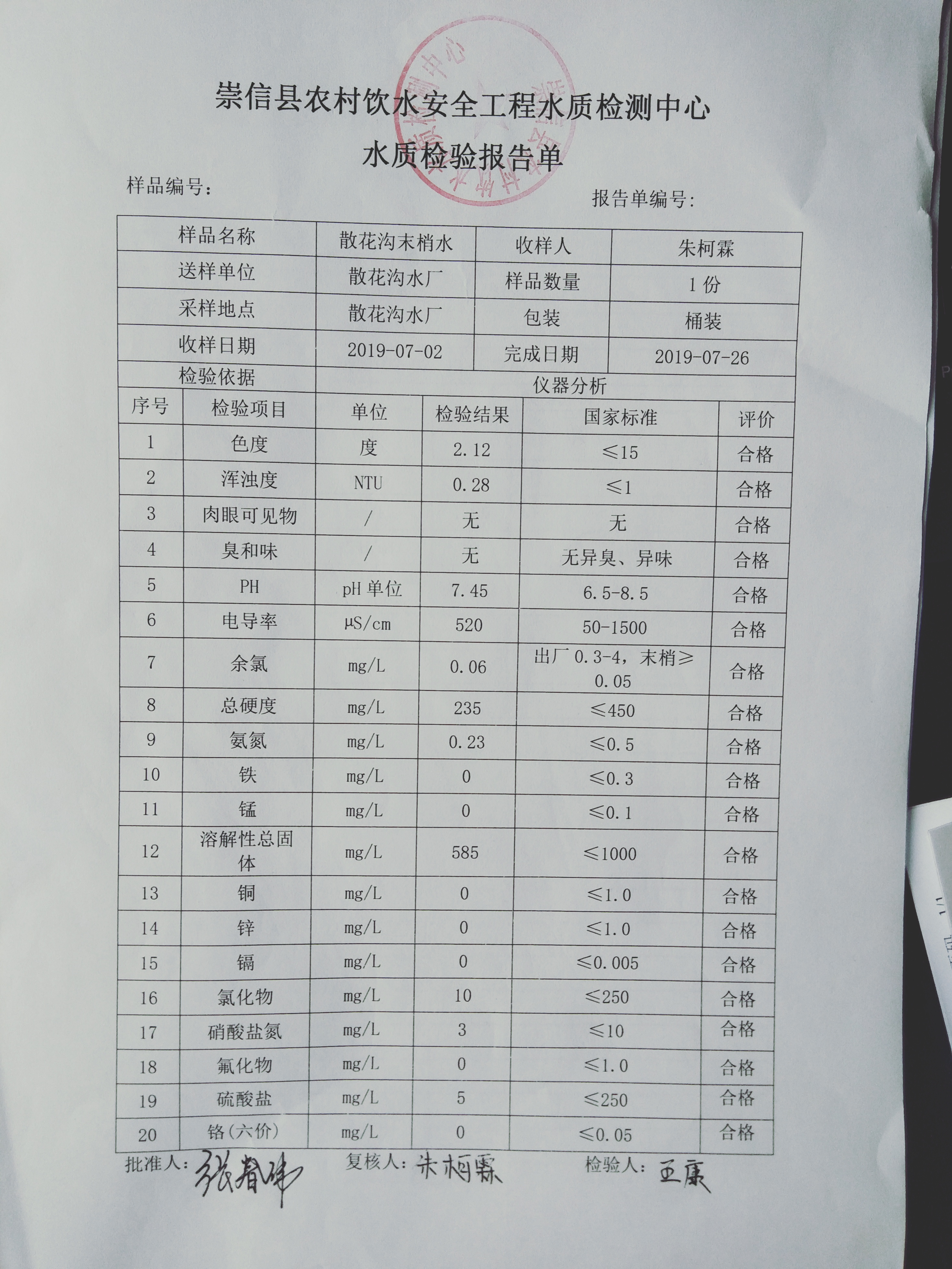 2019年7月份散花沟水厂水质检测中心 发文日期:2019-08-08 00:00 来源:崇信县水务局 作者:崇信水务局 编辑:崇信水务局 1565246332606 1565246357699 扫一扫在手机打开当前页 上一篇: 2019年7月份水质化验报告单 下一篇: 2019年7月份左营沟水厂水质检测报告单