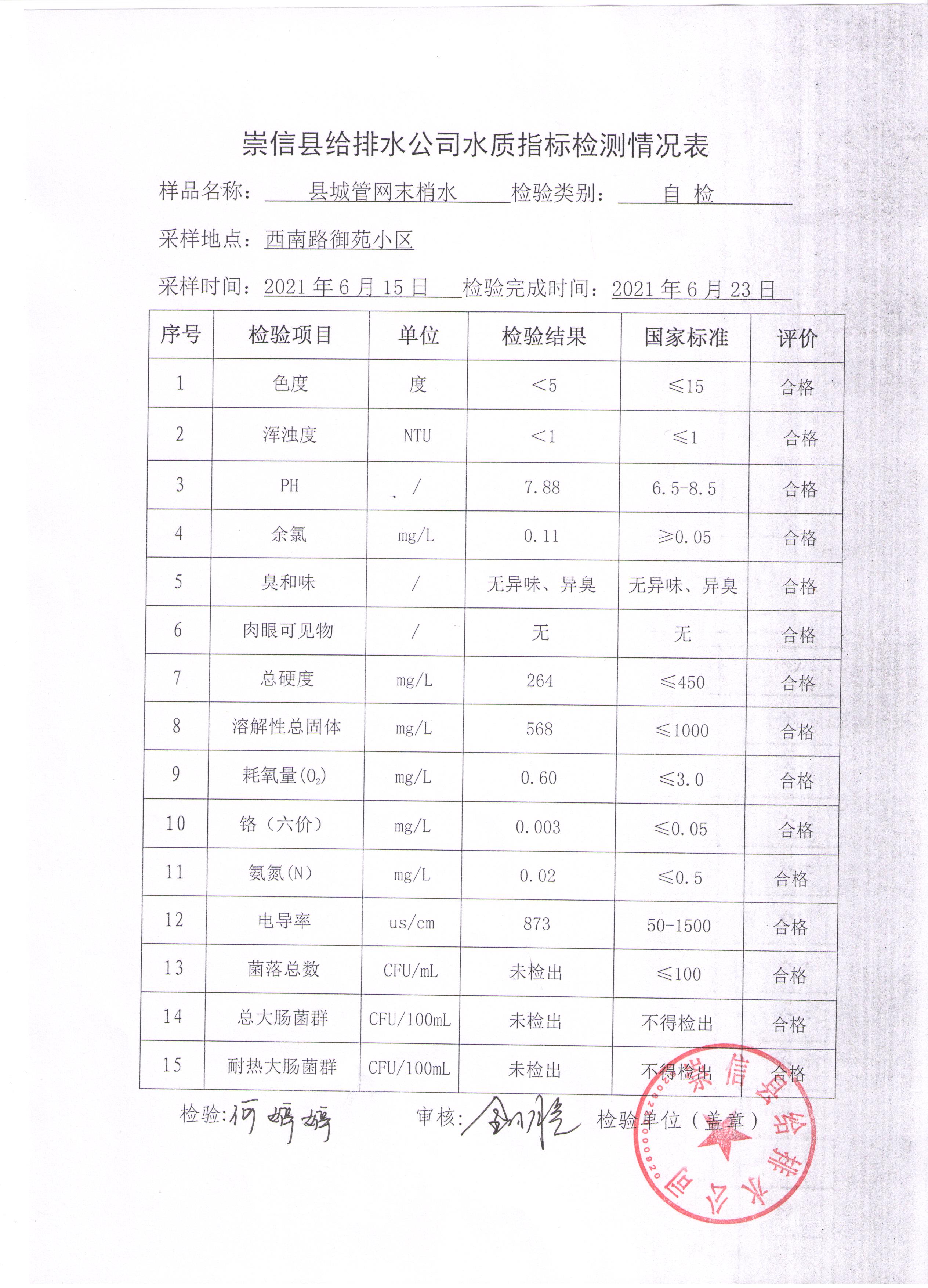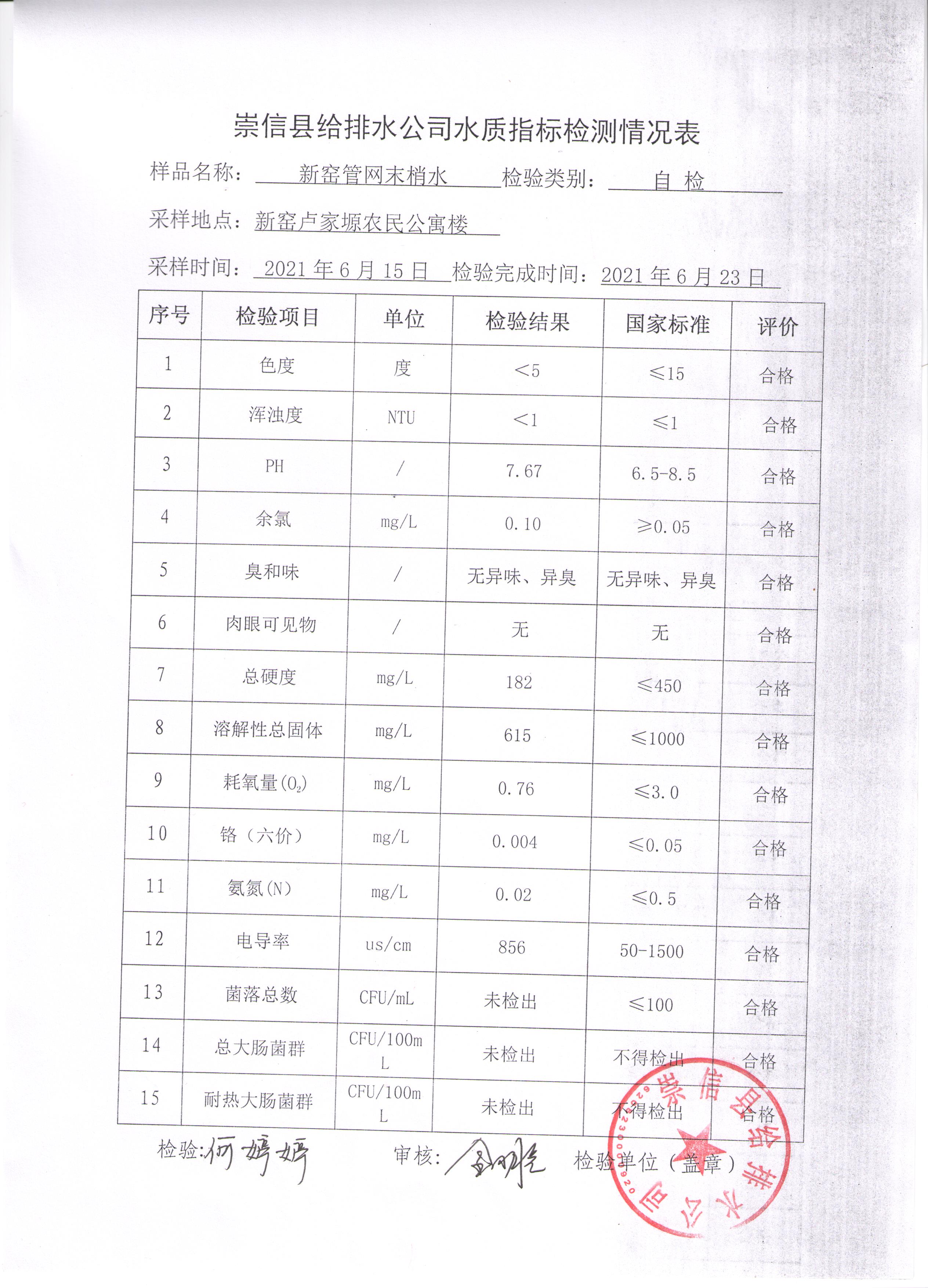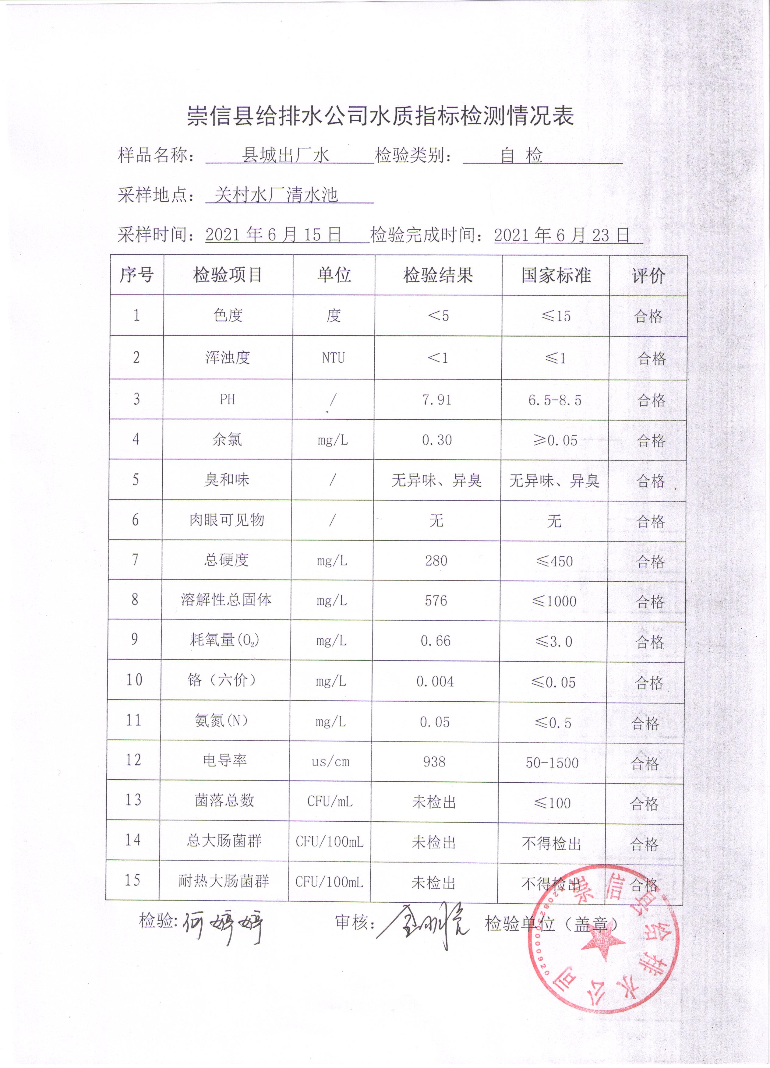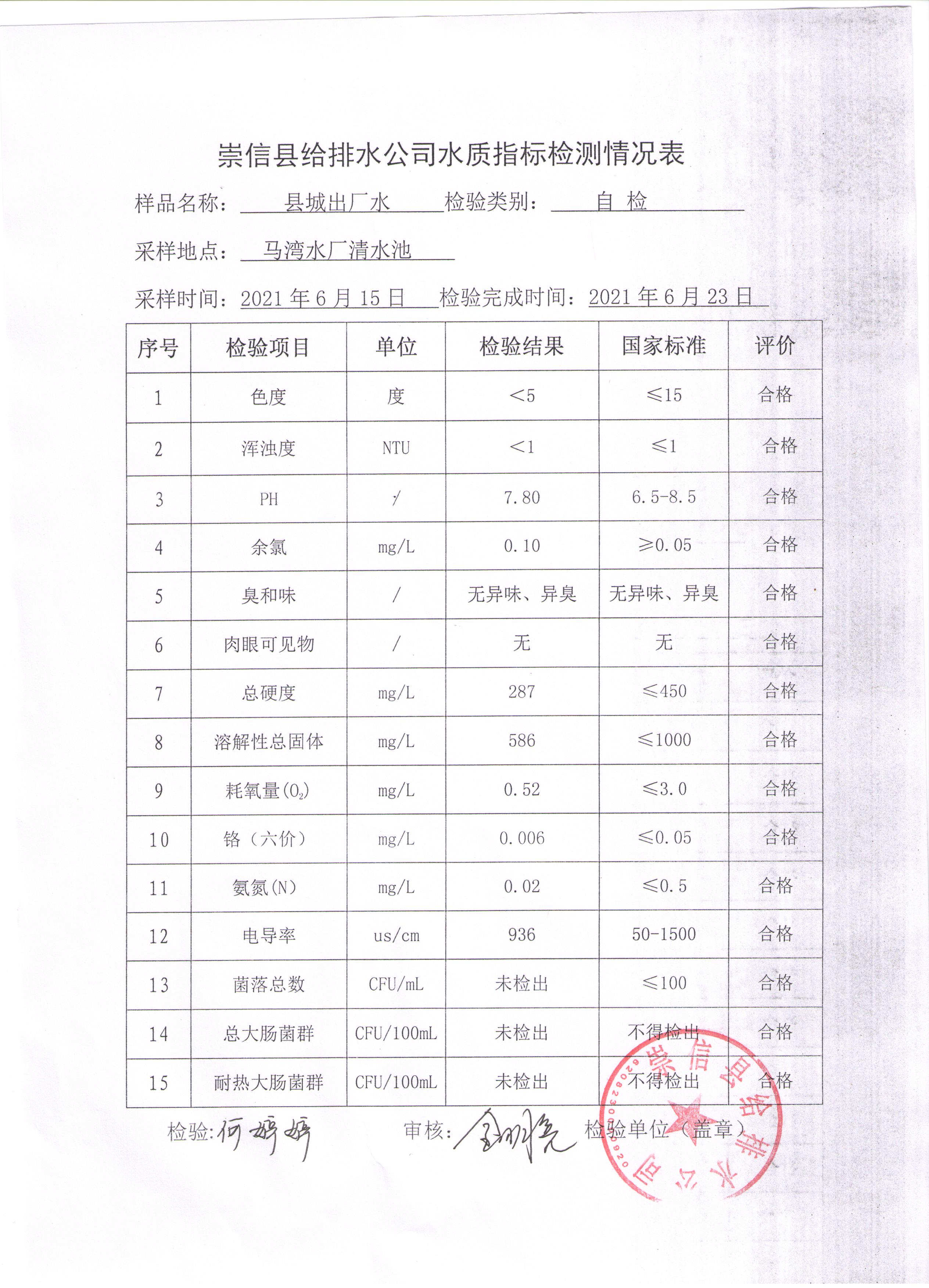 2021年6月份水质化验报告单 发文日期:2021-07-09 00:00 来源:崇信县住房和城乡建设局 作者:崇信县给排水公司 编辑:崇信县给排水公司 县城关村水厂出厂水 县城马湾水厂出厂水 县城管网末梢水 新窑出厂水 新窑管网末梢水 扫一扫在手机打开当前页 上一篇: 2021年7月左营沟水厂水质检测报告单 下一篇: 2021年上半年崇信县县级集中式 生活饮用水地下水源地水质状况