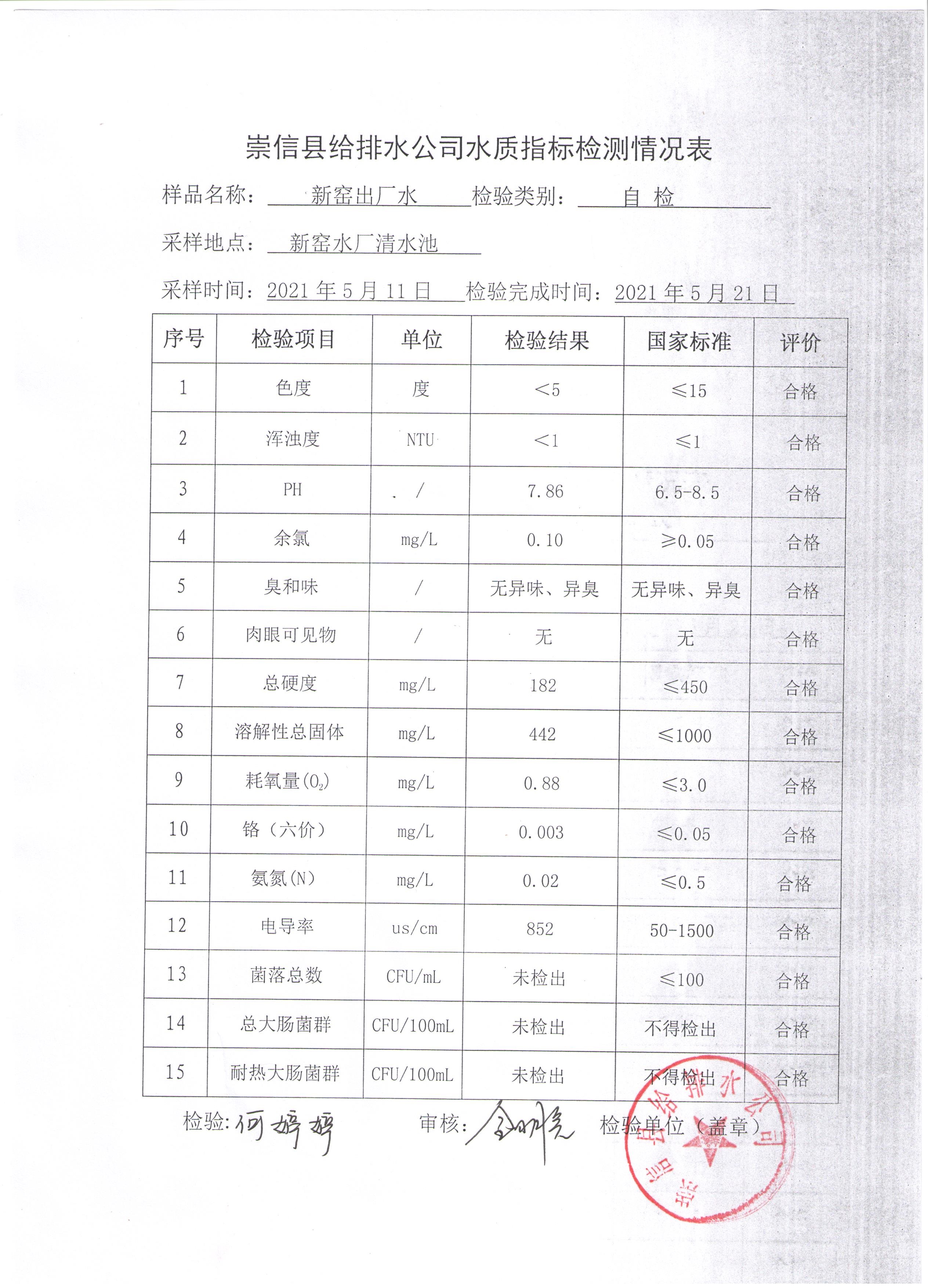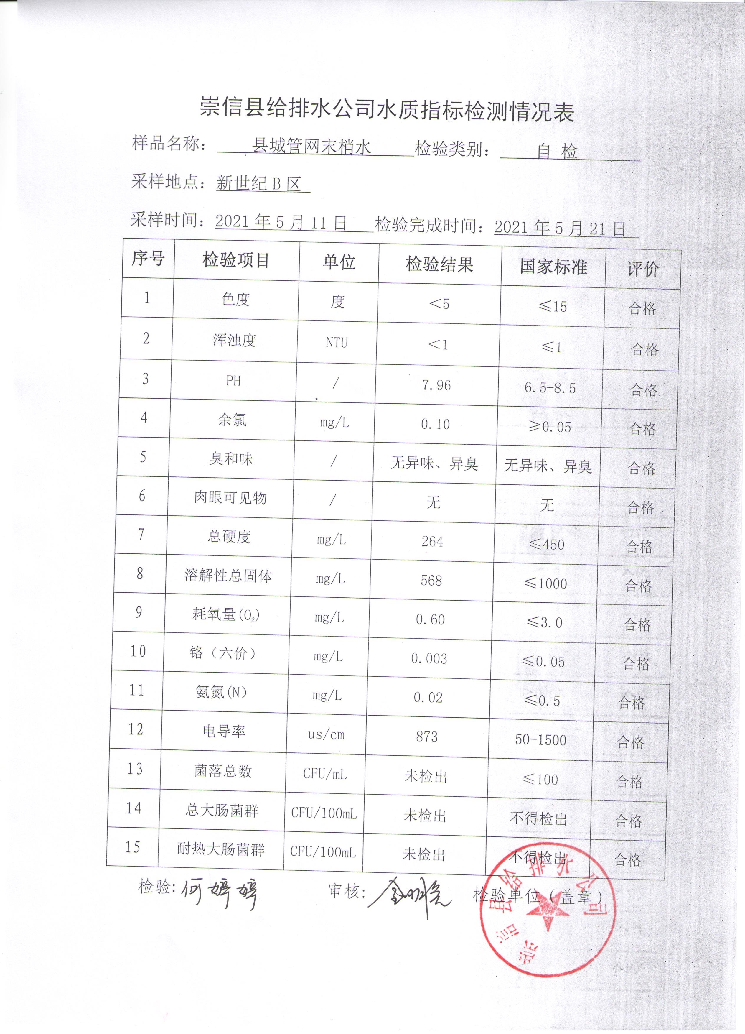 2021年5月份水质化验报告 发文日期:2021-06-18 00:00 来源:崇信县住房和城乡建设局 作者:崇信县给排水公司 编辑:崇信县给排水公司 马湾出厂水 关村出厂水 县城末梢水 新窑出厂水 新窑末梢水 扫一扫在手机打开当前页 上一篇: 2021年上半年崇信县县级集中式 生活饮用水地下水源地水质状况 下一篇: 2021年5月份水质化验报告