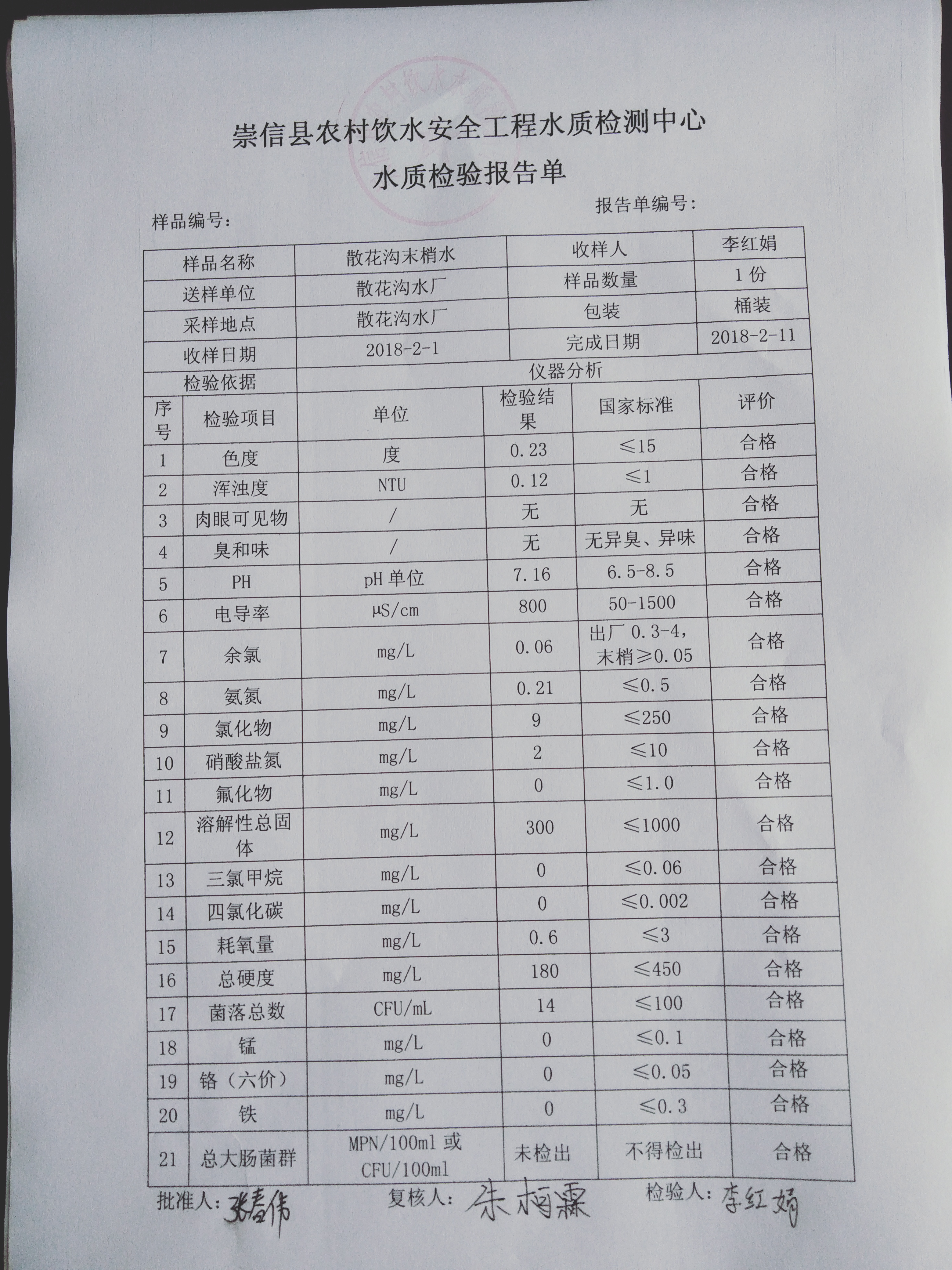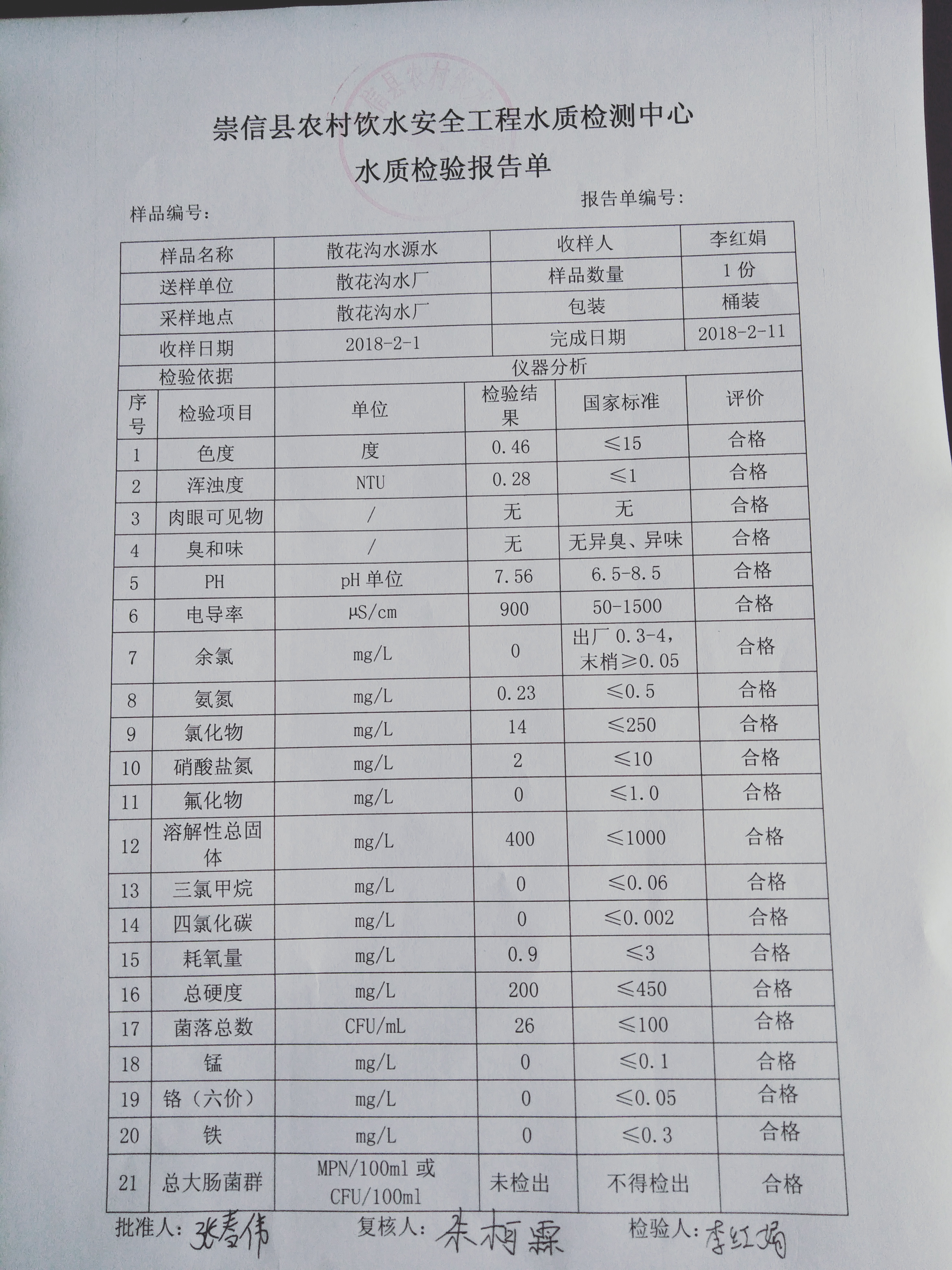 2018年散花沟水厂2月份水质检测报告单 发文日期:2018-03-09 11:53 来源:崇信县水务局 作者:崇信水务局 编辑:崇信水务局 1520564759146(1) 1520564859886 1520564881206 扫一扫在手机打开当前页 上一篇: 崇信县2018年脱贫攻坚农村饮水安全巩固提升项目开工前公示表 下一篇: 2018年杜家沟水厂2月份水质检测报告单