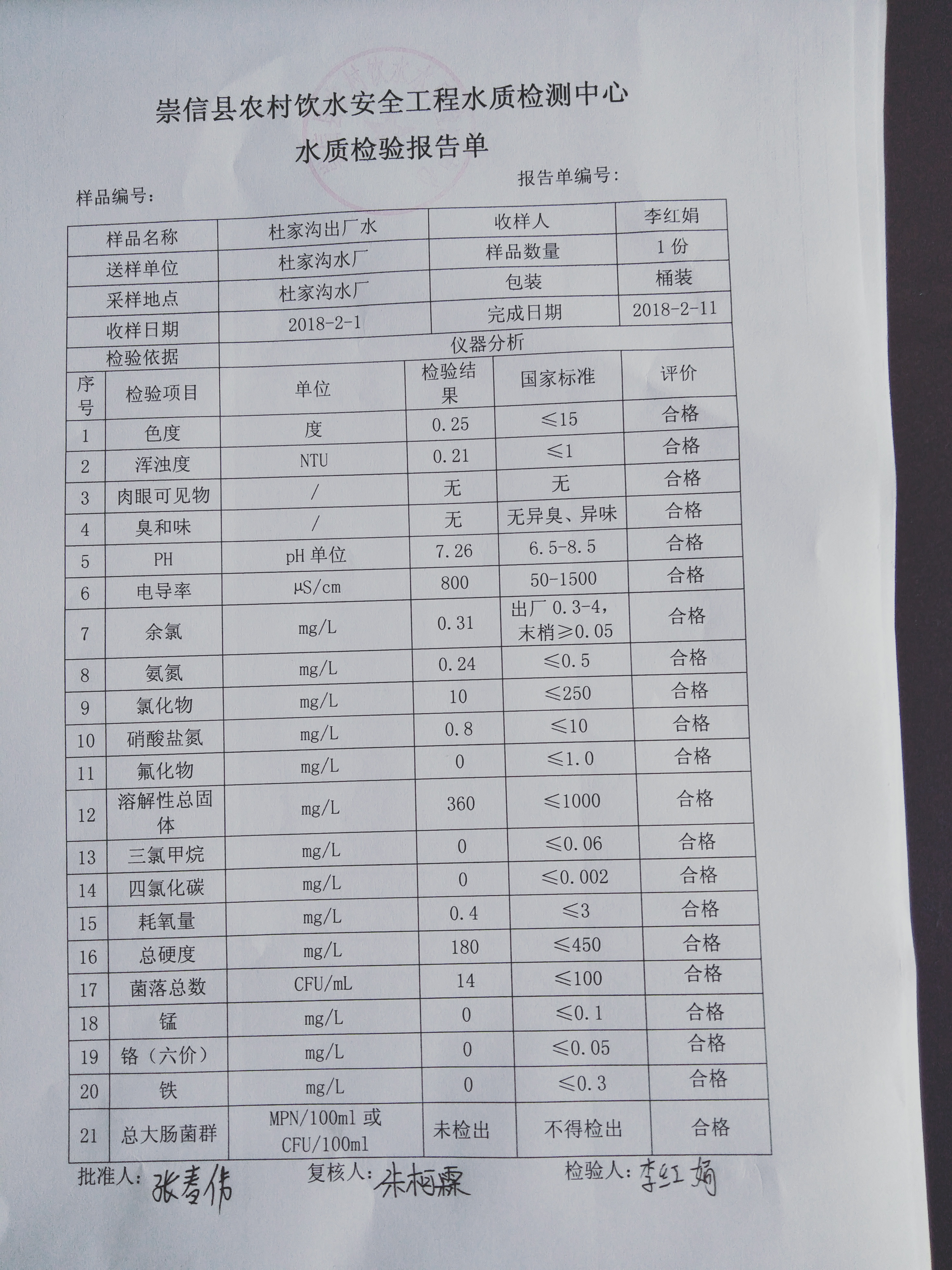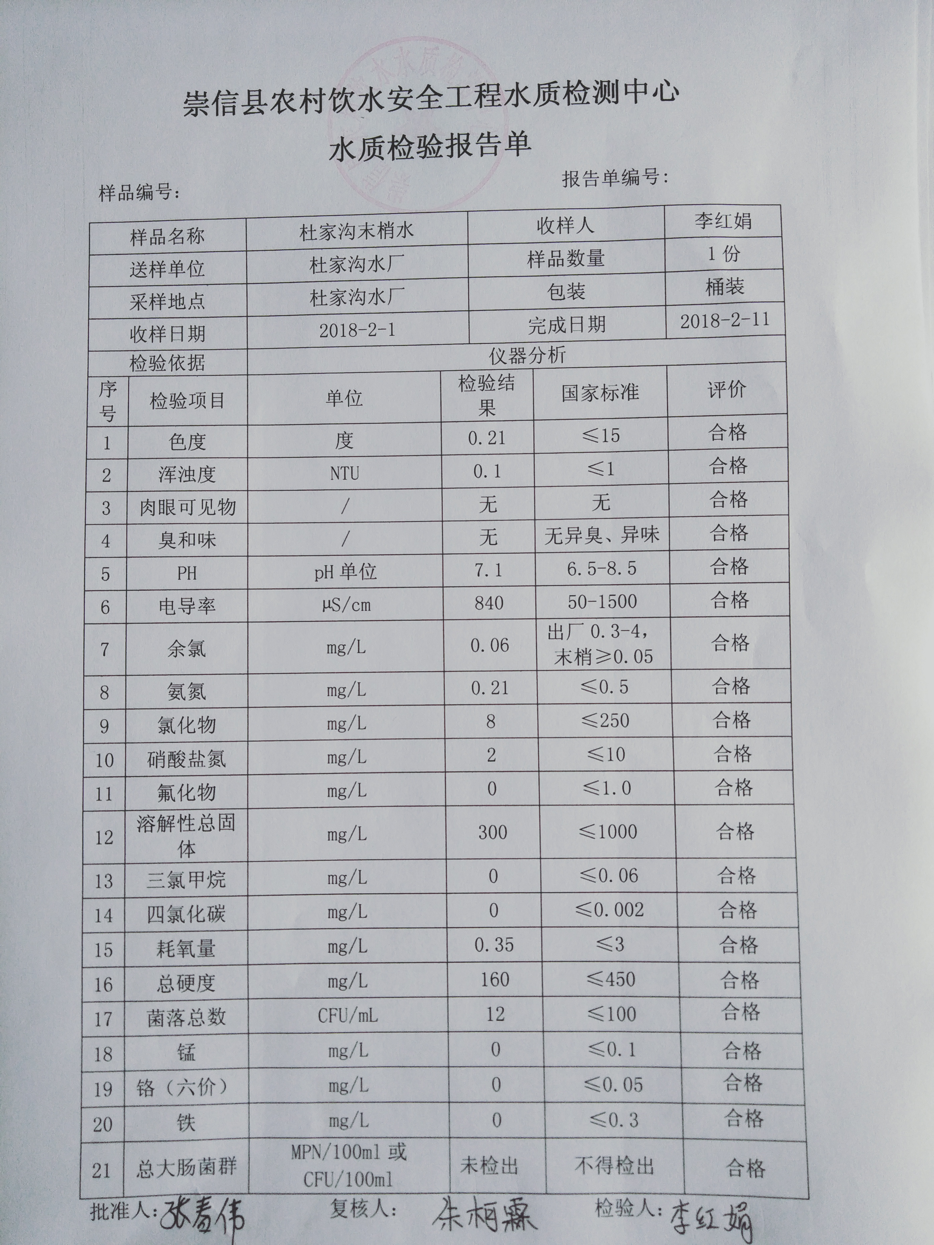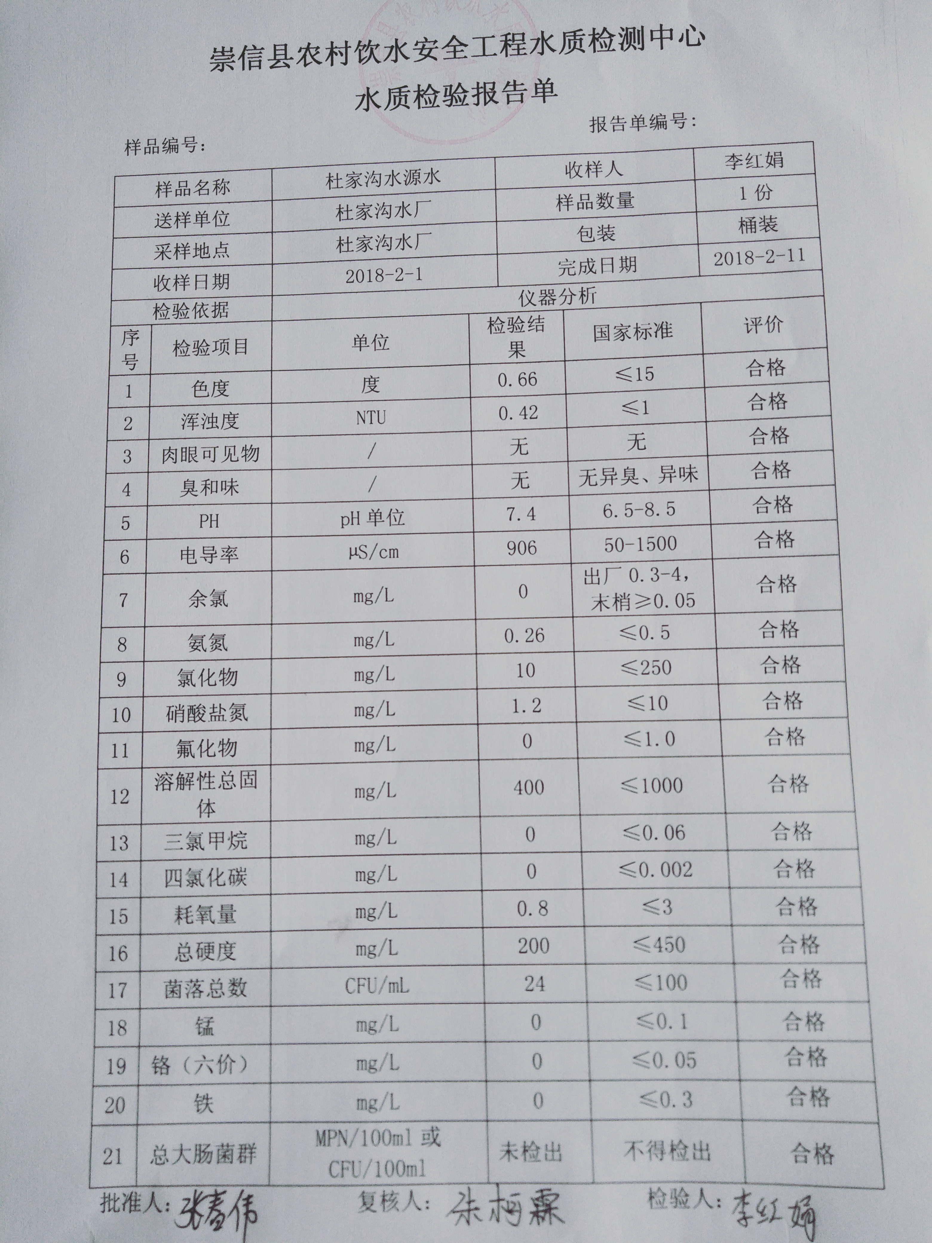 2018年杜家沟水厂2月份水质检测报告单 发文日期:2018-03-09 11:51 来源:崇信县水务局 作者:崇信水务局 编辑:崇信水务局 1520564664770 1520564719542 1520564737876 扫一扫在手机打开当前页 上一篇: 2018年散花沟水厂2月份水质检测报告单 下一篇: 2018年新窑水厂2月份水质检测报告单