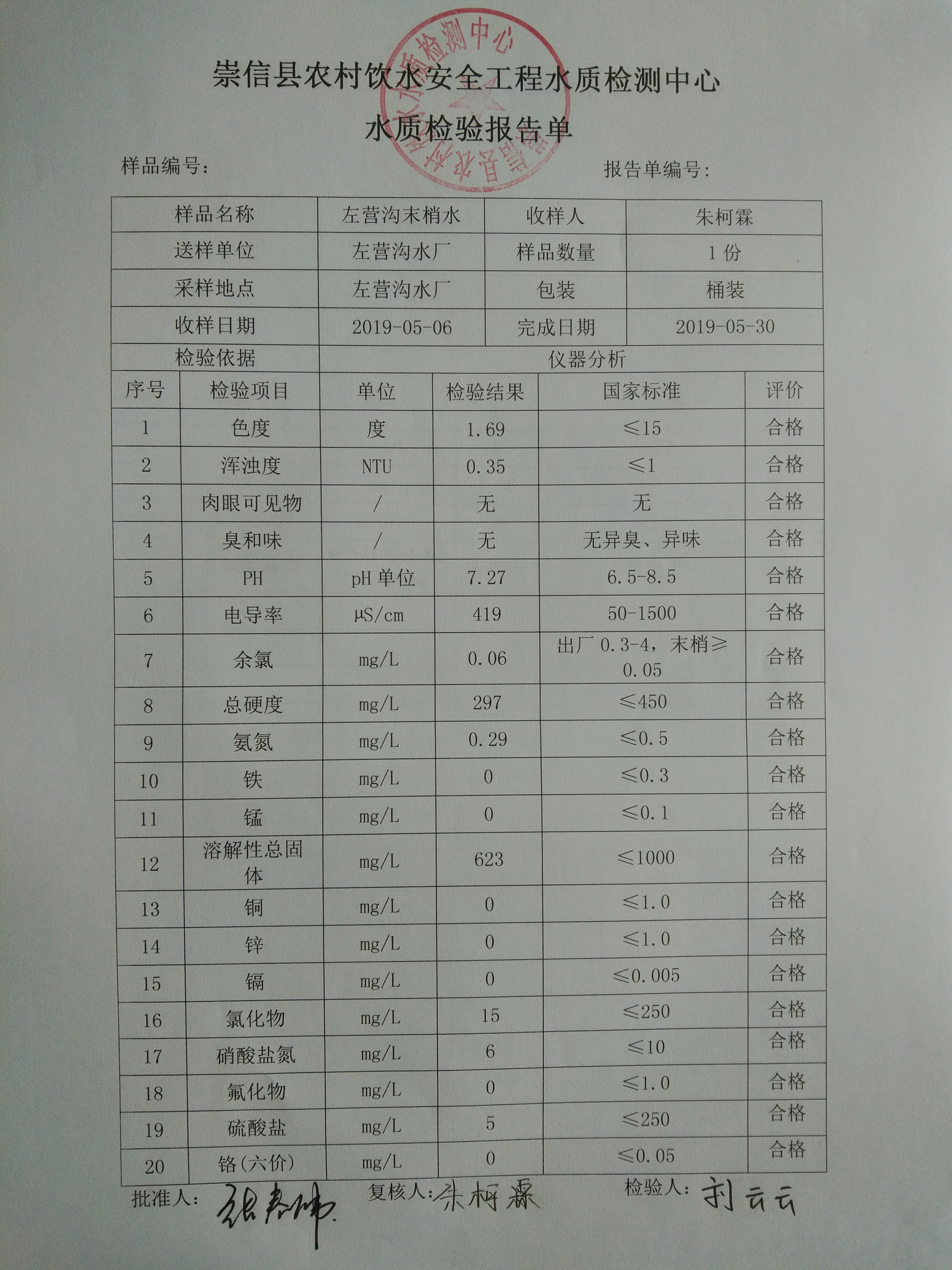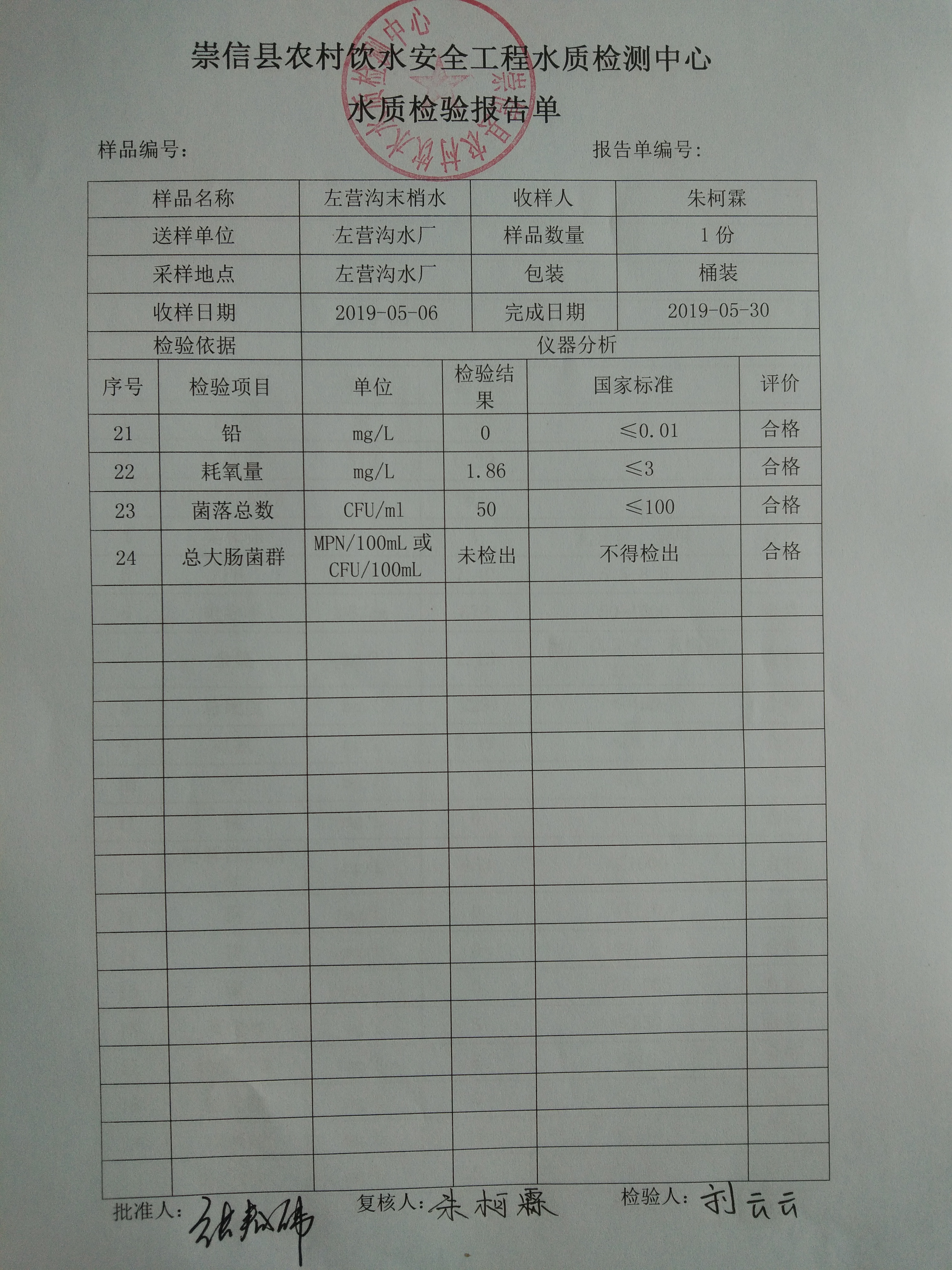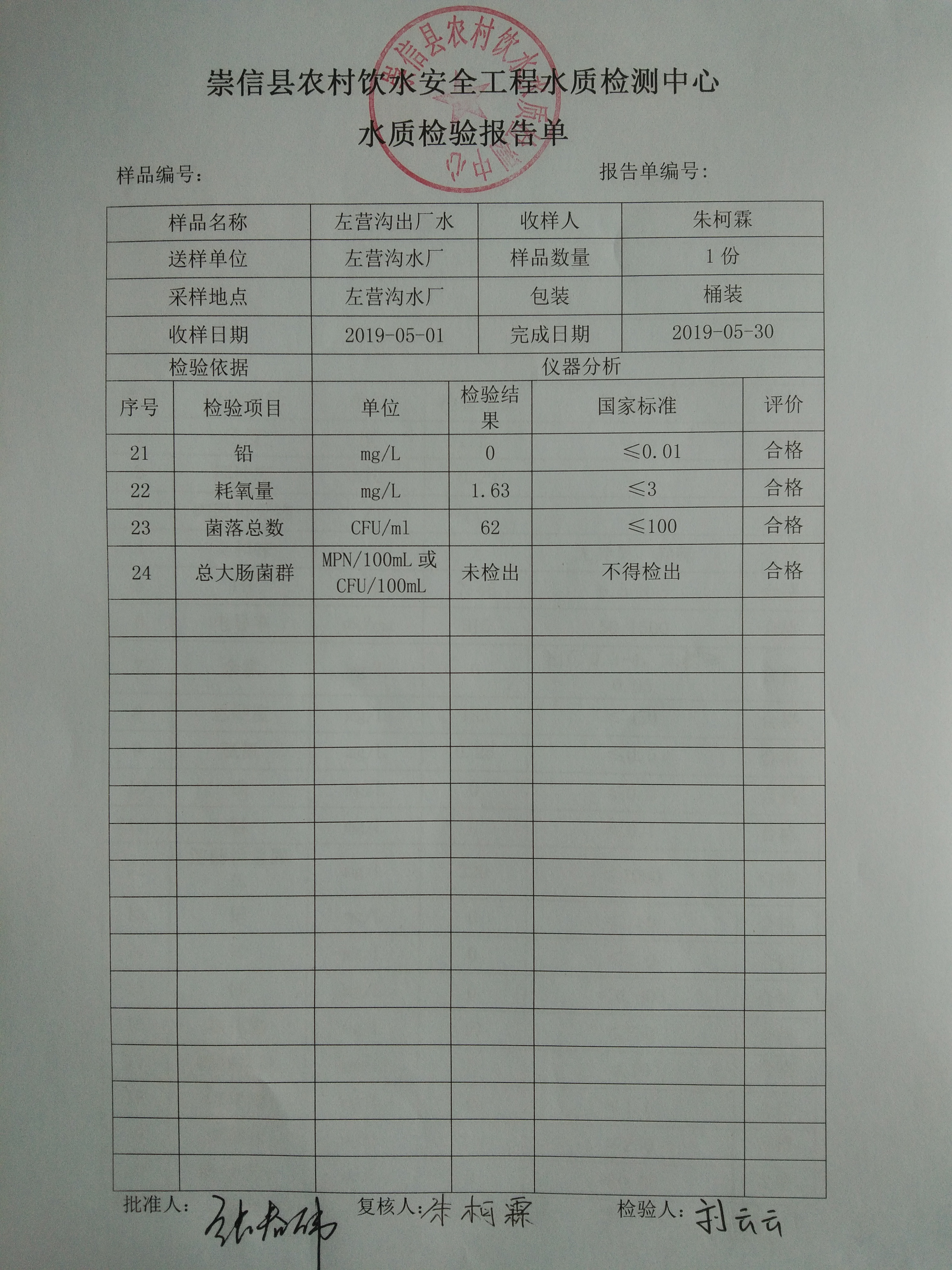 2019年左营沟水厂水质检测报告 发文日期:2019-05-28 00:00 来源:崇信县水务局 作者:崇信水务局 编辑:崇信水务局 IMG_20190528_145051 IMG_20190528_145058 IMG_20190528_145108 IMG_20190528_145136 IMG_20190528_145152 IMG_20190528_145201 扫一扫在手机打开当前页 上一篇: 2019年5月份新窑水厂水质检测报告 下一篇: 2019年5月份杜家沟水厂水质检测报告
