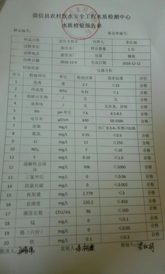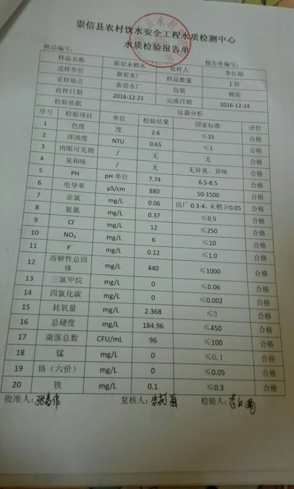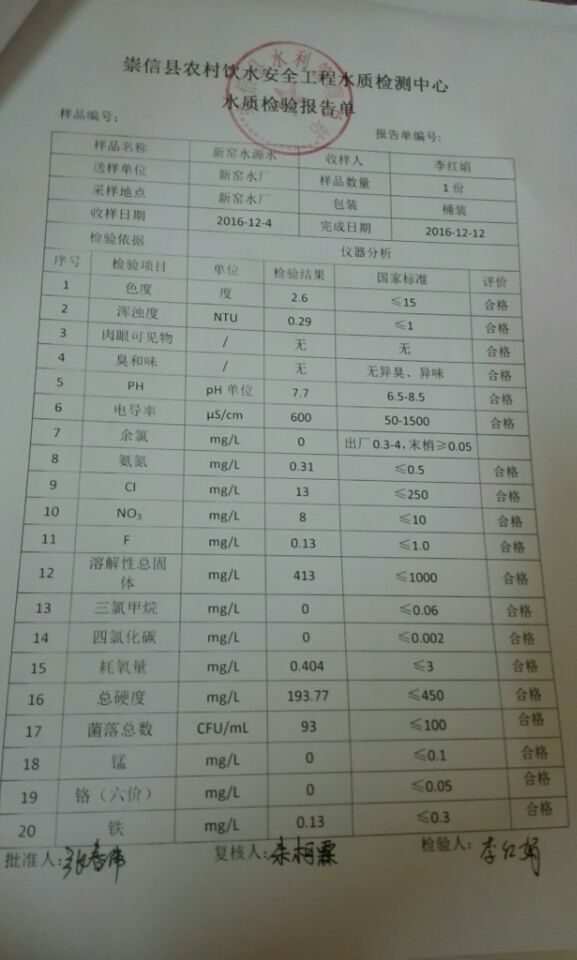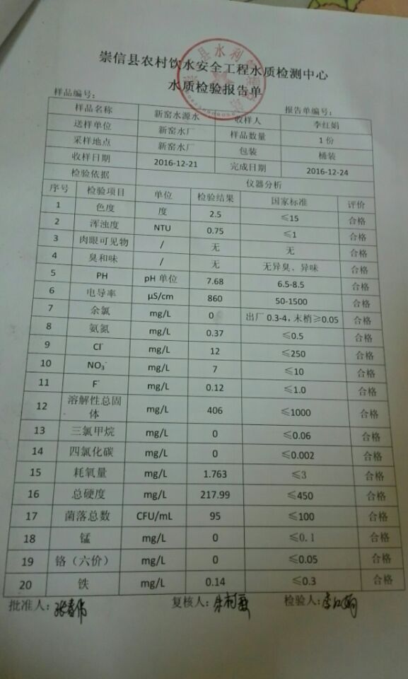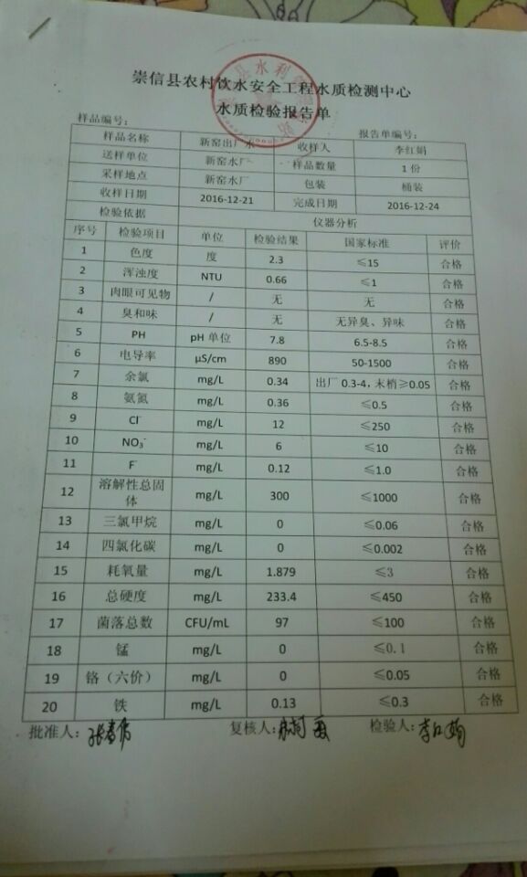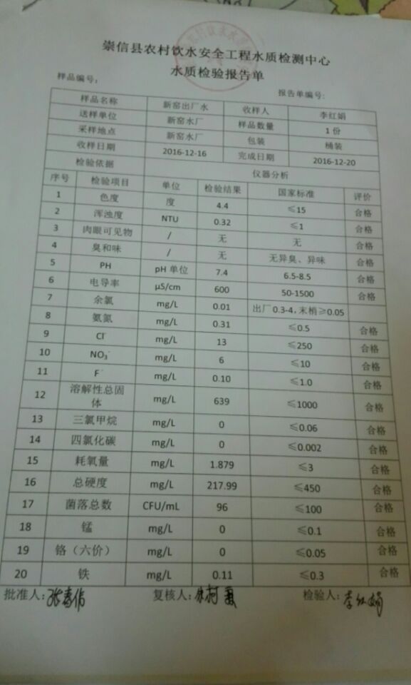 新窑水厂12月份水质检测报告单