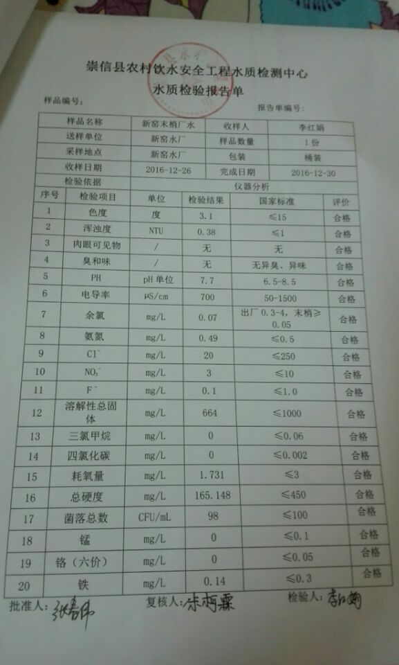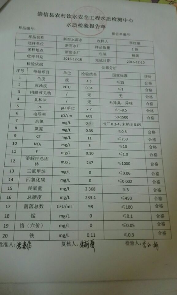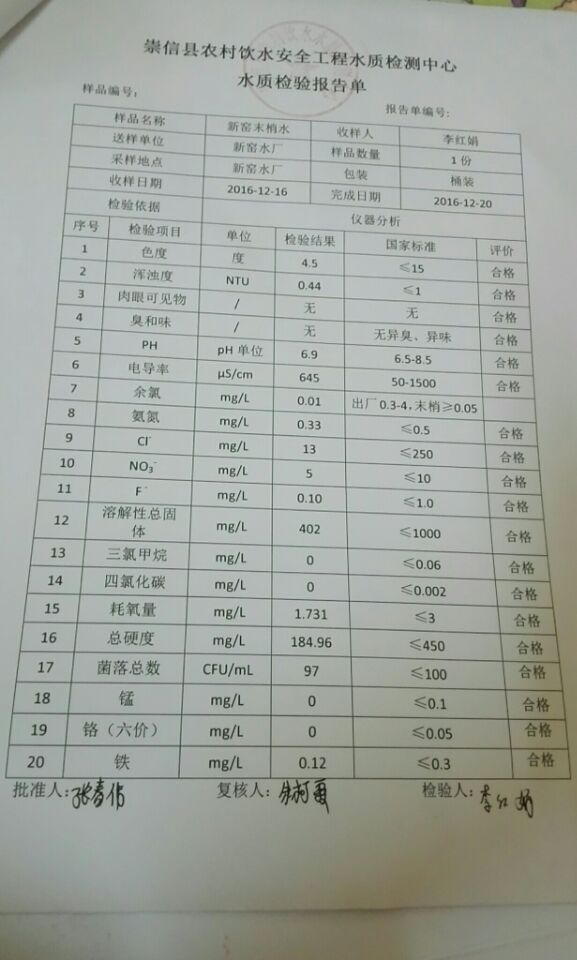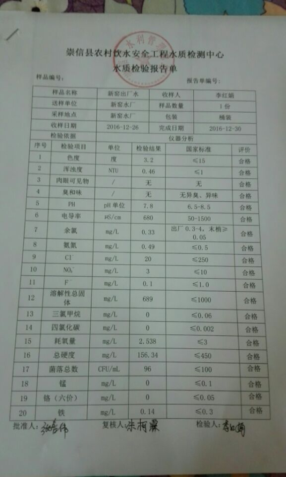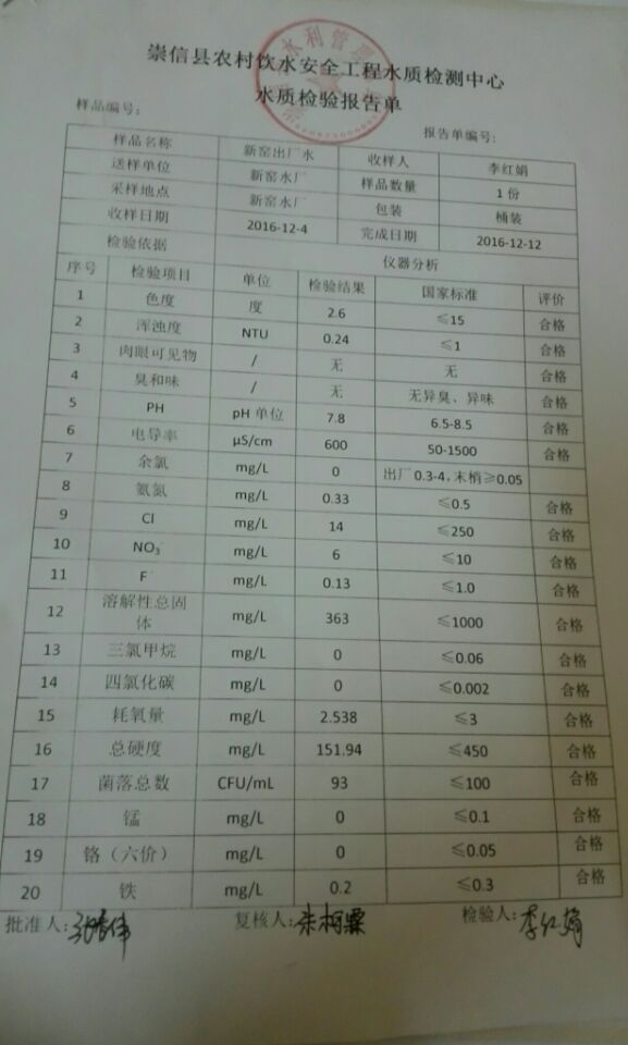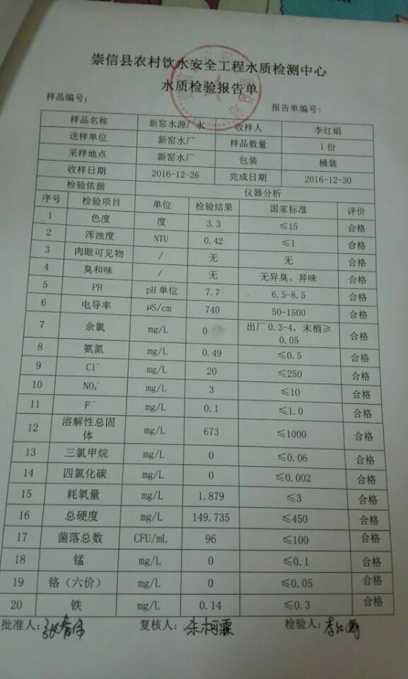新窑水厂12月份水质检测报告单