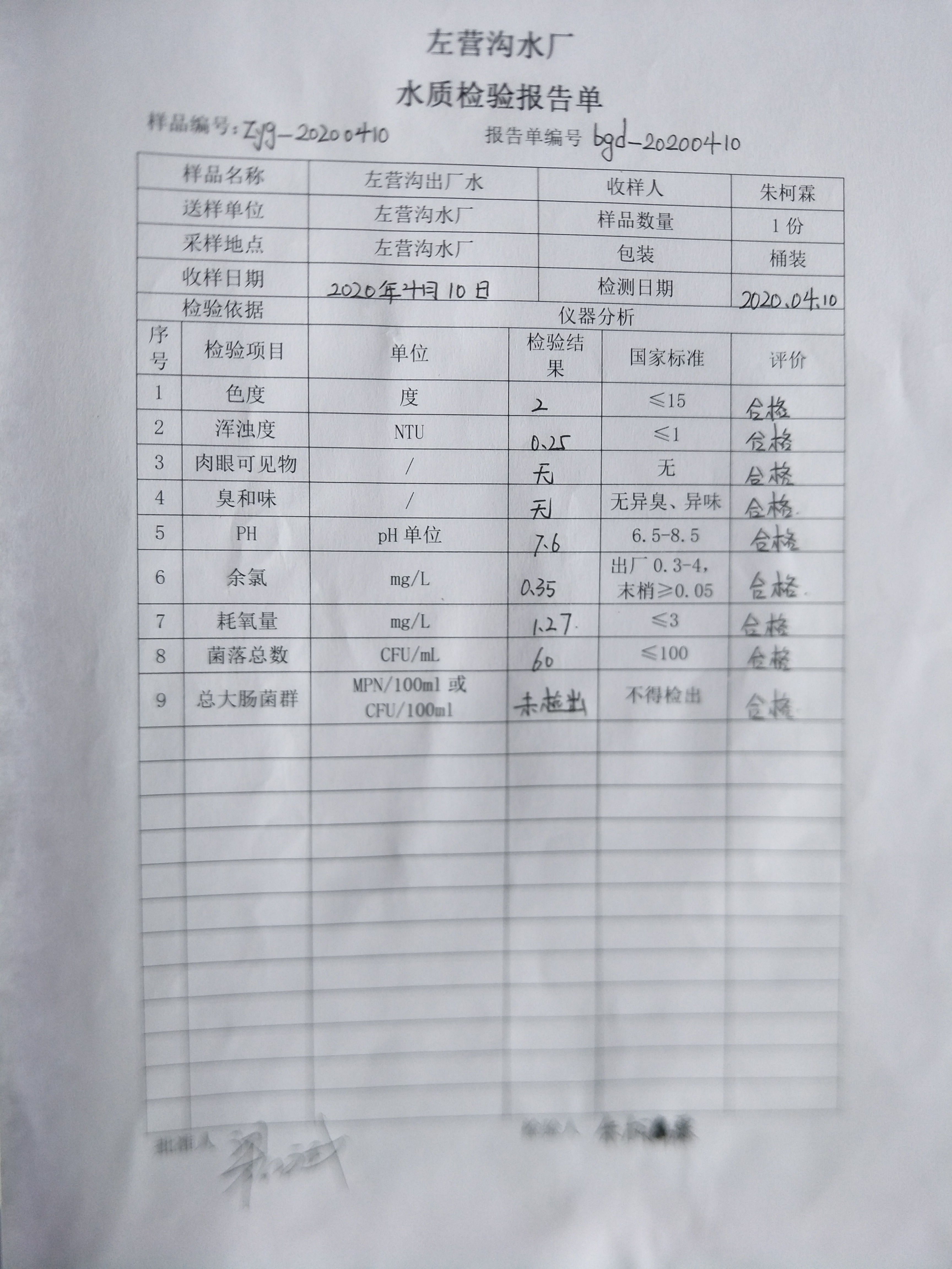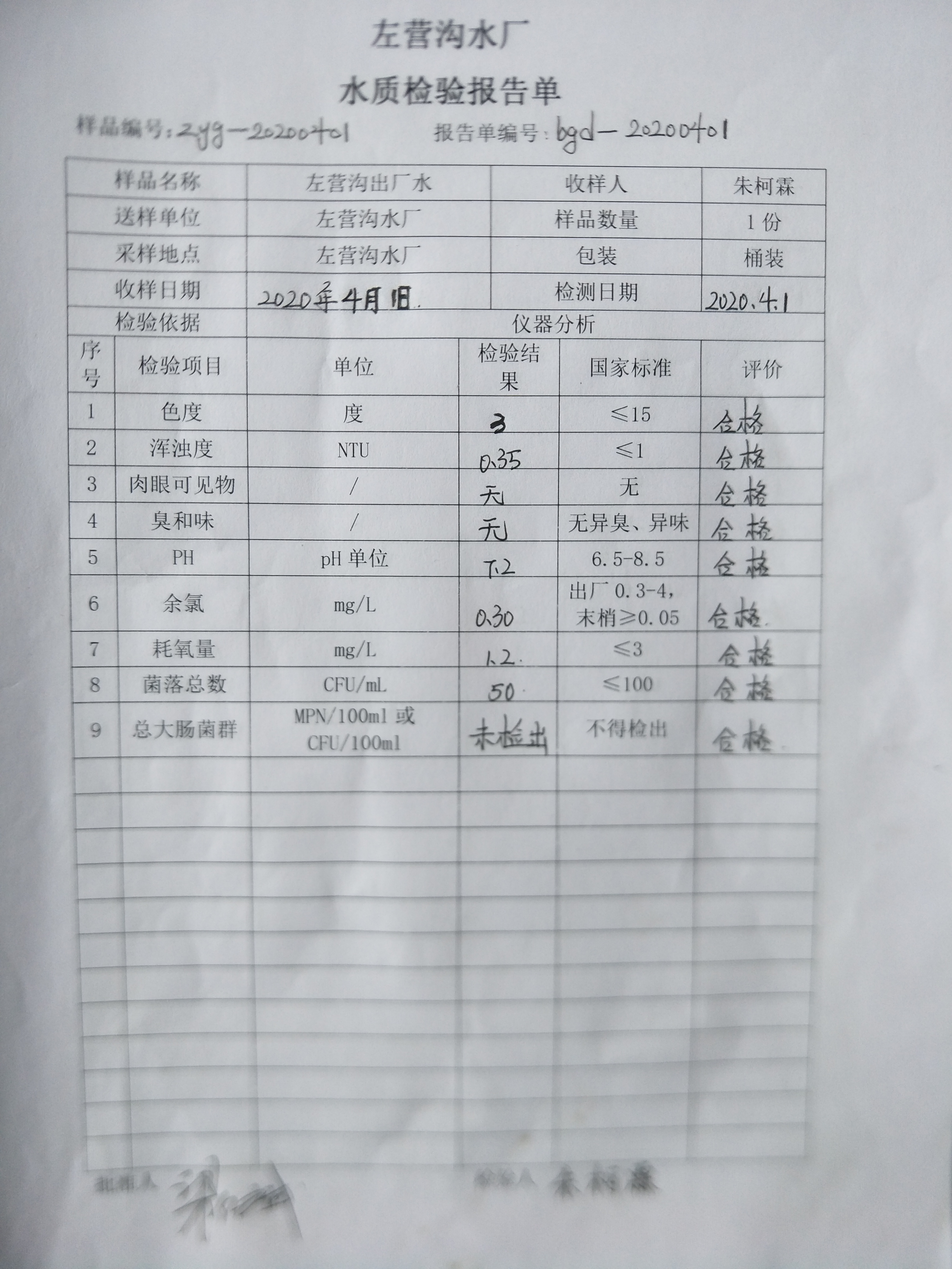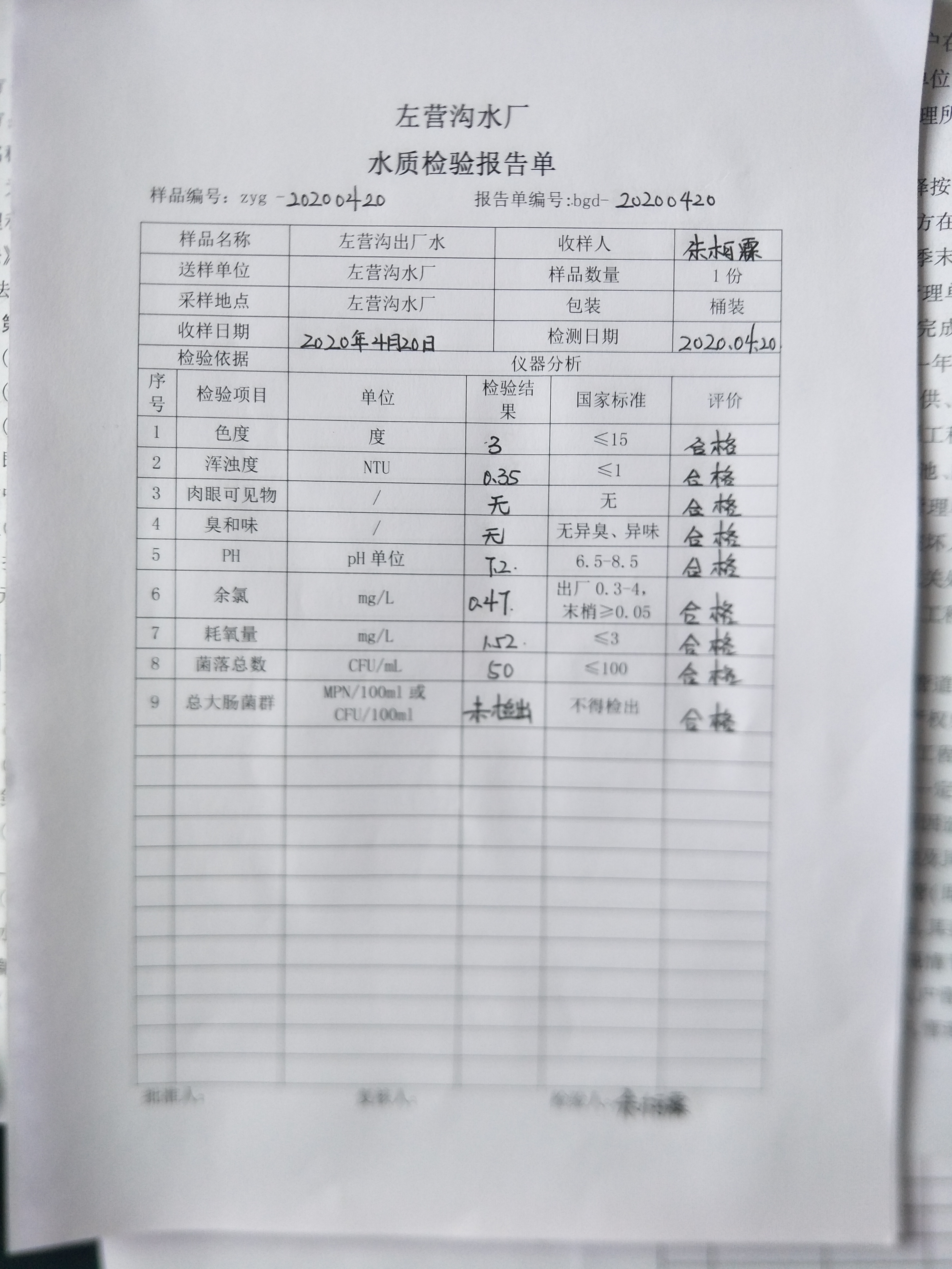 2020年左营沟水厂4月份水质检验报告单 发文日期:2020-04-24 00:00 来源:崇信县水务局 作者:崇信水务局 编辑:崇信水务局 IMG20200424085636 IMG20200424085713 IMG20200424085801 扫一扫在手机打开当前页 上一篇: 2020年3月份左营沟水厂日检报告单 下一篇: 2020年2月份水质化验报告单