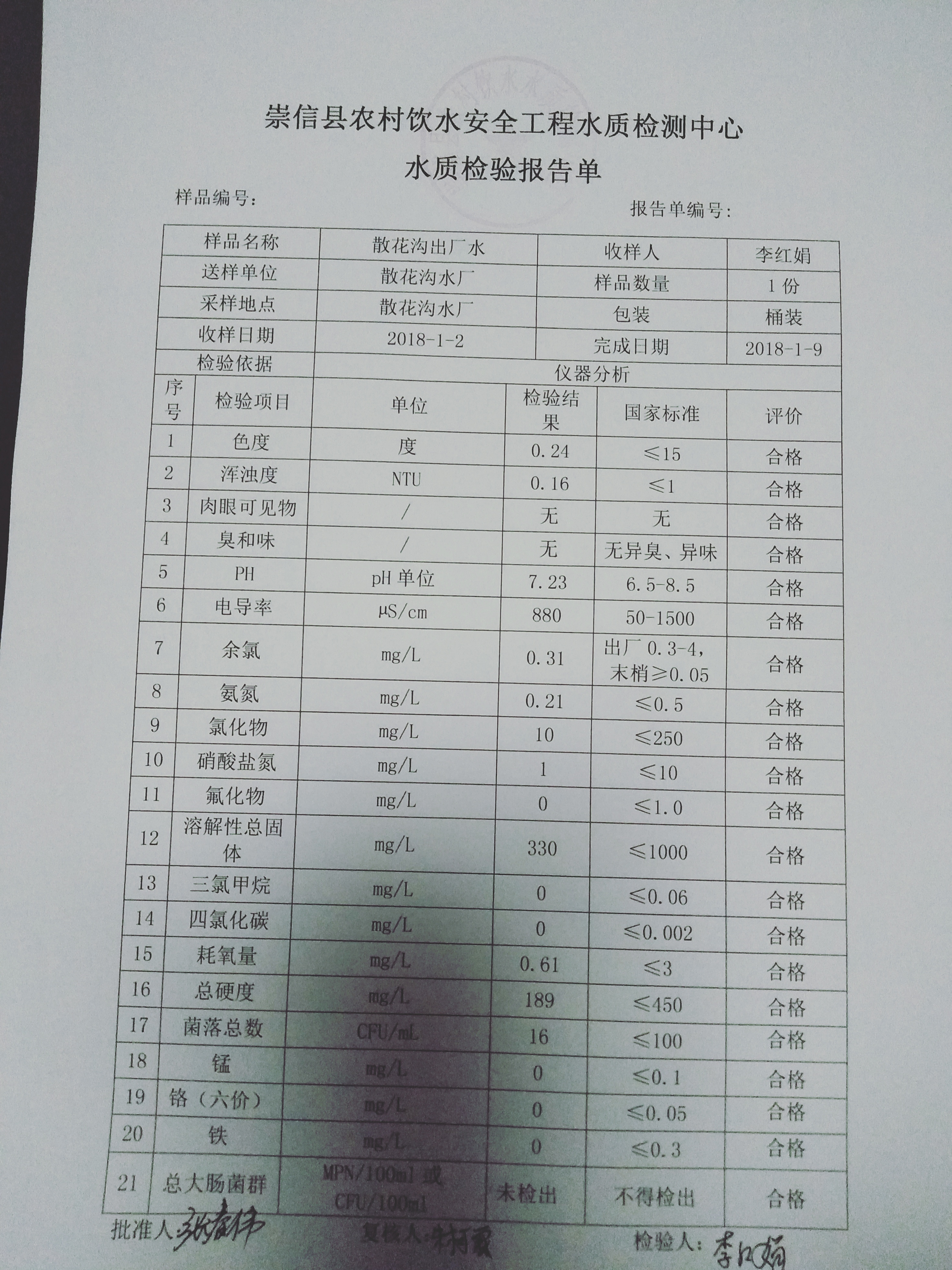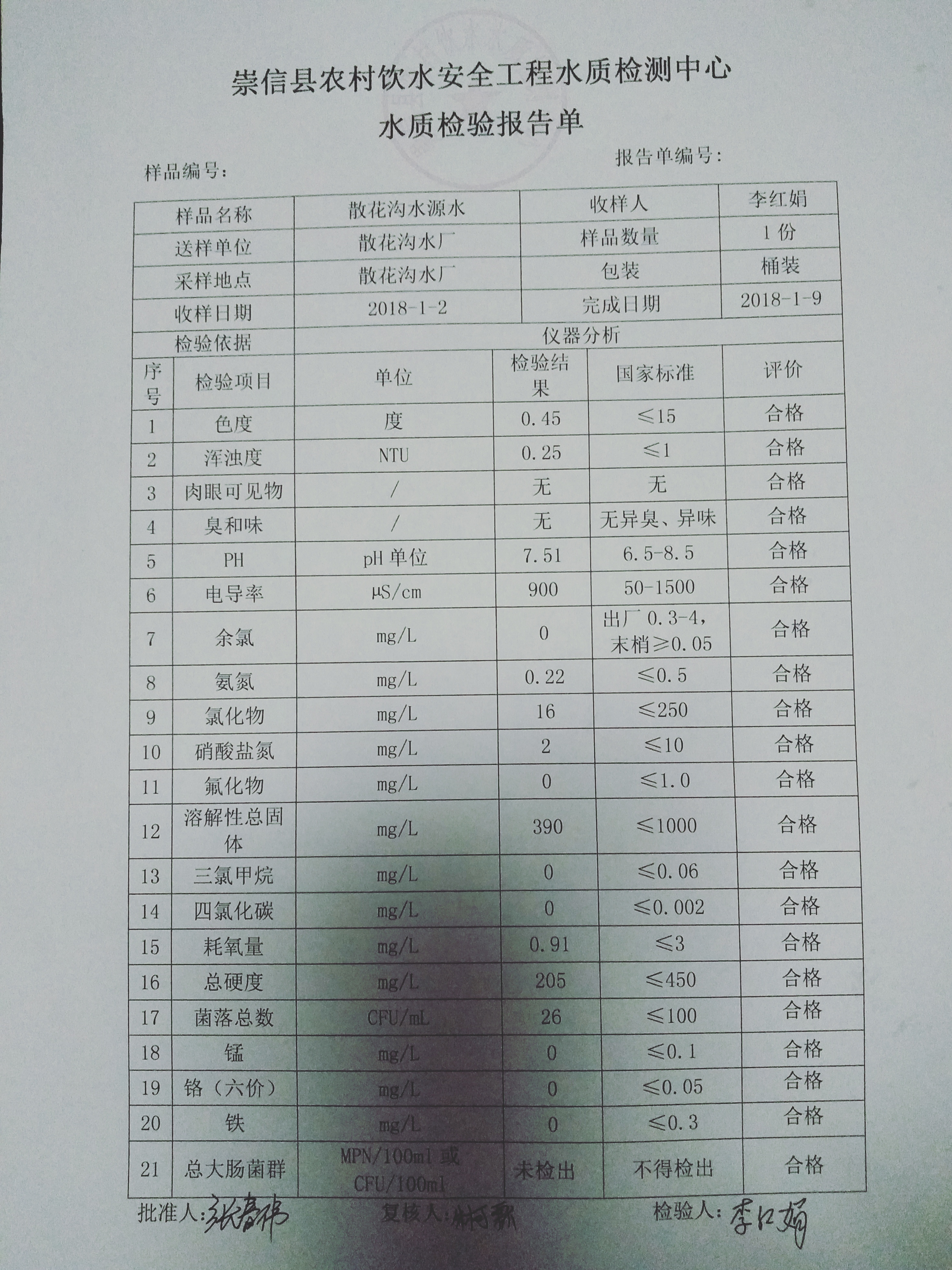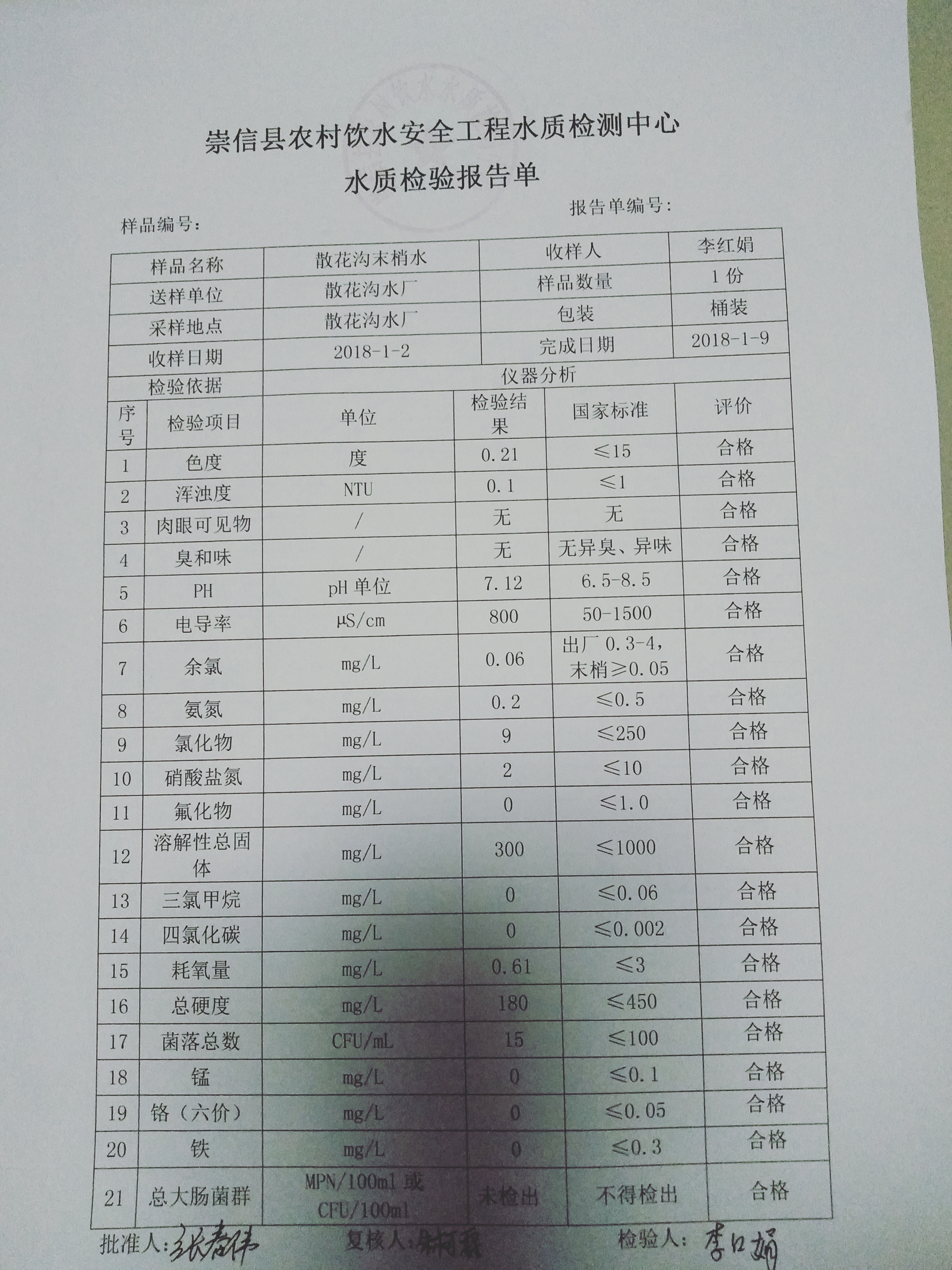 2018年1月份散花沟水厂水质检测报告单 发文日期:2018-01-30 00:00 来源:崇信县水务局 作者:崇信水务局 编辑:星云科技 IMG20180130222657 IMG20180130222704 IMG20180130222712 扫一扫在手机打开当前页 上一篇: 2017年11月杜家沟水厂水质检测报告单 下一篇: 12月水质化验报告单