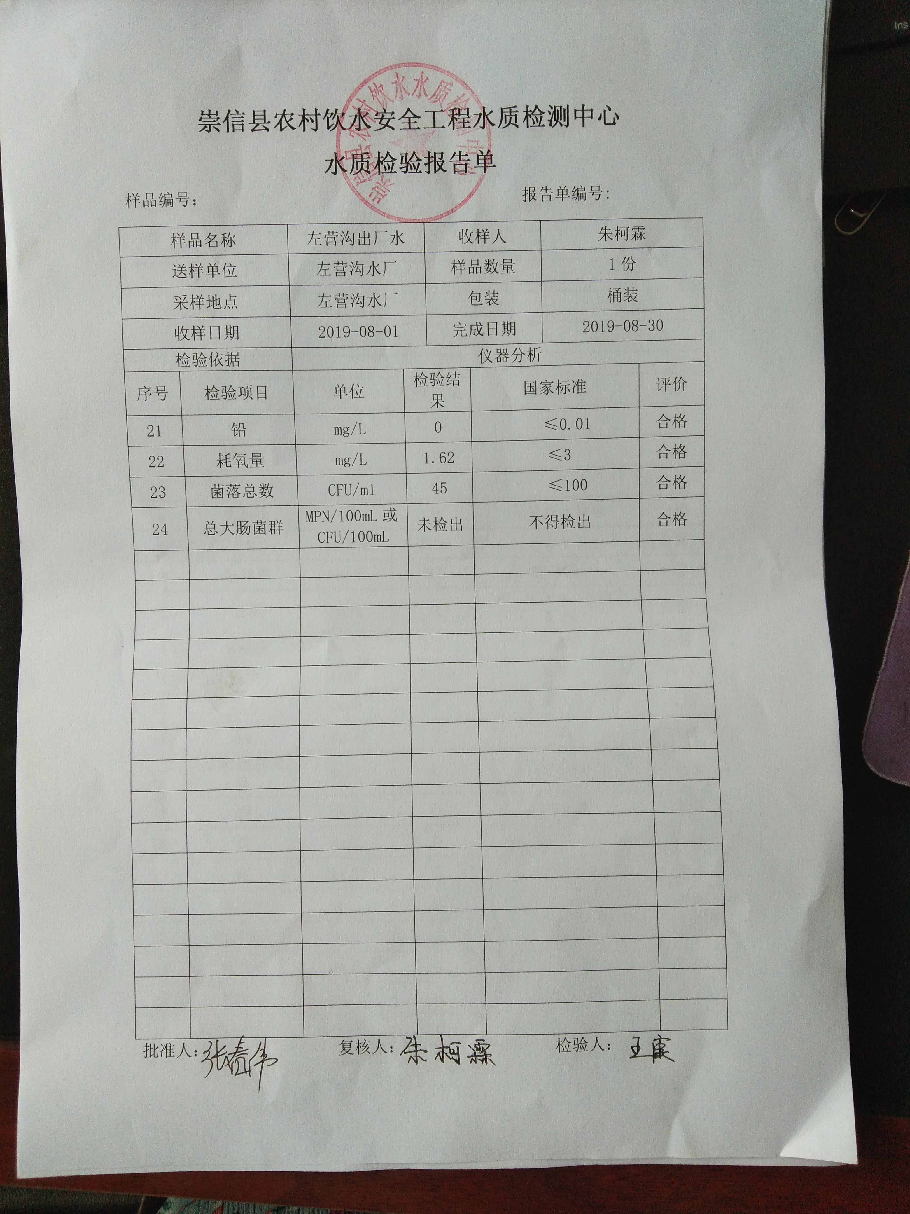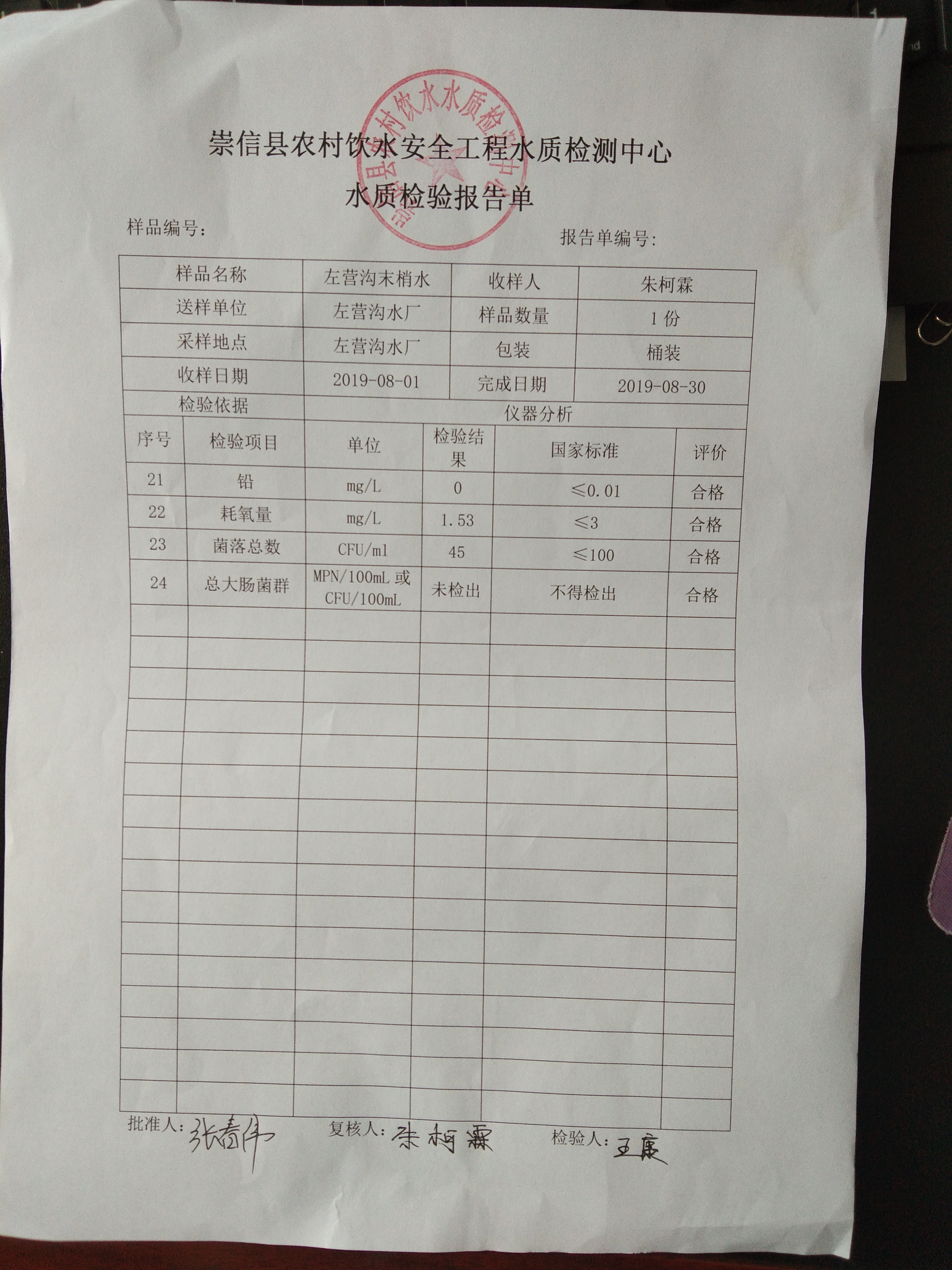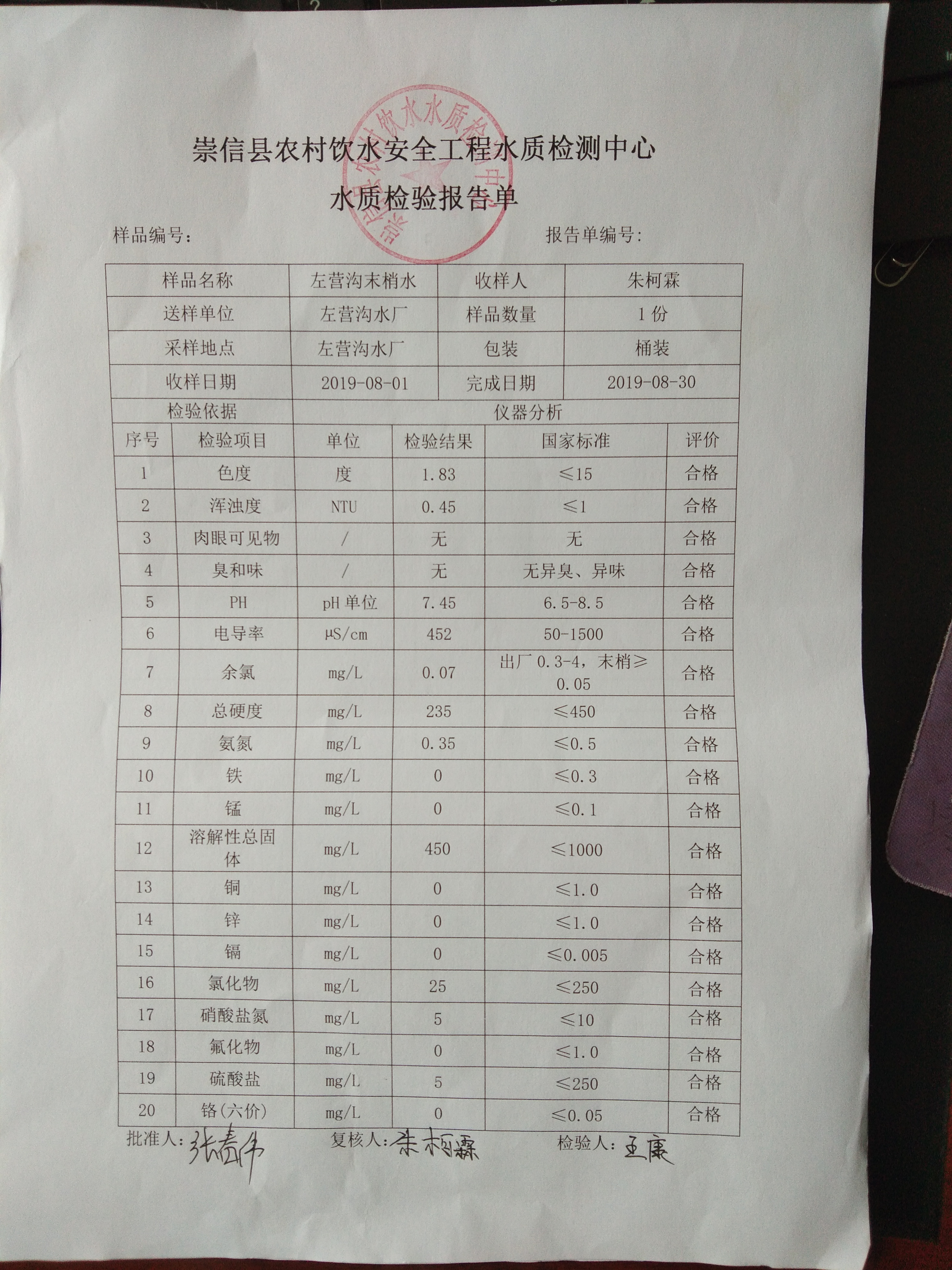 2019年8月份左营沟水厂水质检测报告单 发文日期:2019-09-05 00:00 来源:崇信县水务局 作者:崇信水务局 编辑:崇信水务局 IMG_20190905_150220 IMG_20190905_150227 IMG_20190905_150233 IMG_20190905_150243 IMG_20190905_150255 IMG_20190905_150302 扫一扫在手机打开当前页 上一篇: 2019年8月份散花沟水厂水质检测报告单 下一篇: 2019年8月份杜家沟水厂水质检测报告单