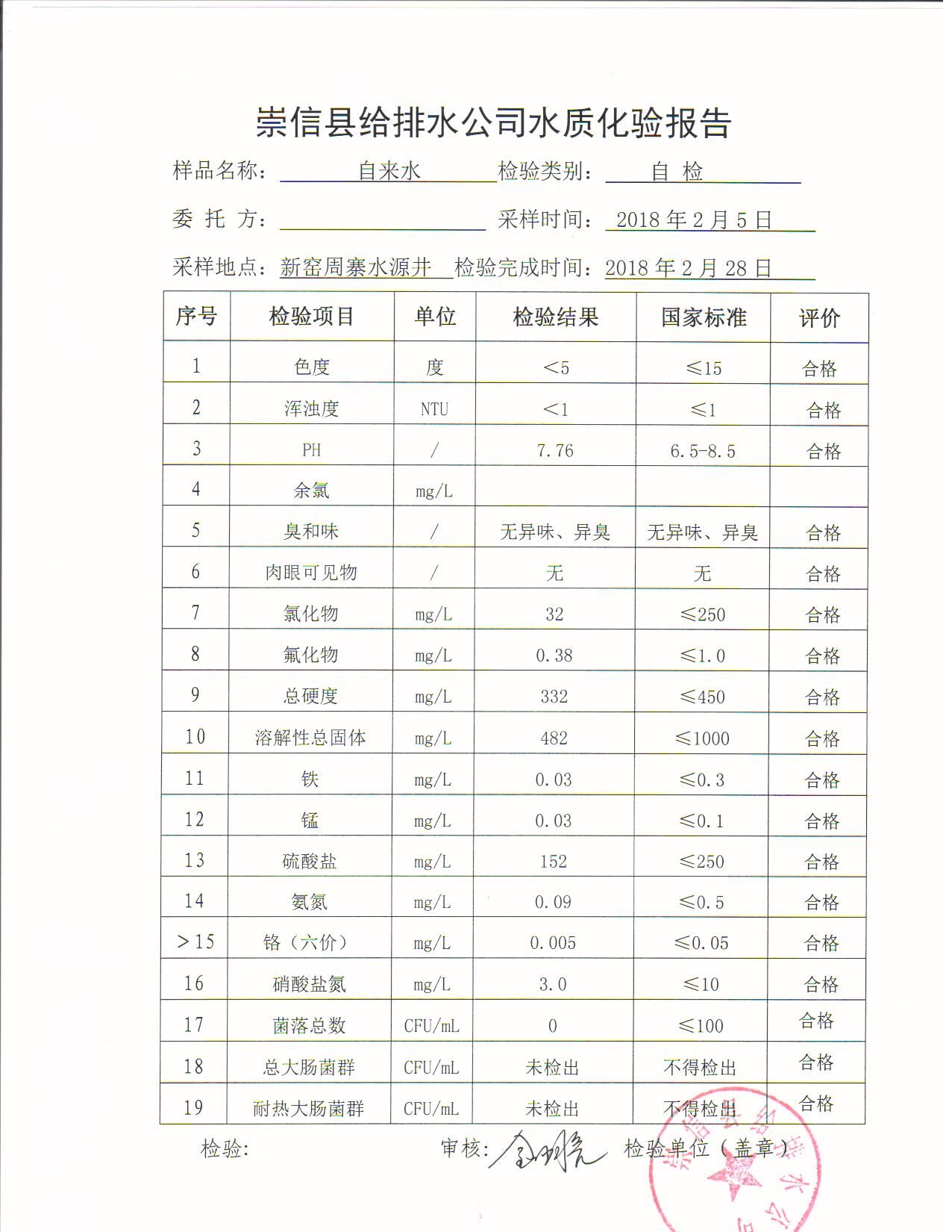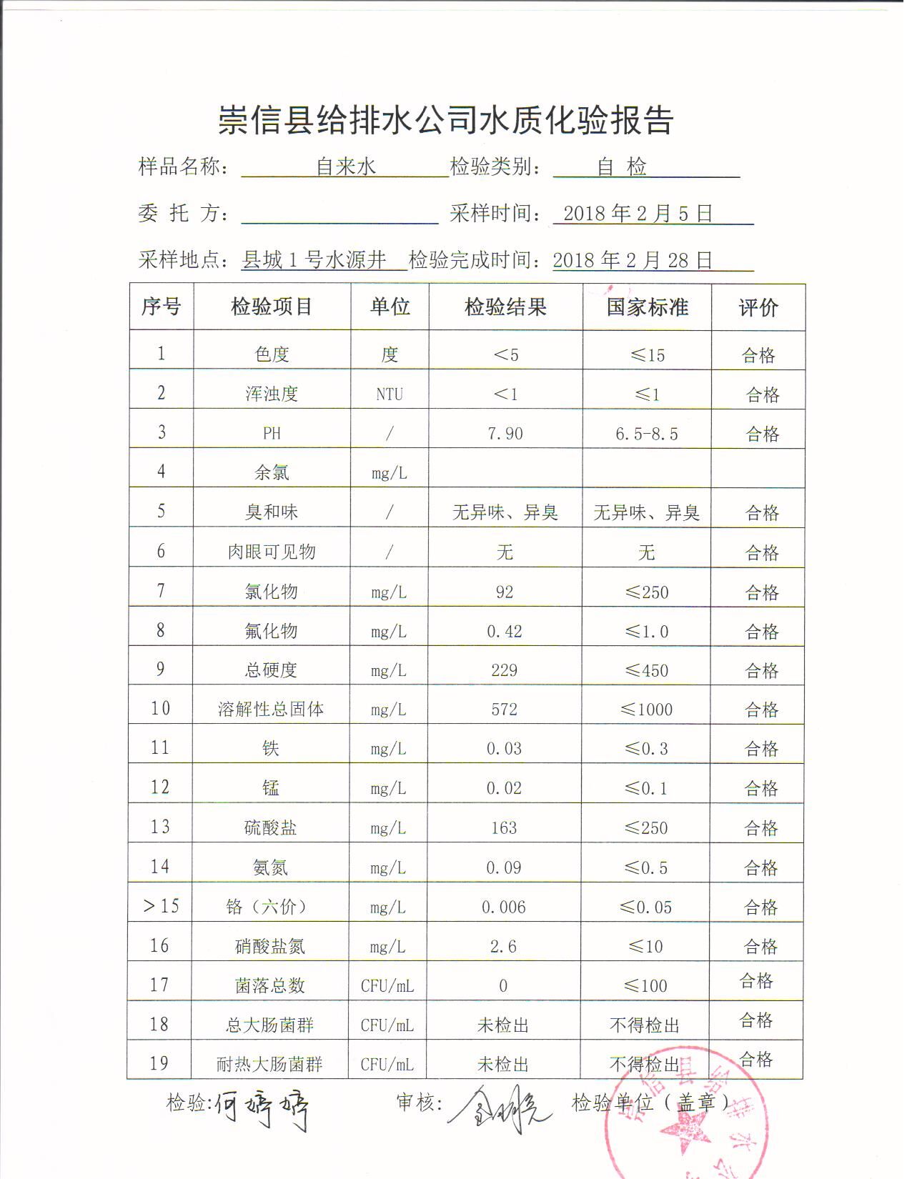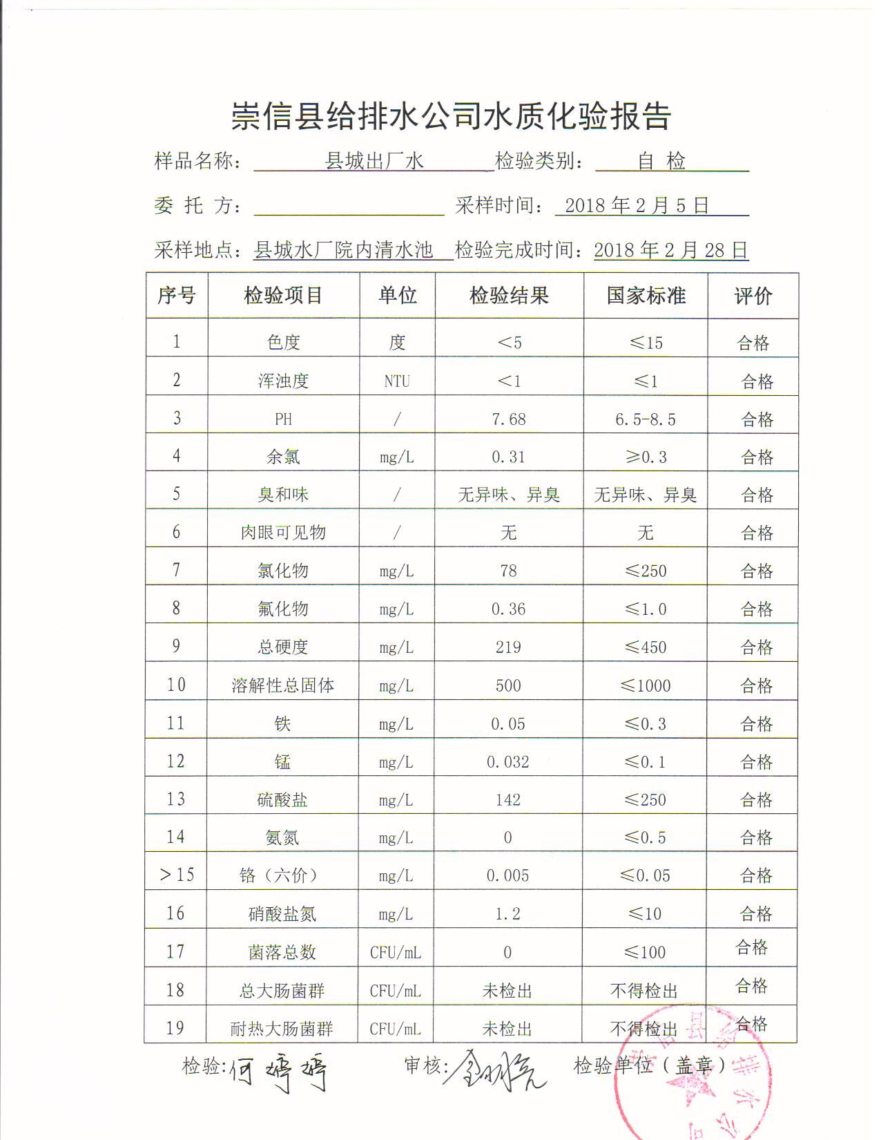 2018年2月份水质化验报告 发文日期:2018-03-02 09:46 来源:崇信县住房和城乡建设局 作者:崇信住建局 编辑:崇信住建局 水质化验报告(县城1号水源井) 水质化验报告(县城水厂院内清水池) 水质化验报告(县城一建公司商住楼) 水质化验报告(新窑街道农户院内) 水质化验报告(新窑水厂院内清水池) 水质化验报告(新窑周寨水源井) 扫一扫在手机打开当前页 上一篇: 2018年左营沟水厂2月份水质检测报告单 下一篇: 2018年1月水质化验报告