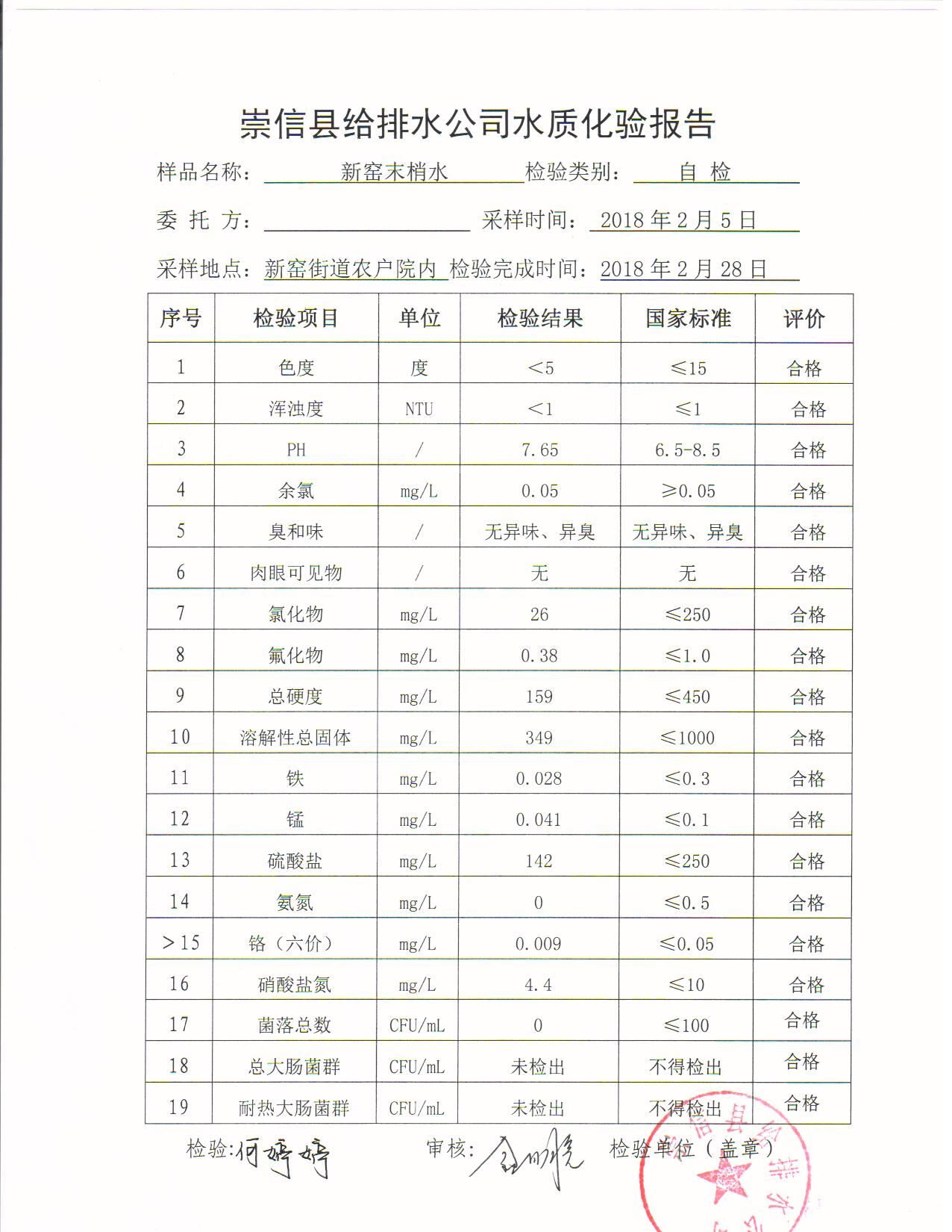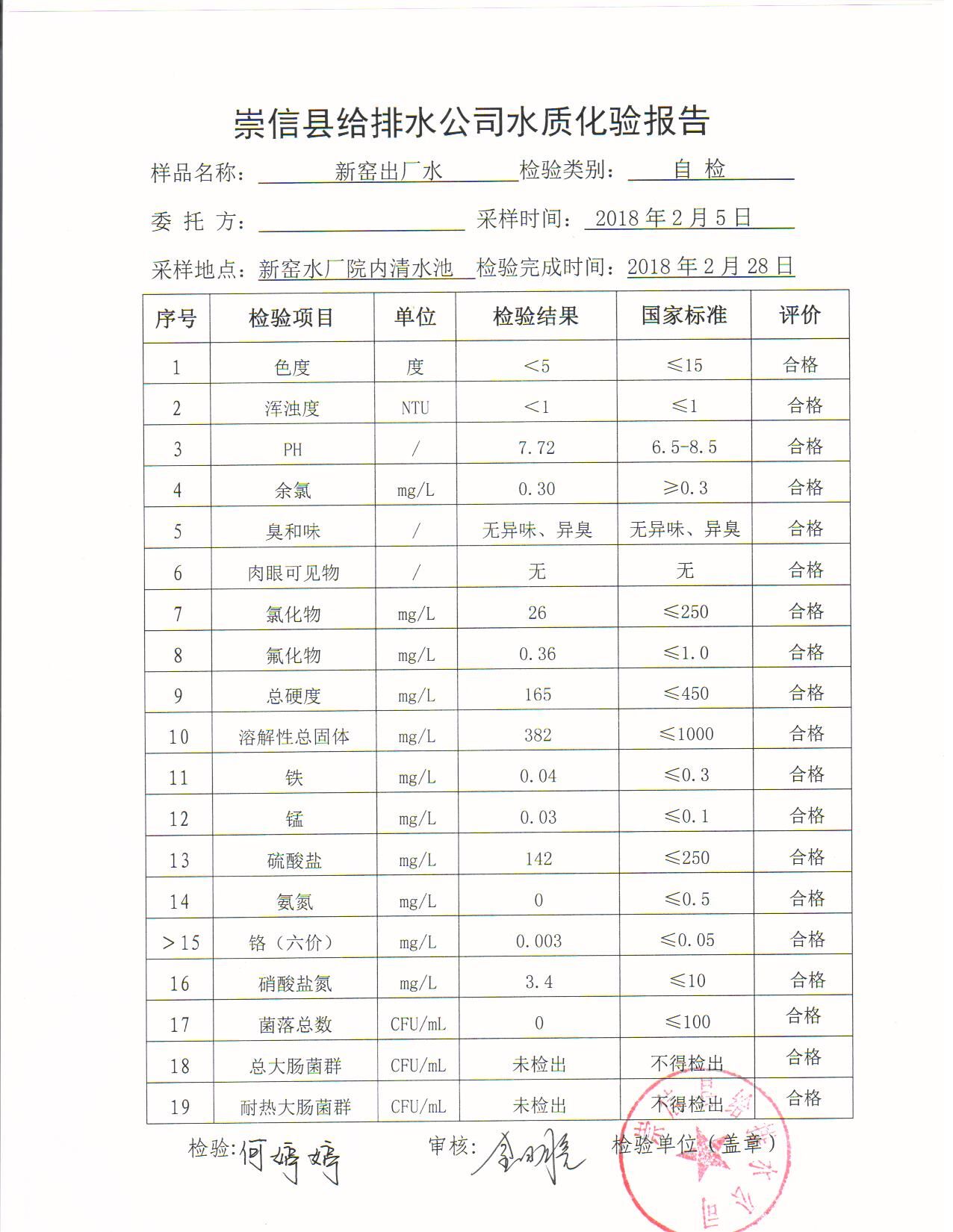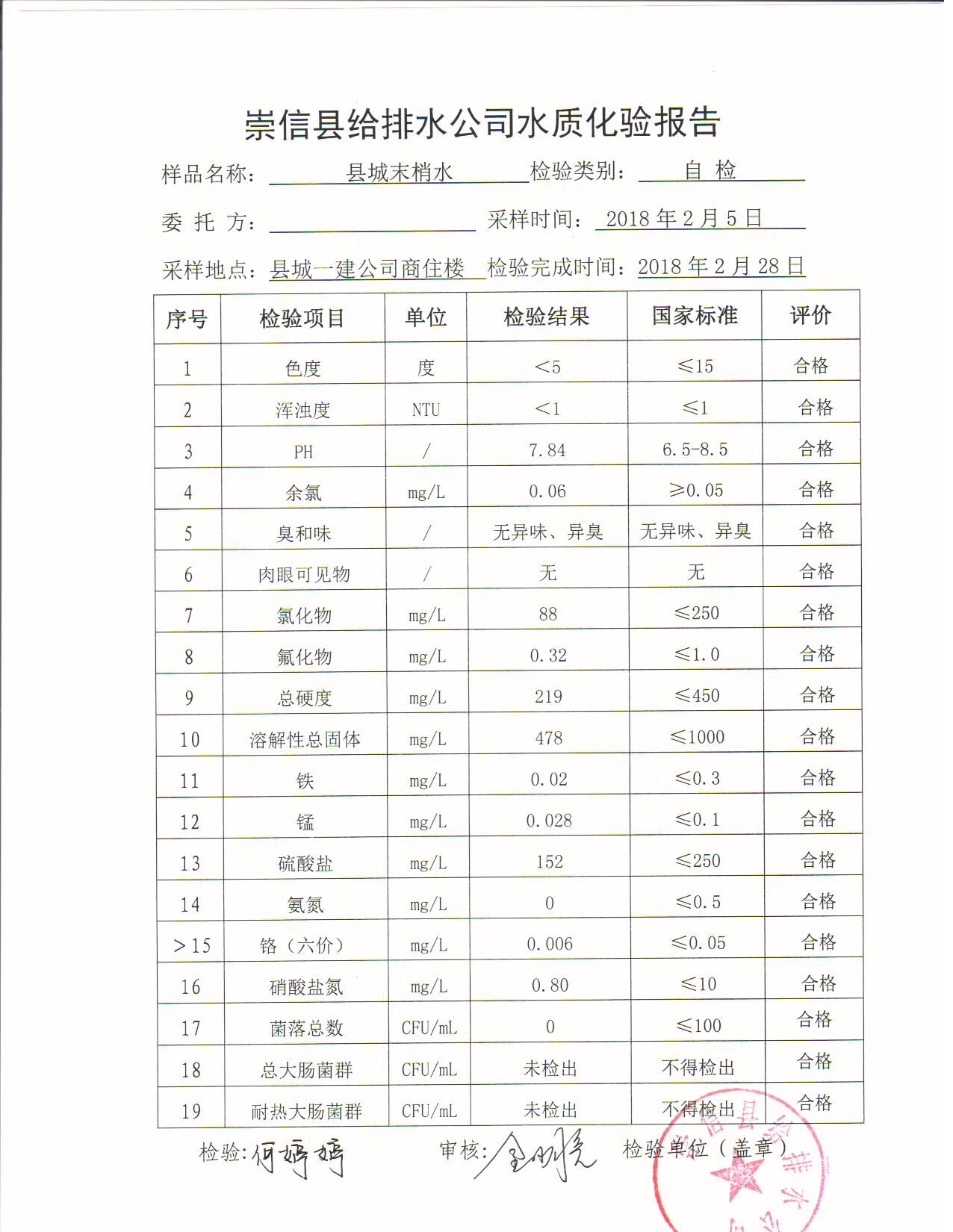 2018年2月份水质化验报告 发文日期:2018-03-02 09:46 来源:崇信县住房和城乡建设局 作者:崇信住建局 编辑:崇信住建局 水质化验报告(县城1号水源井) 水质化验报告(县城水厂院内清水池) 水质化验报告(县城一建公司商住楼) 水质化验报告(新窑街道农户院内) 水质化验报告(新窑水厂院内清水池) 水质化验报告(新窑周寨水源井) 扫一扫在手机打开当前页 上一篇: 2018年左营沟水厂2月份水质检测报告单 下一篇: 2018年1月水质化验报告