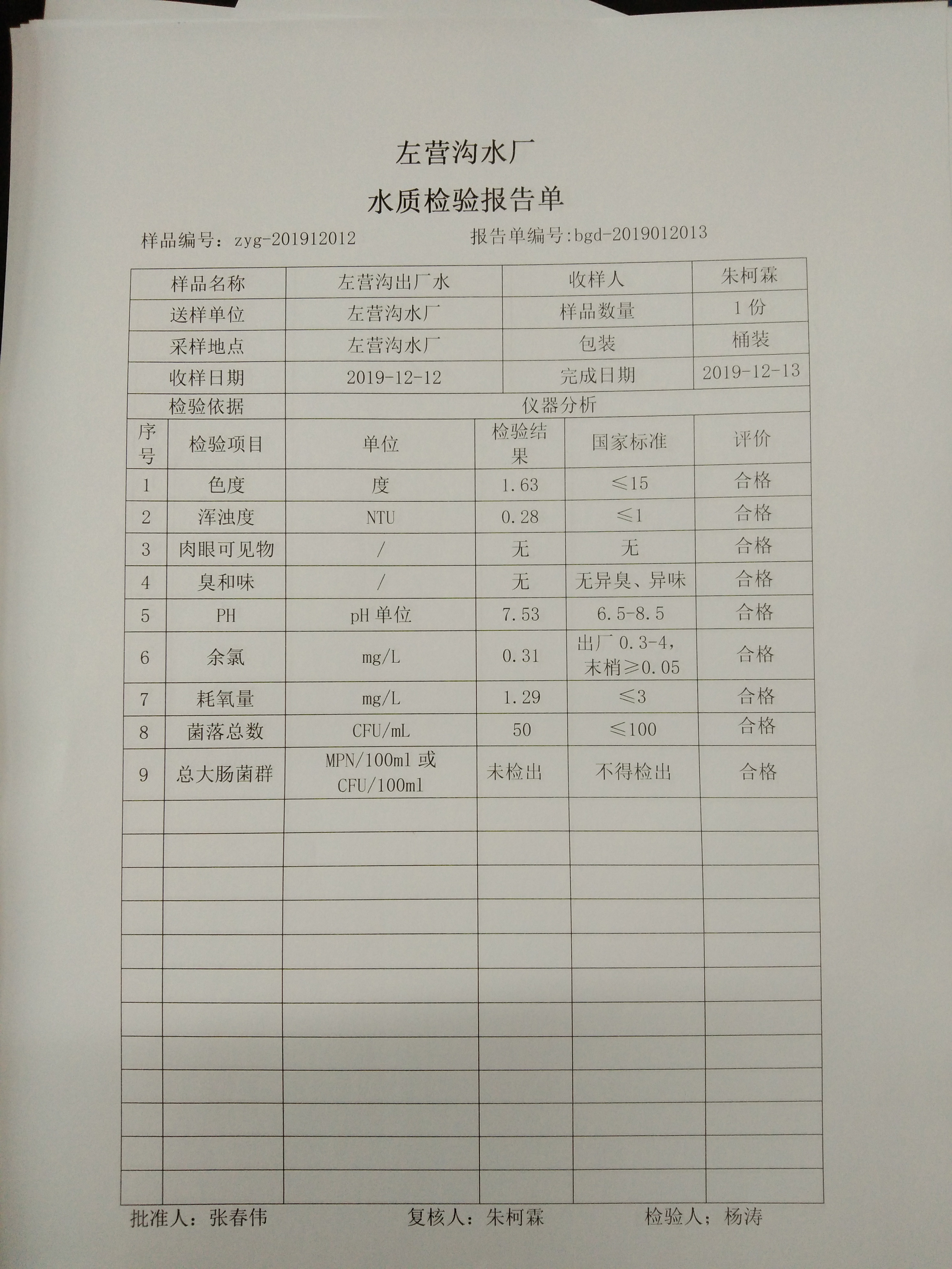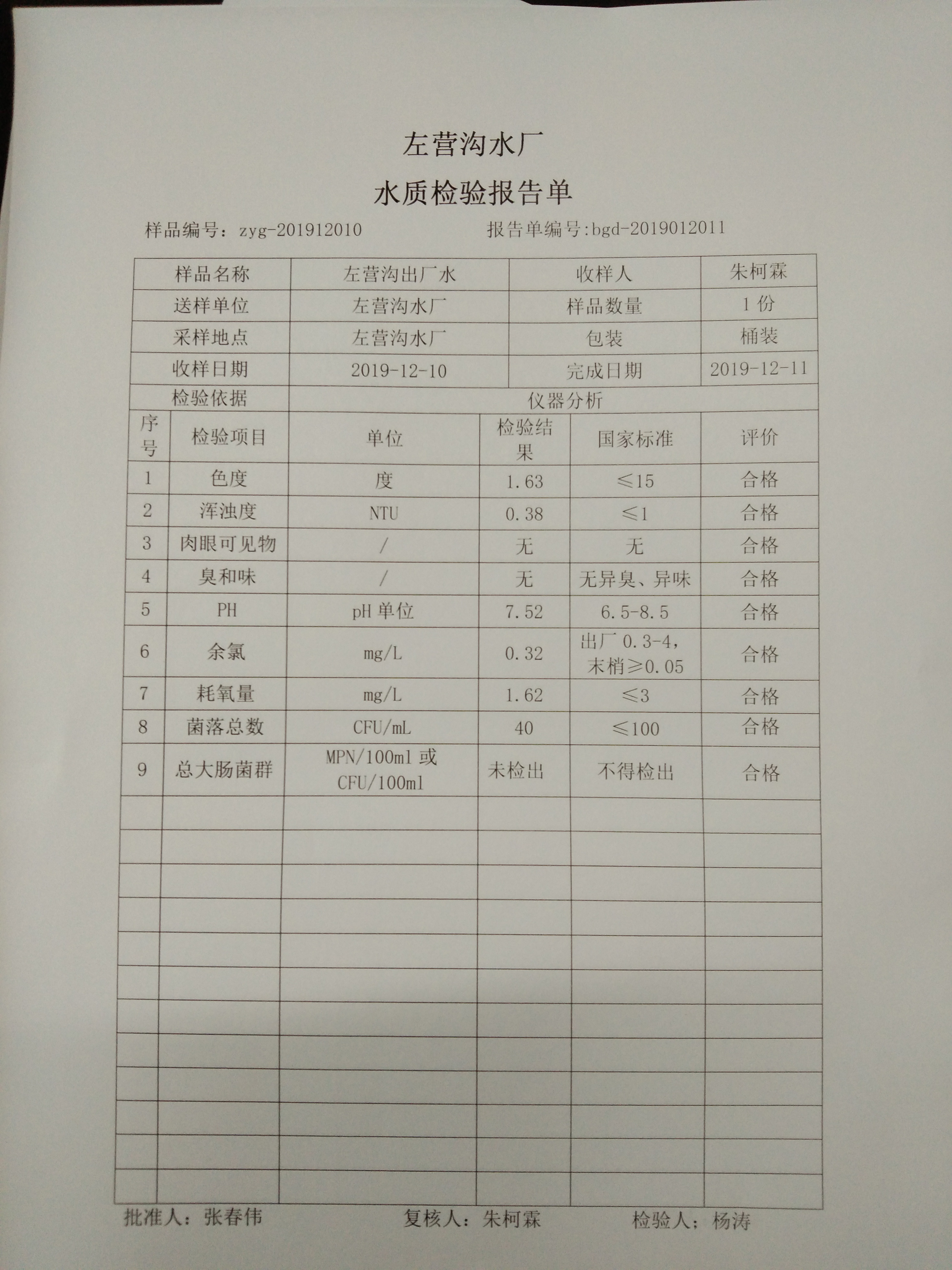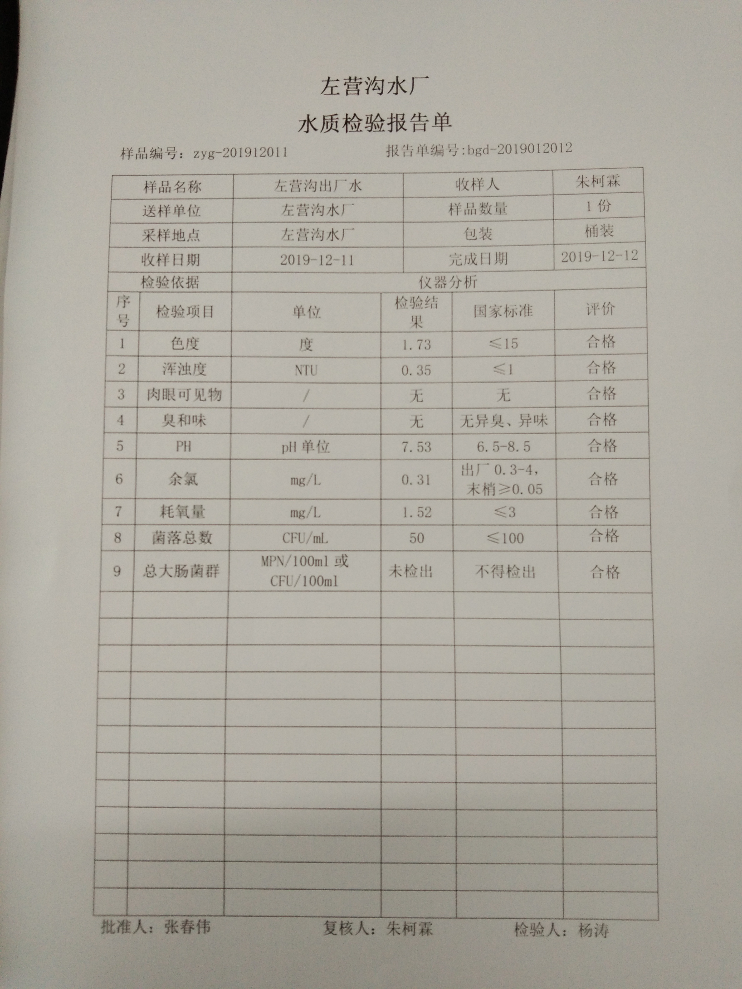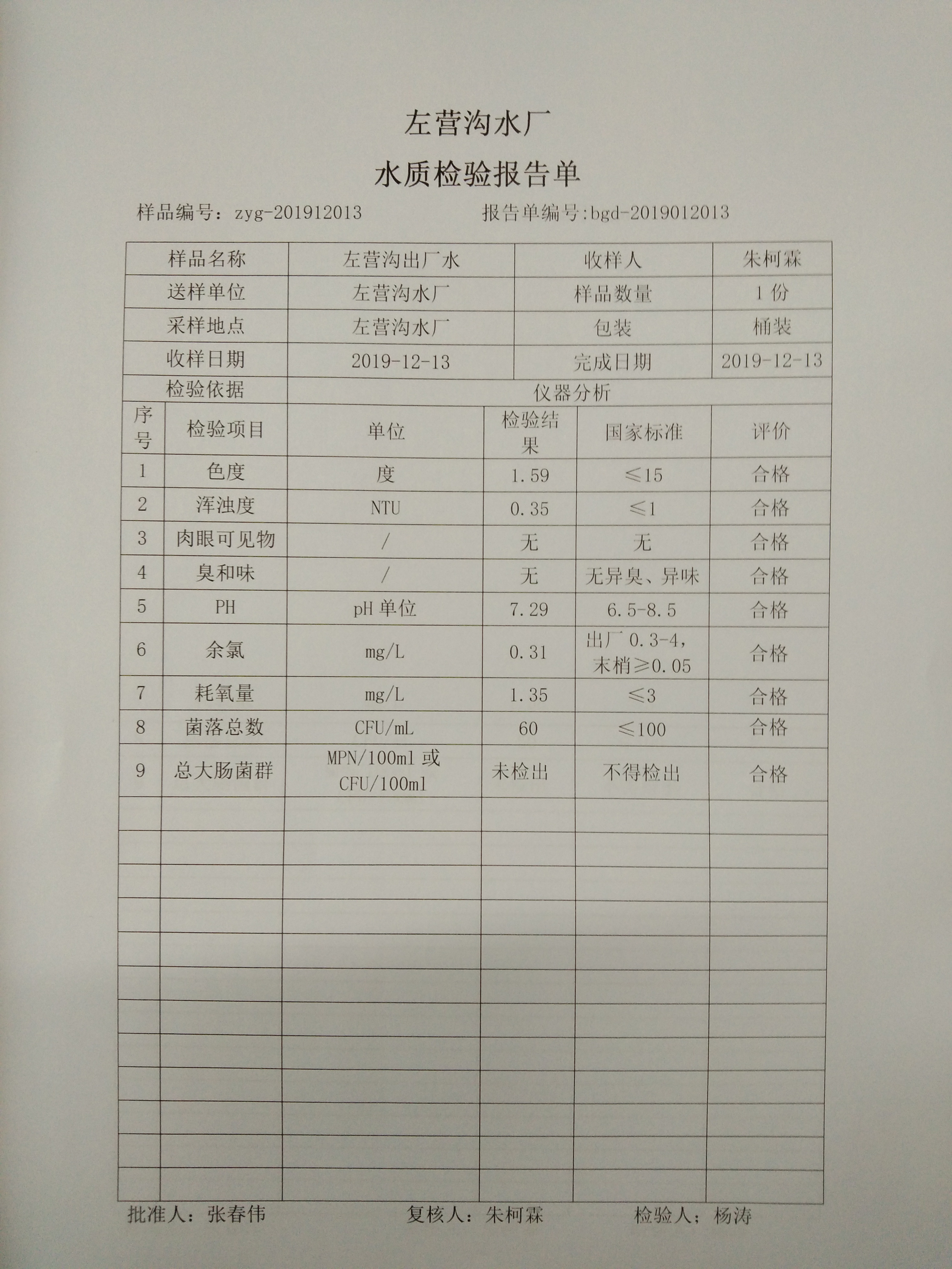 2019年左营沟水厂12月份上半月日检报告单