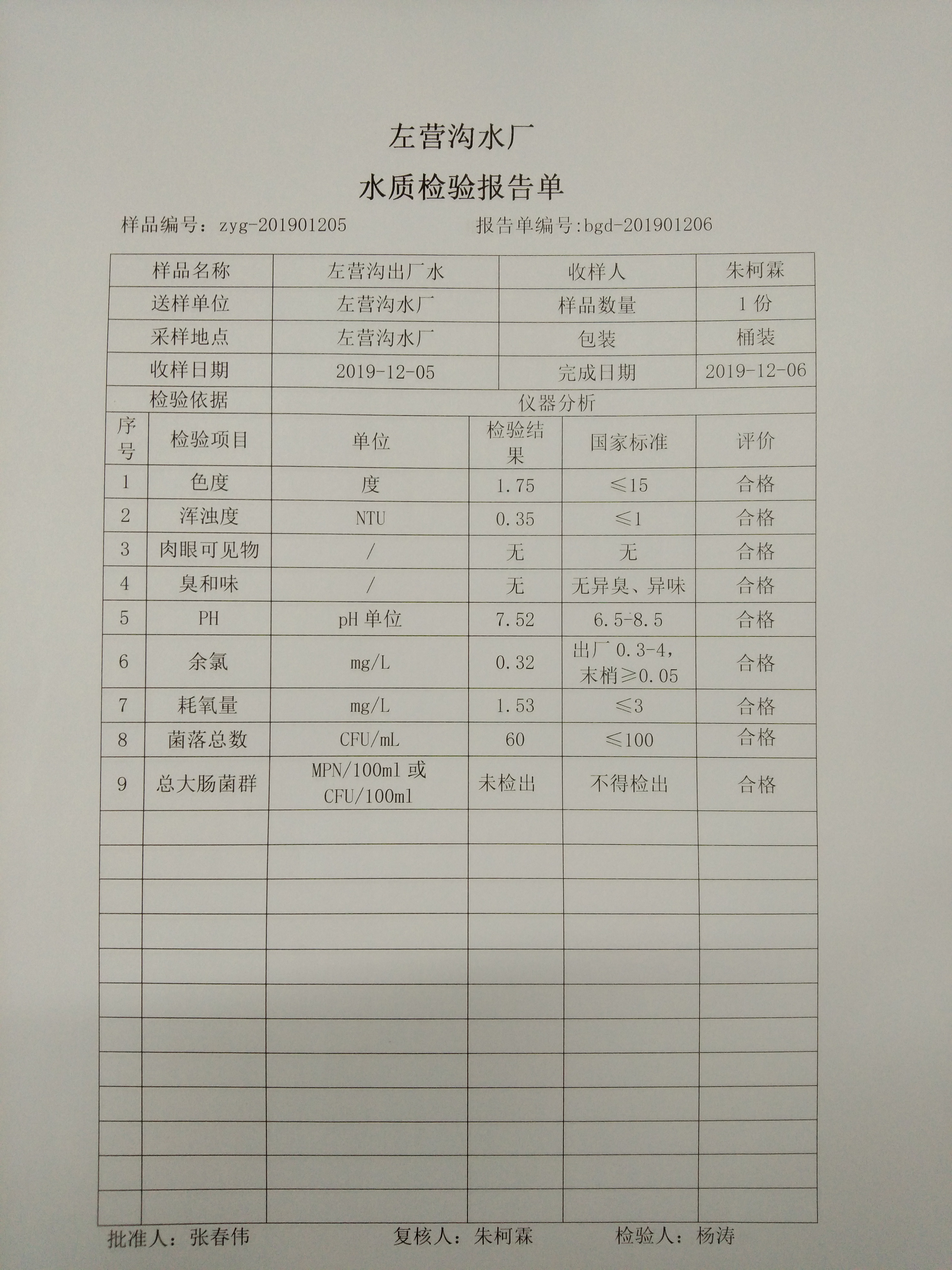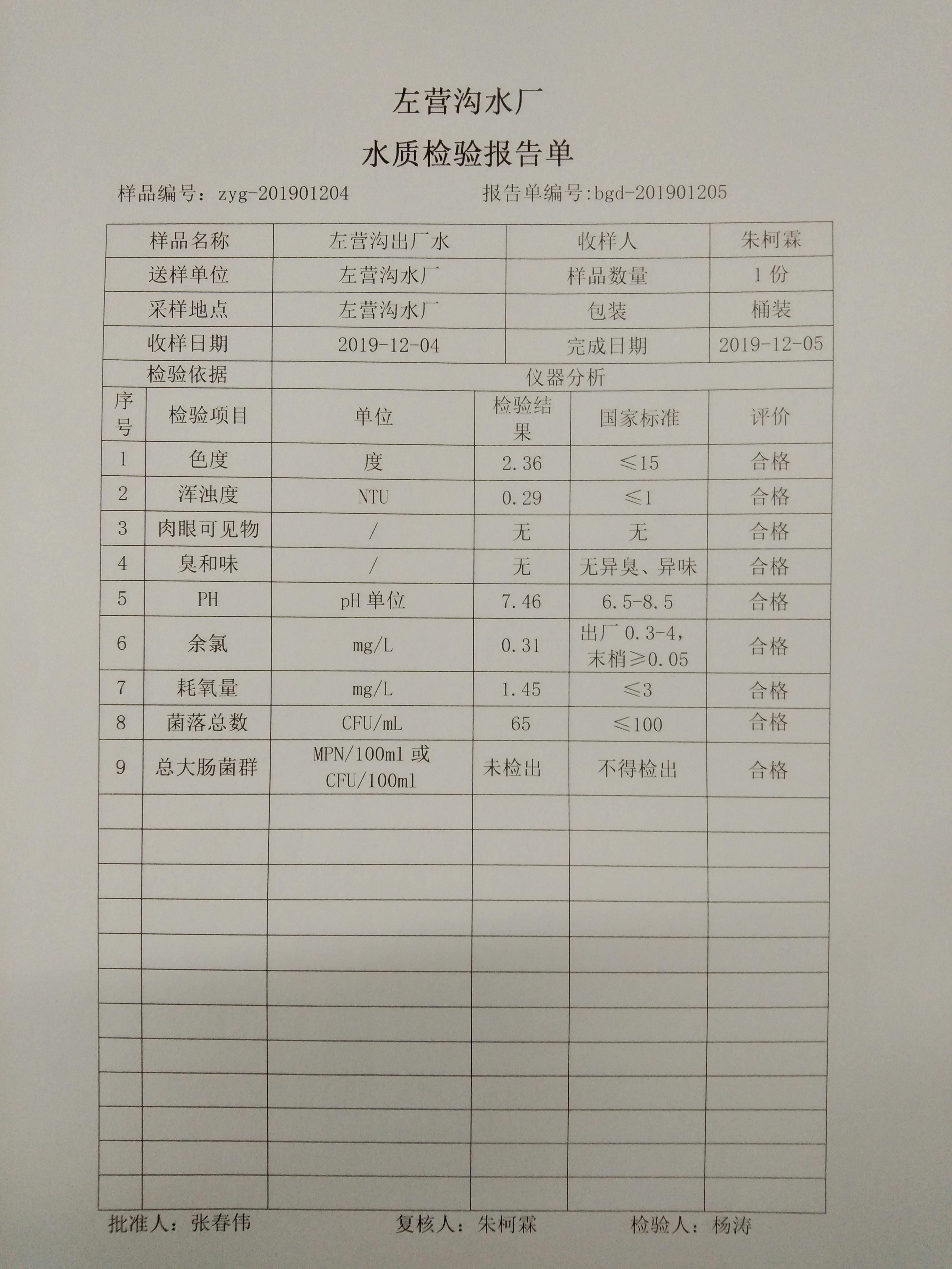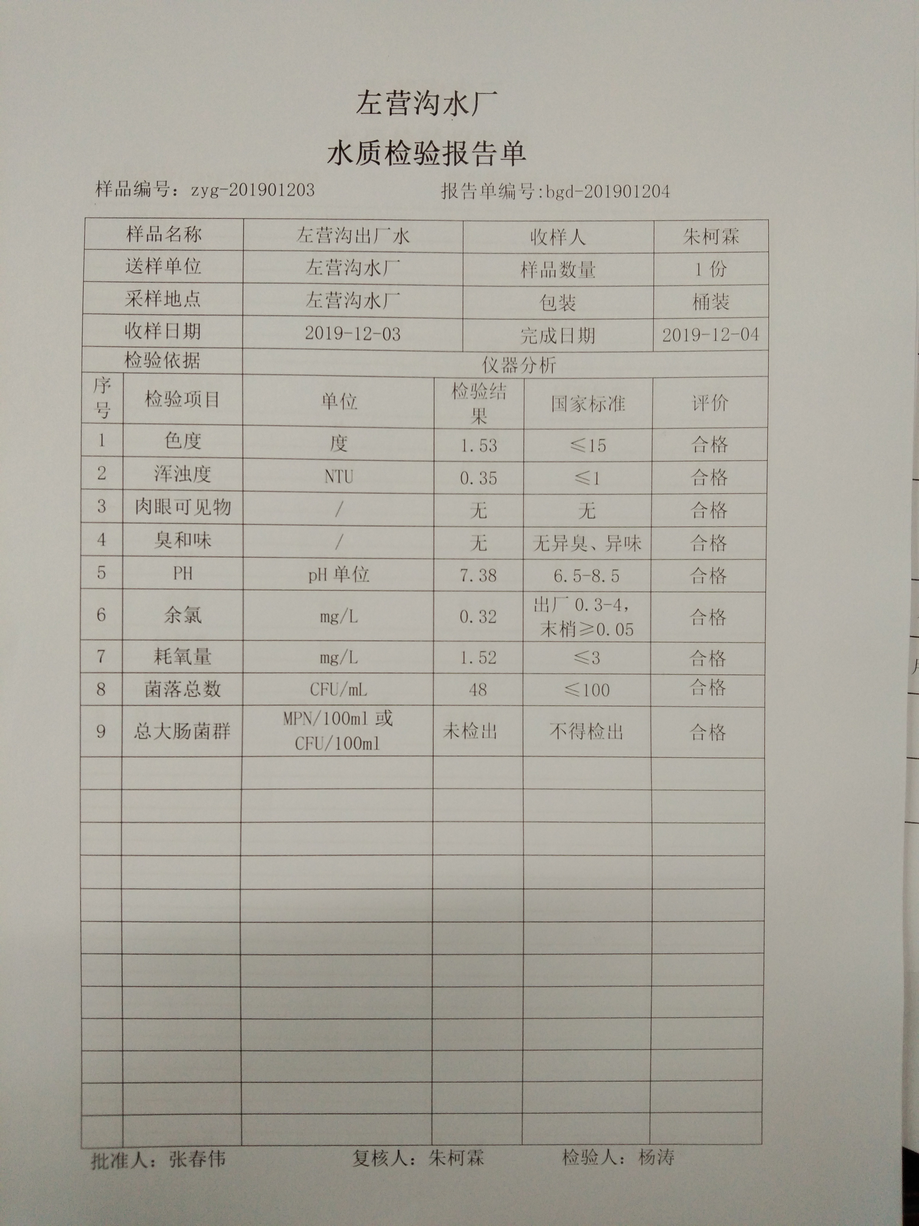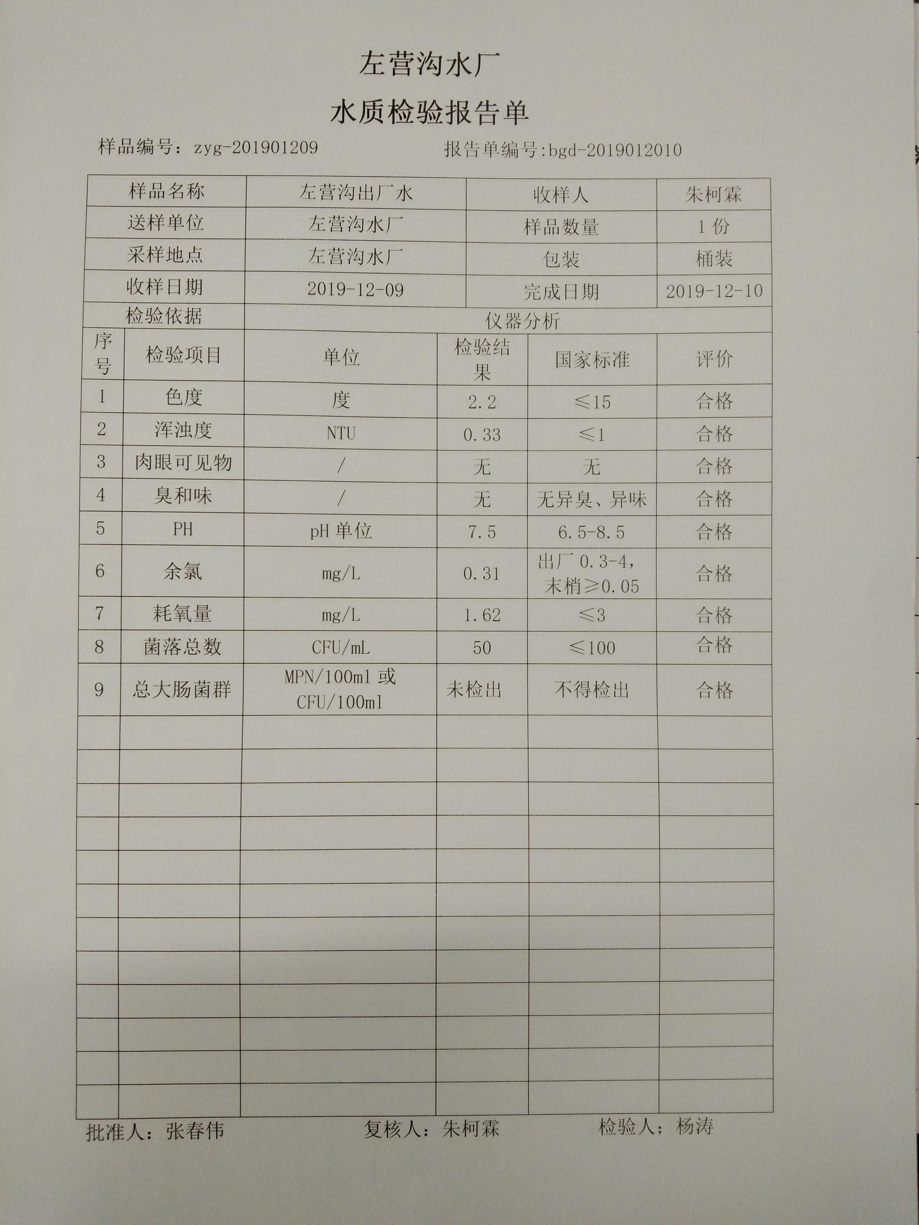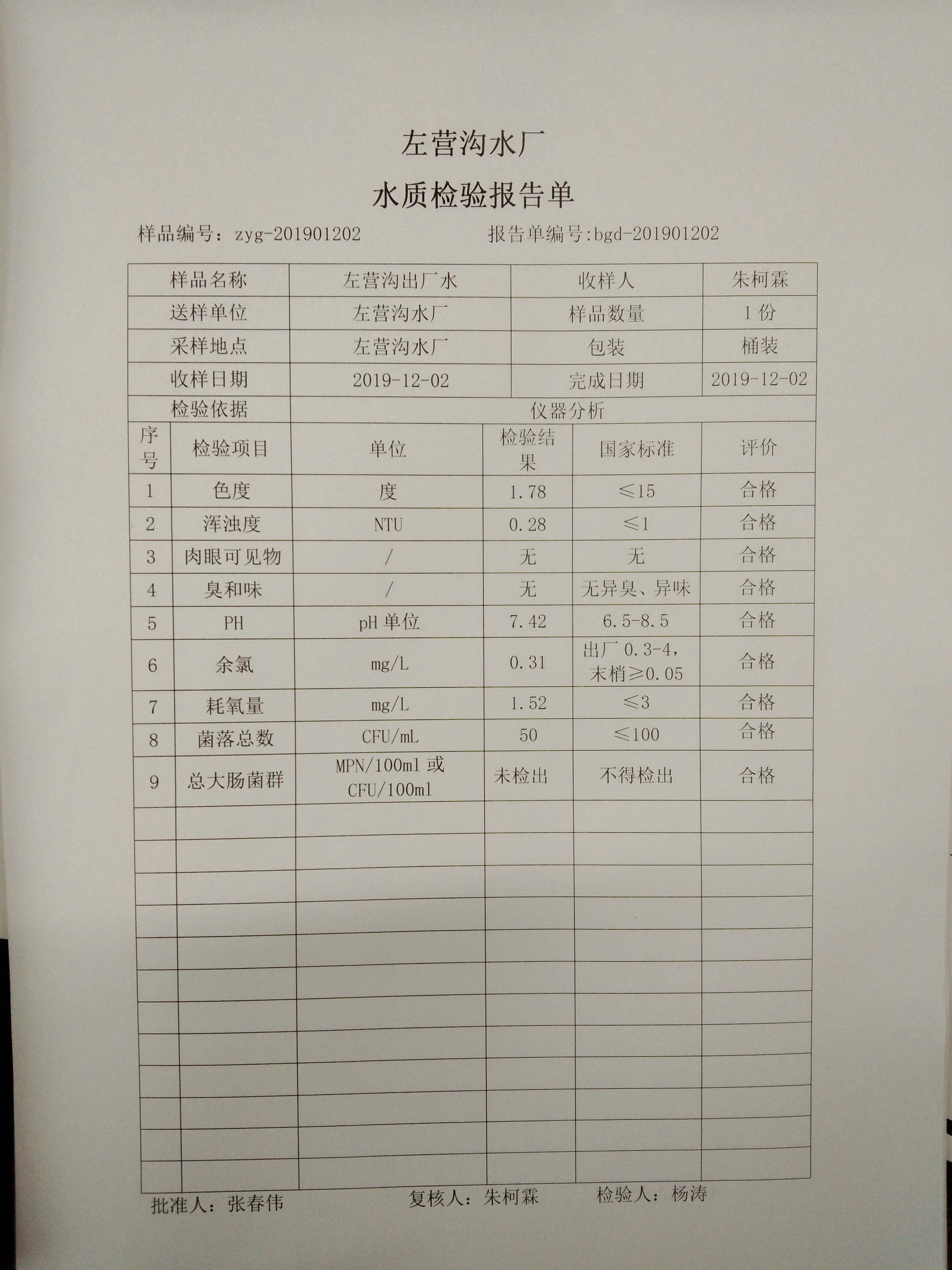 2019年左营沟水厂12月份上半月日检报告单