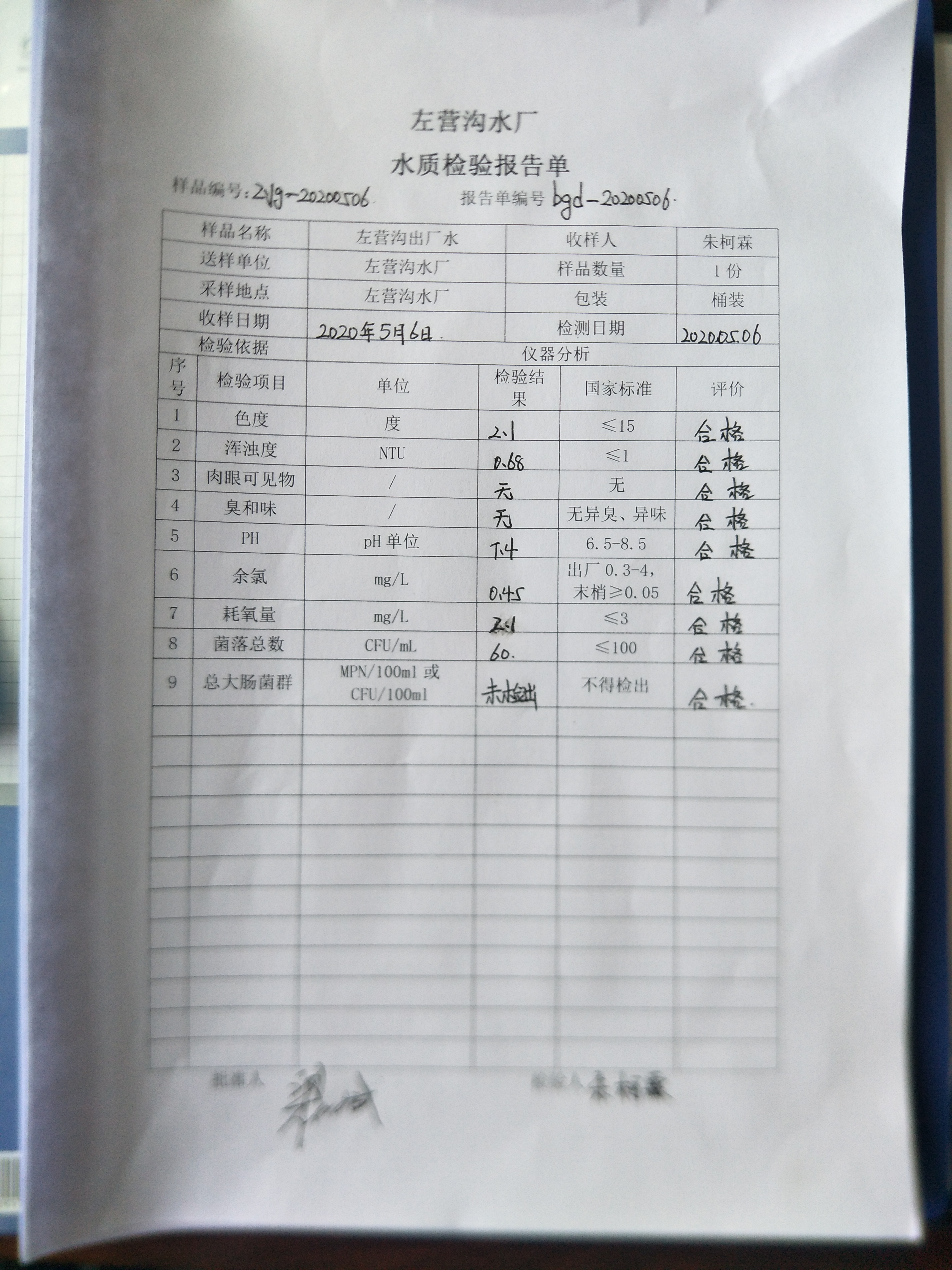2020年5月份左营沟水厂水质检验报告单