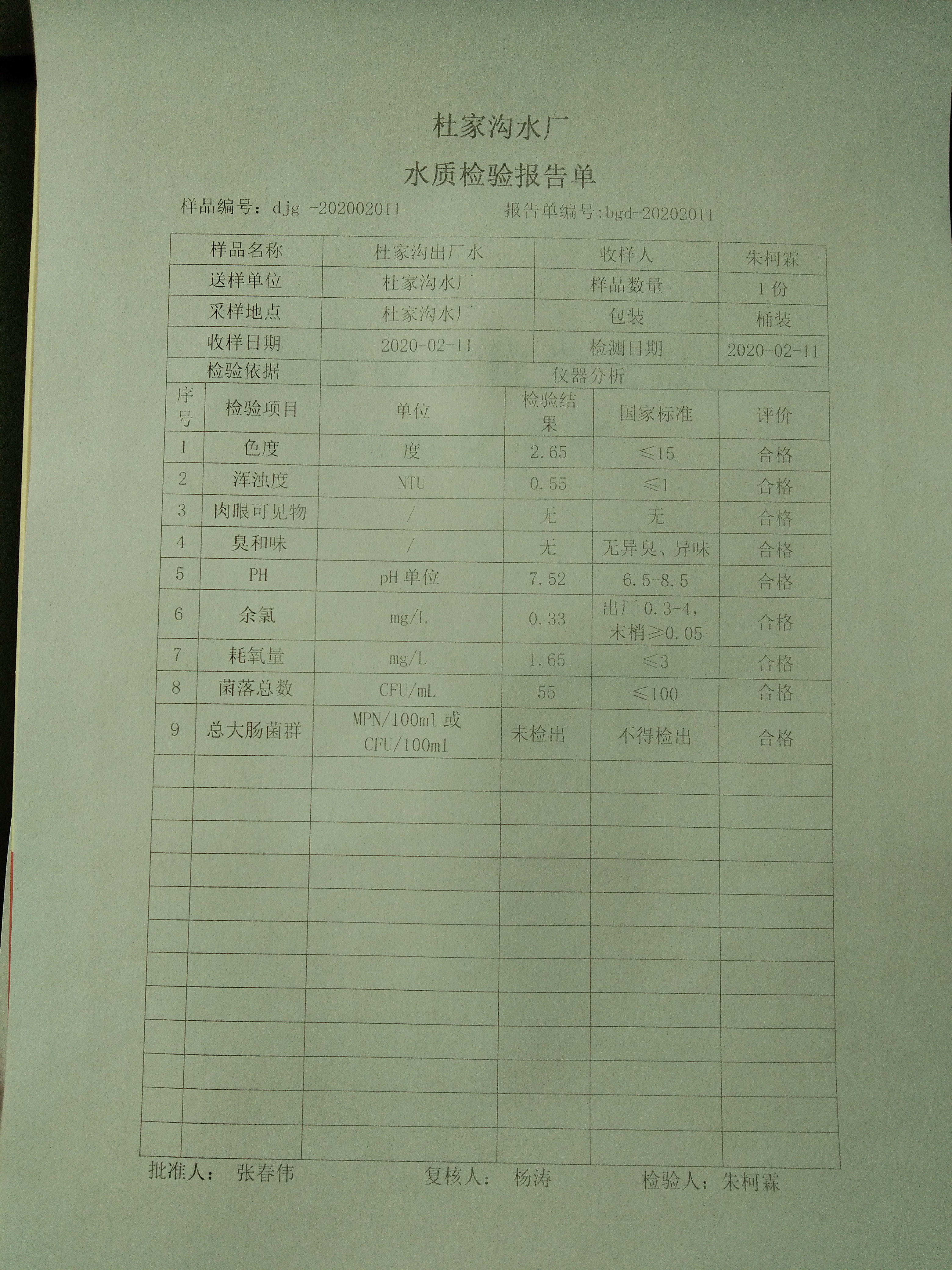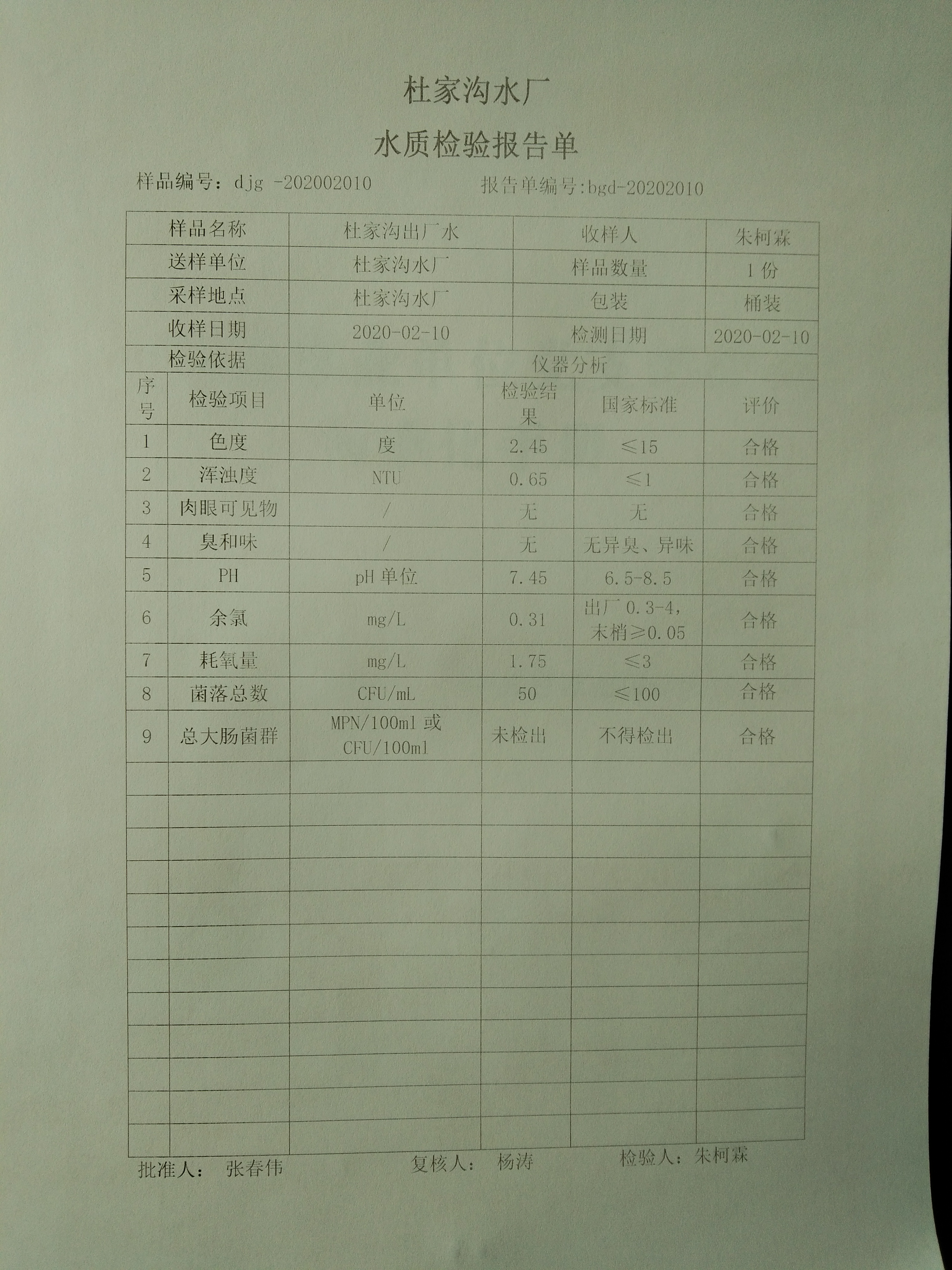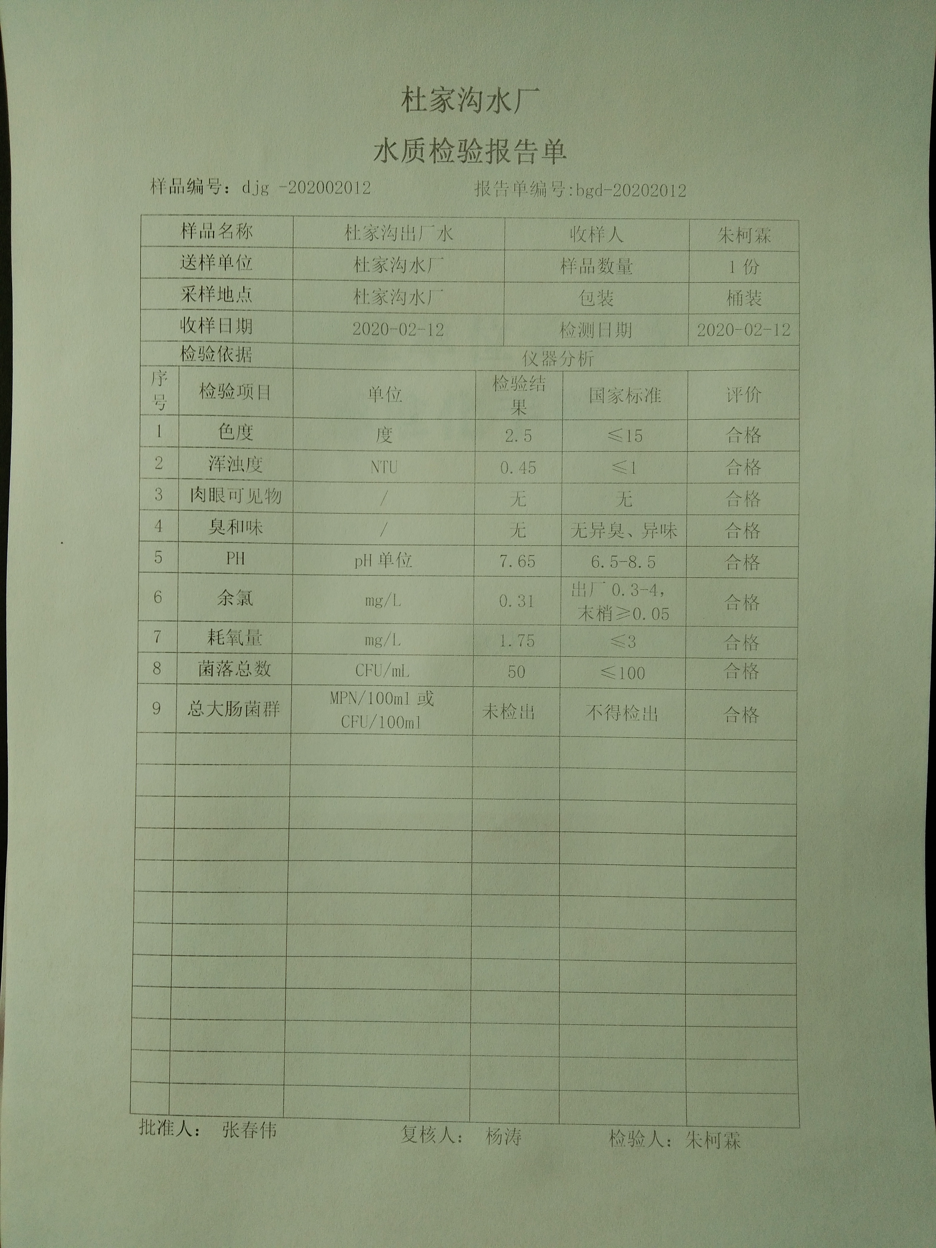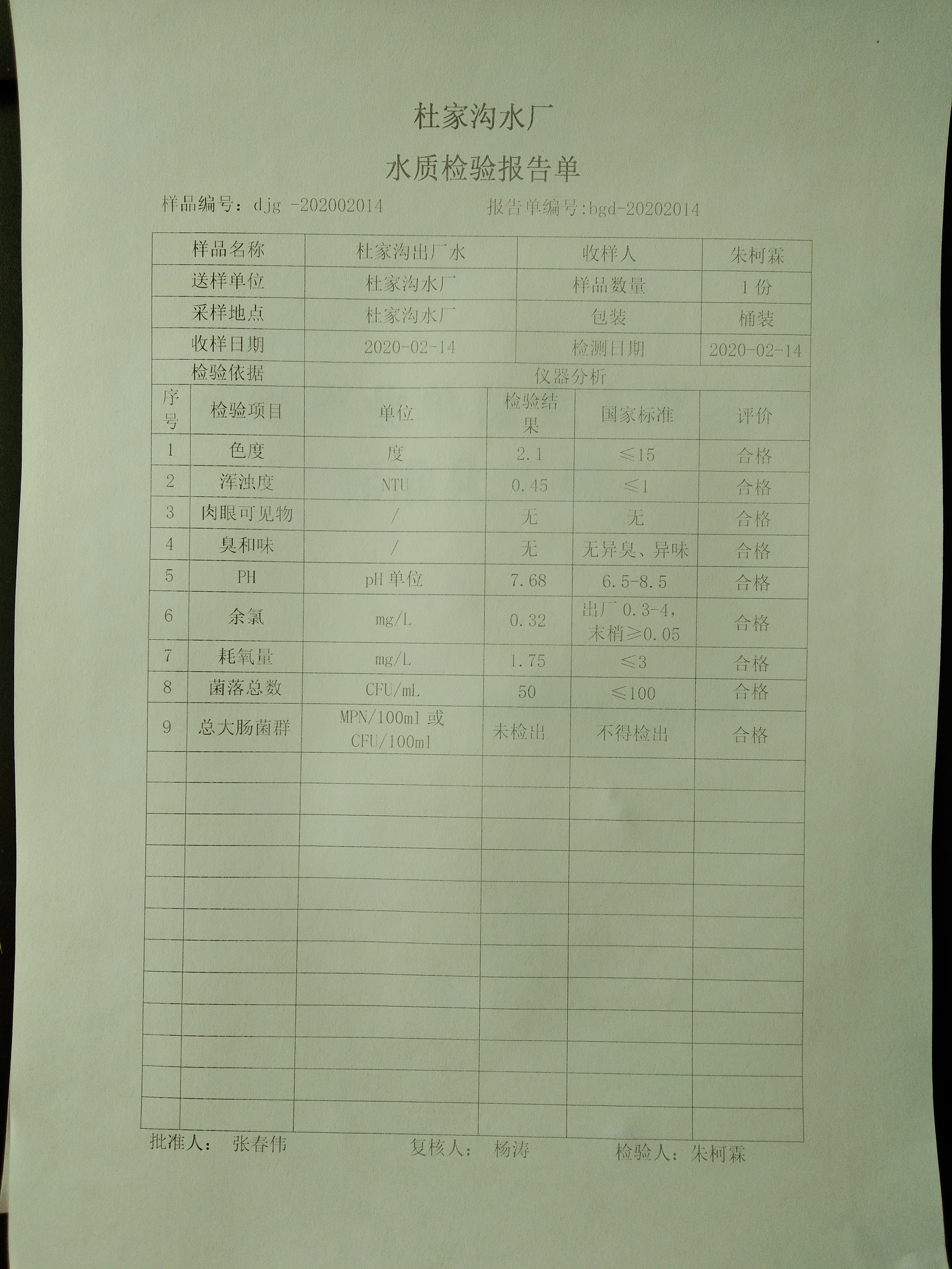 2020年2月份上半月杜家沟水厂水质日检报告单