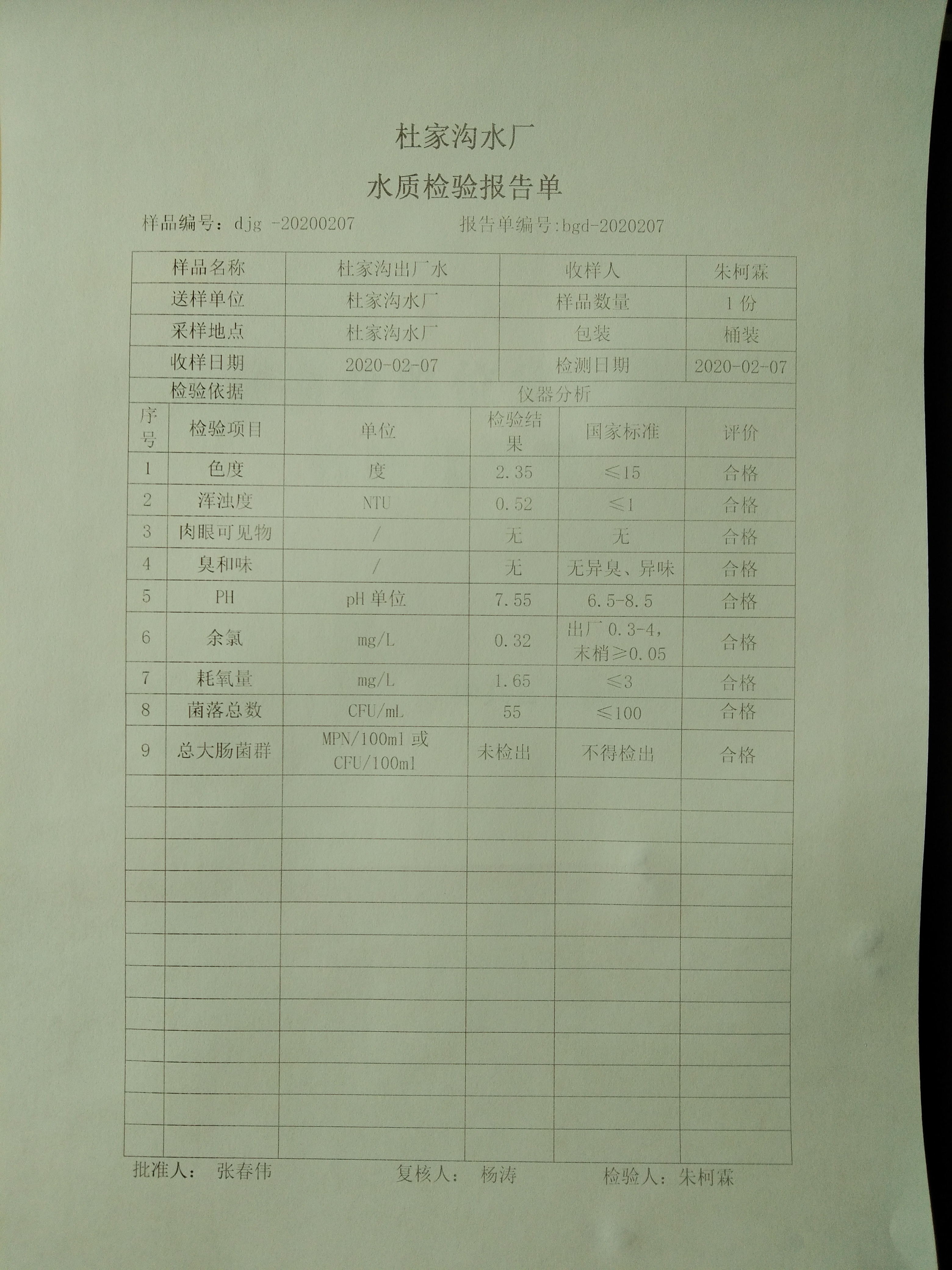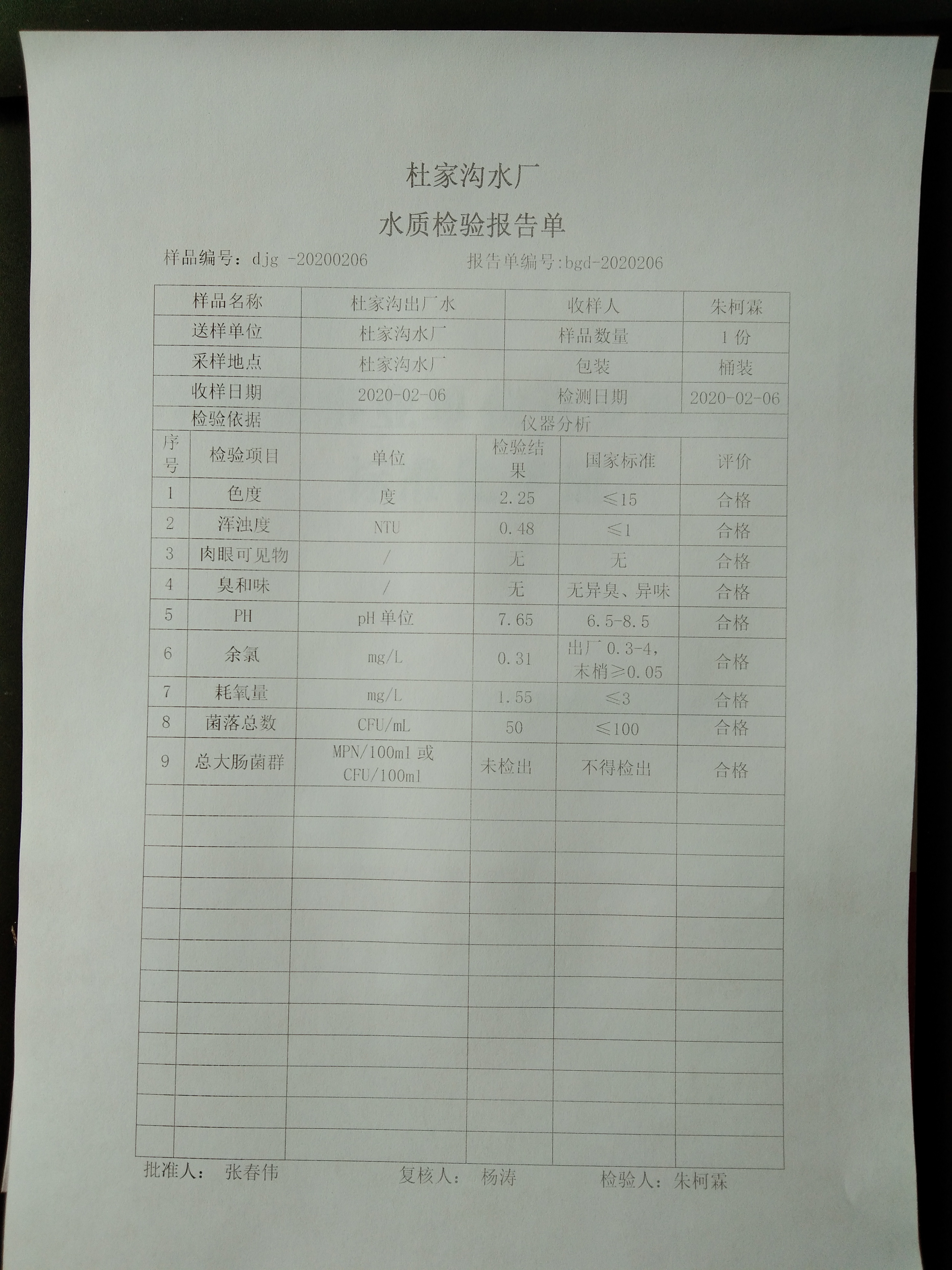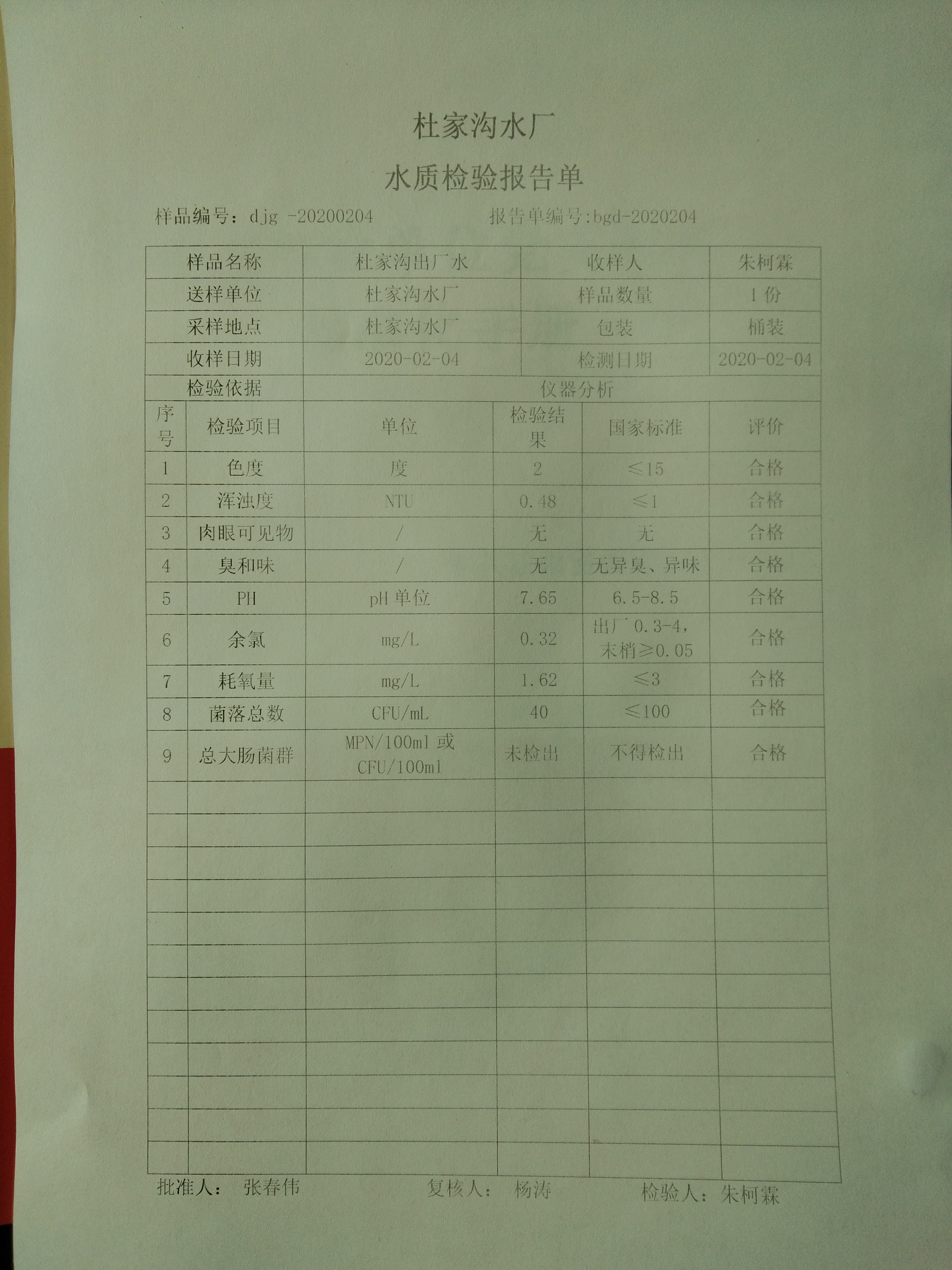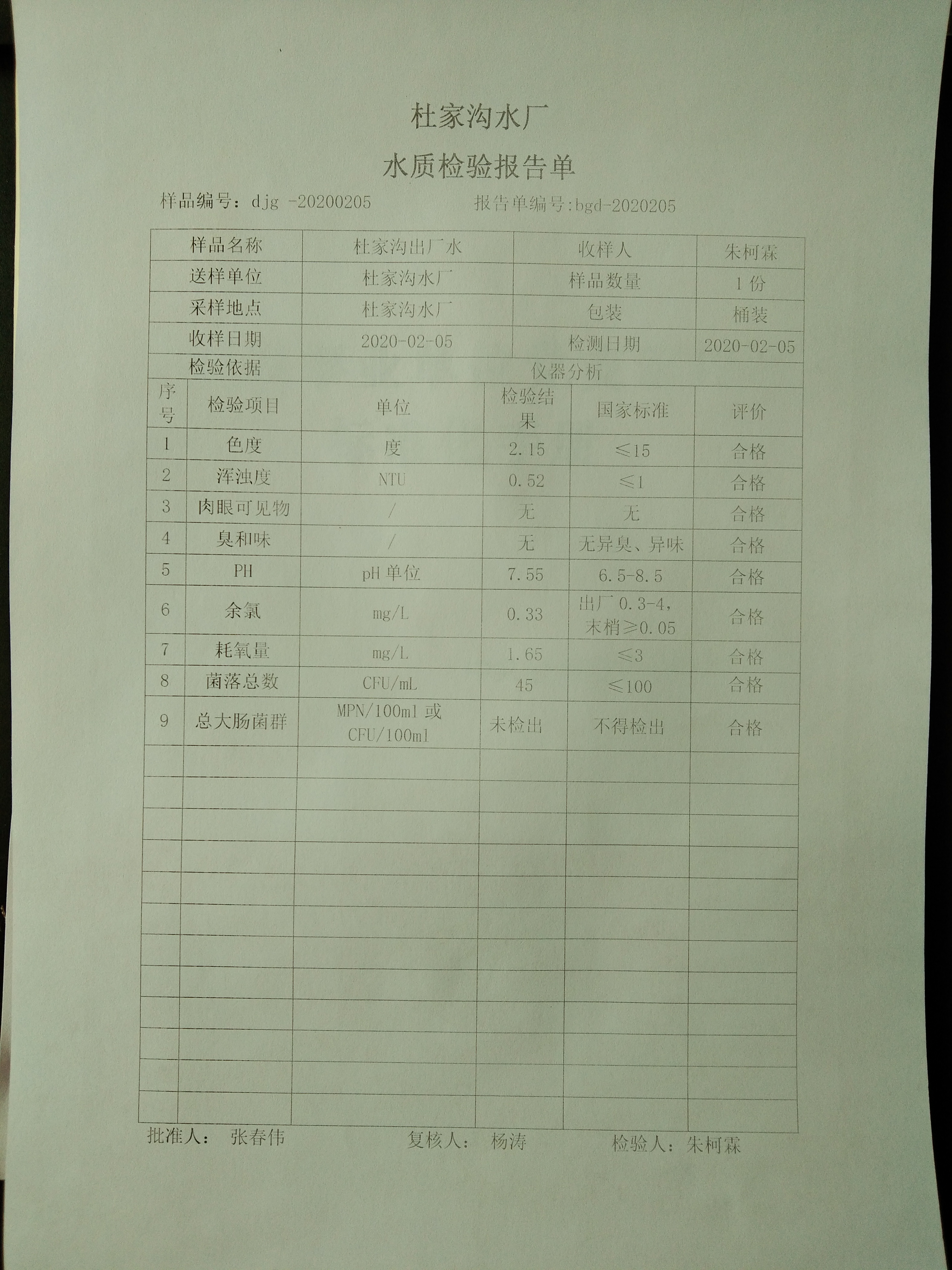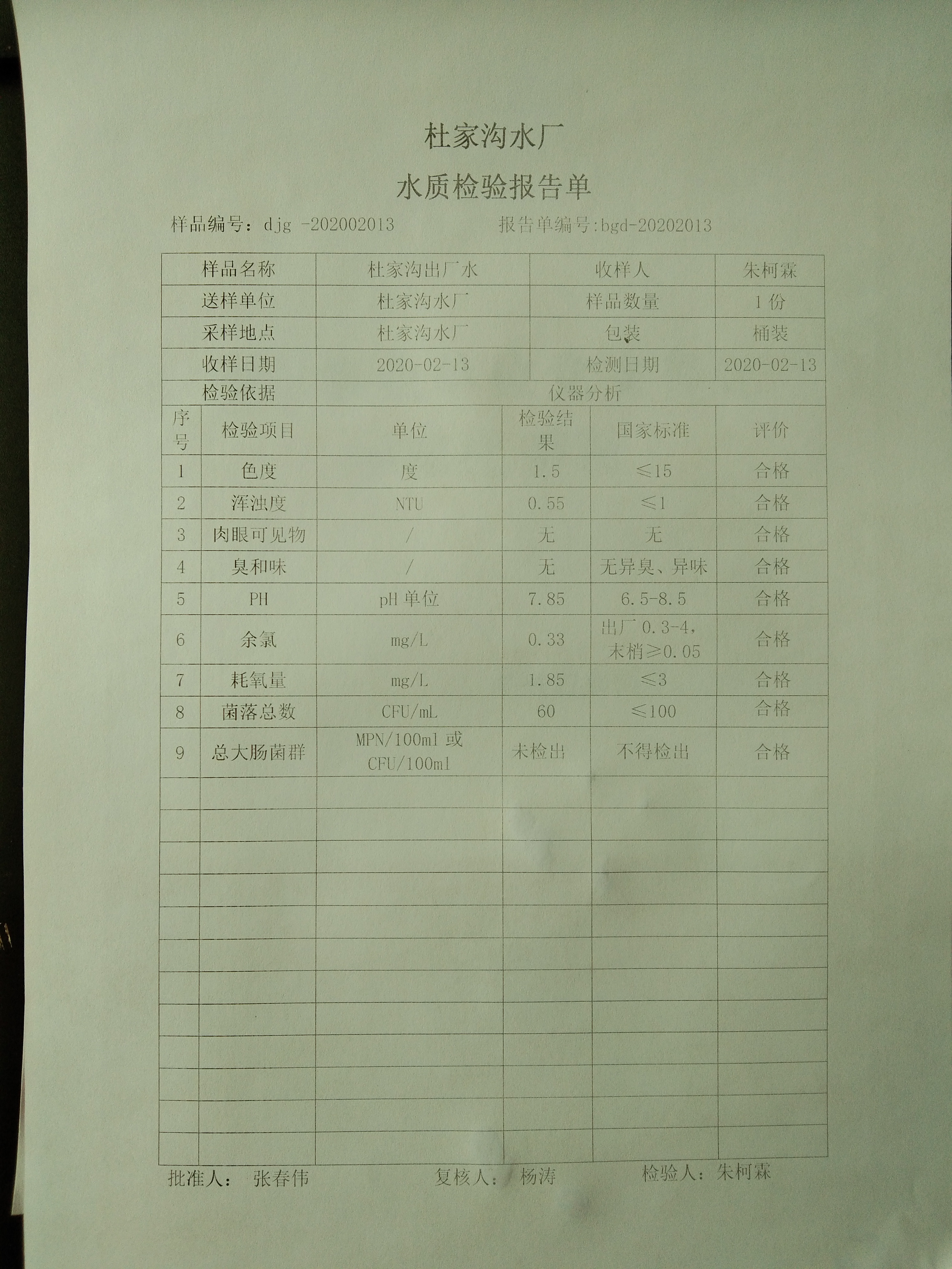 2020年2月份上半月杜家沟水厂水质日检报告单