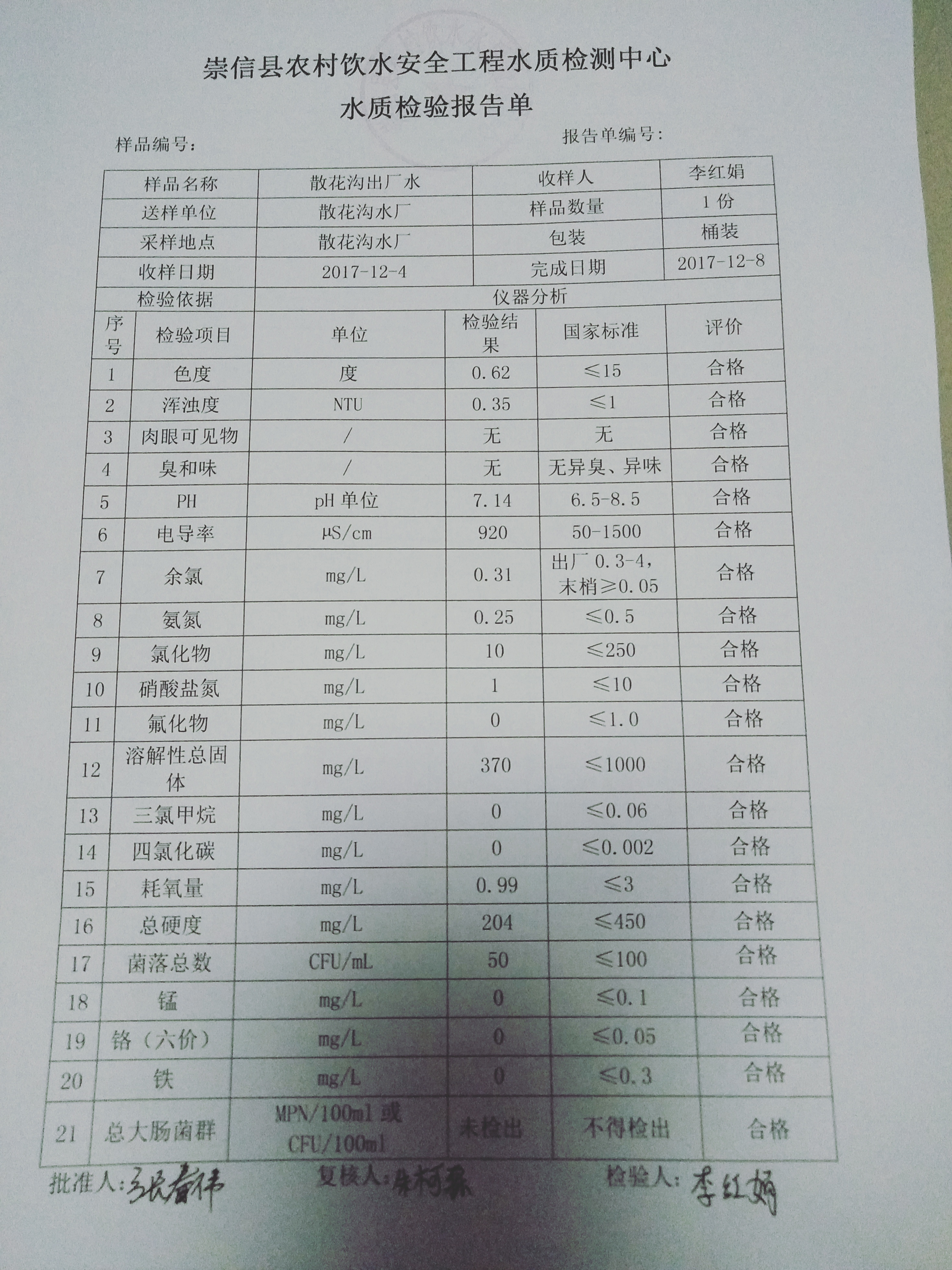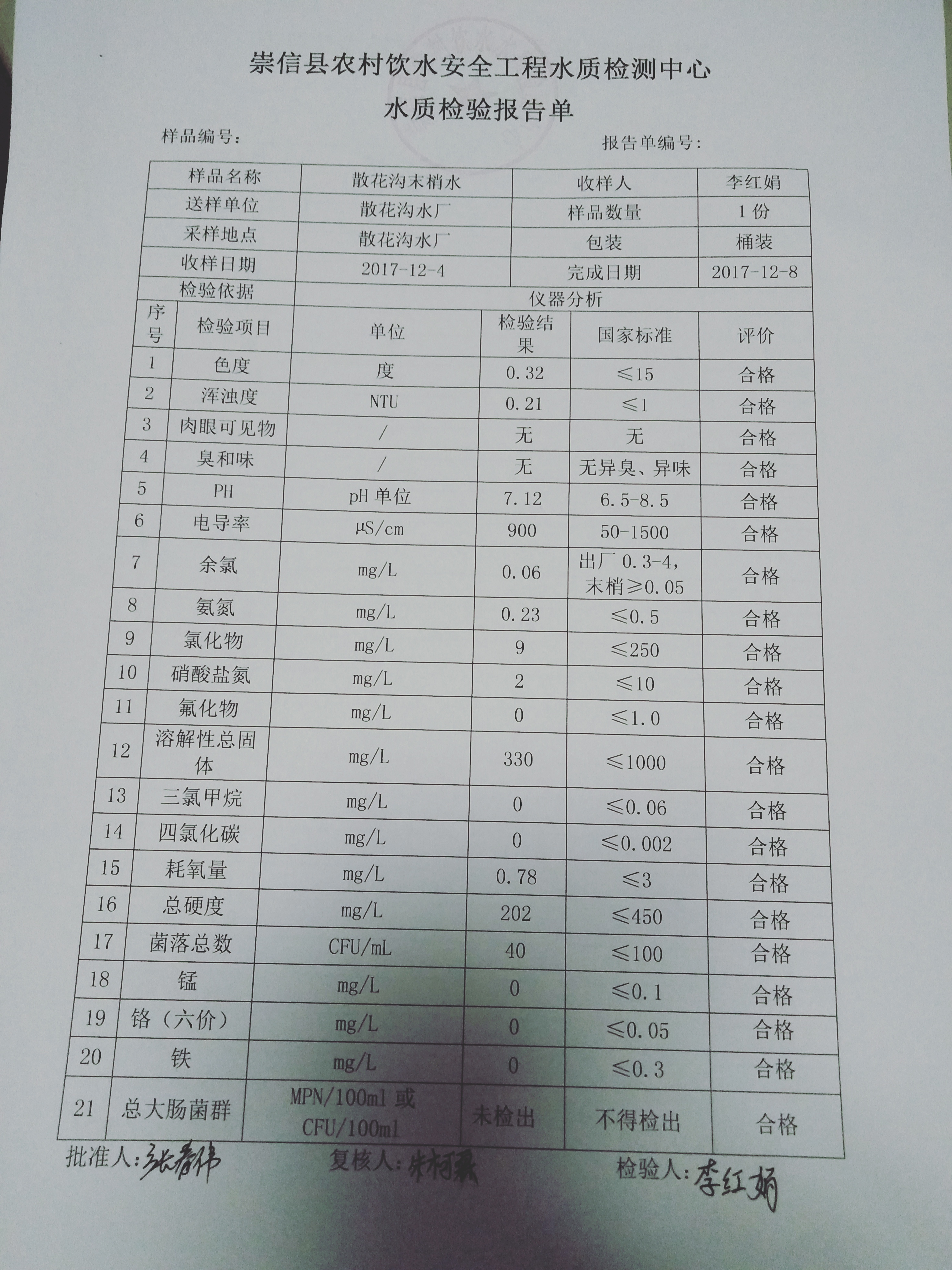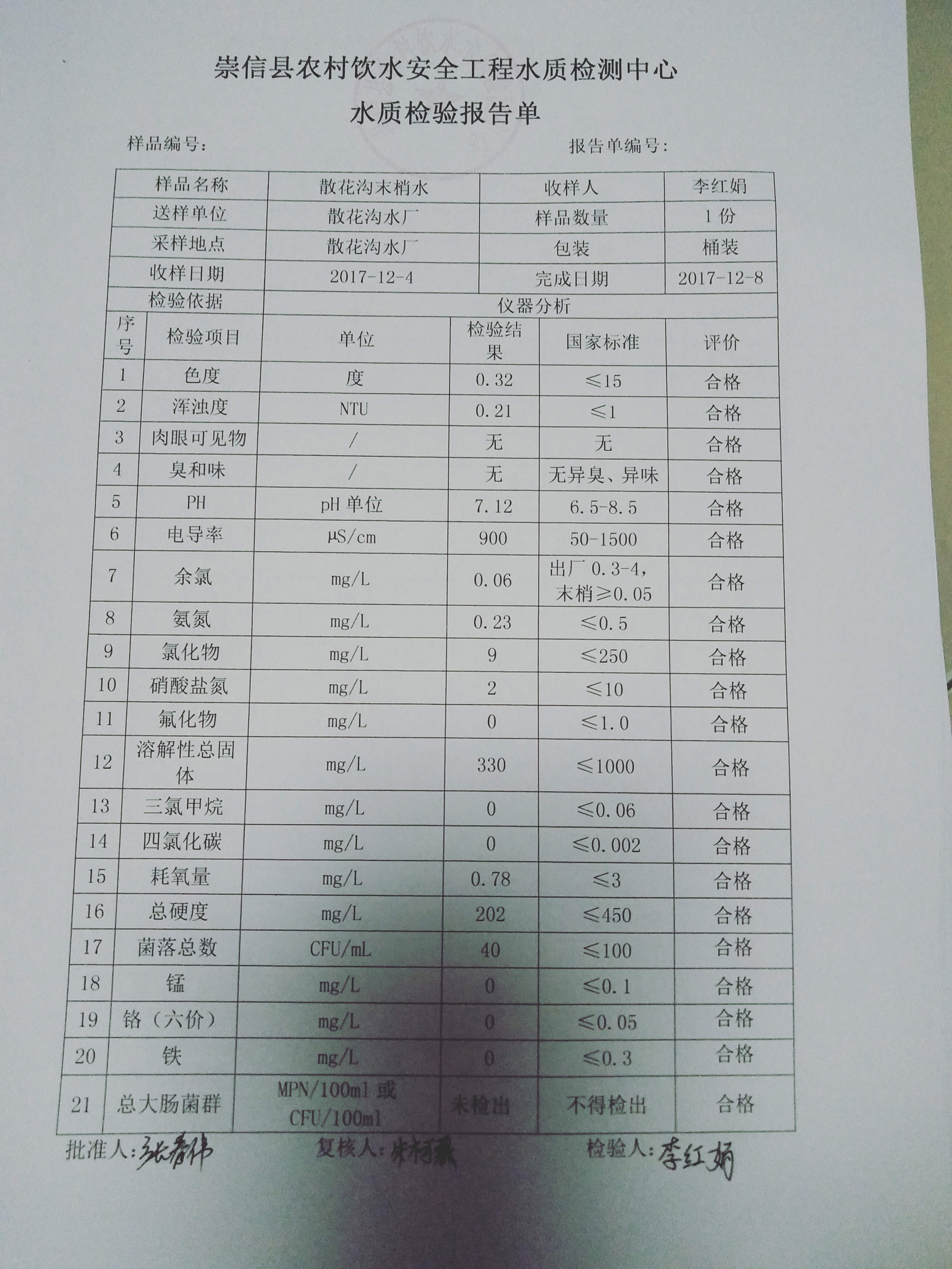 2017年12月份散花沟水厂水质检测报告单 发文日期:2018-01-30 23:31 来源:崇信县水务局 作者:崇信水务局 编辑:崇信水务局 IMG20180130222457 IMG20180130222516 IMG20180130222533 扫一扫在手机打开当前页 上一篇: 2018年1月份左营沟水厂水质检测报告单 下一篇: 2017年12月份杜家沟水厂水质检测报告单