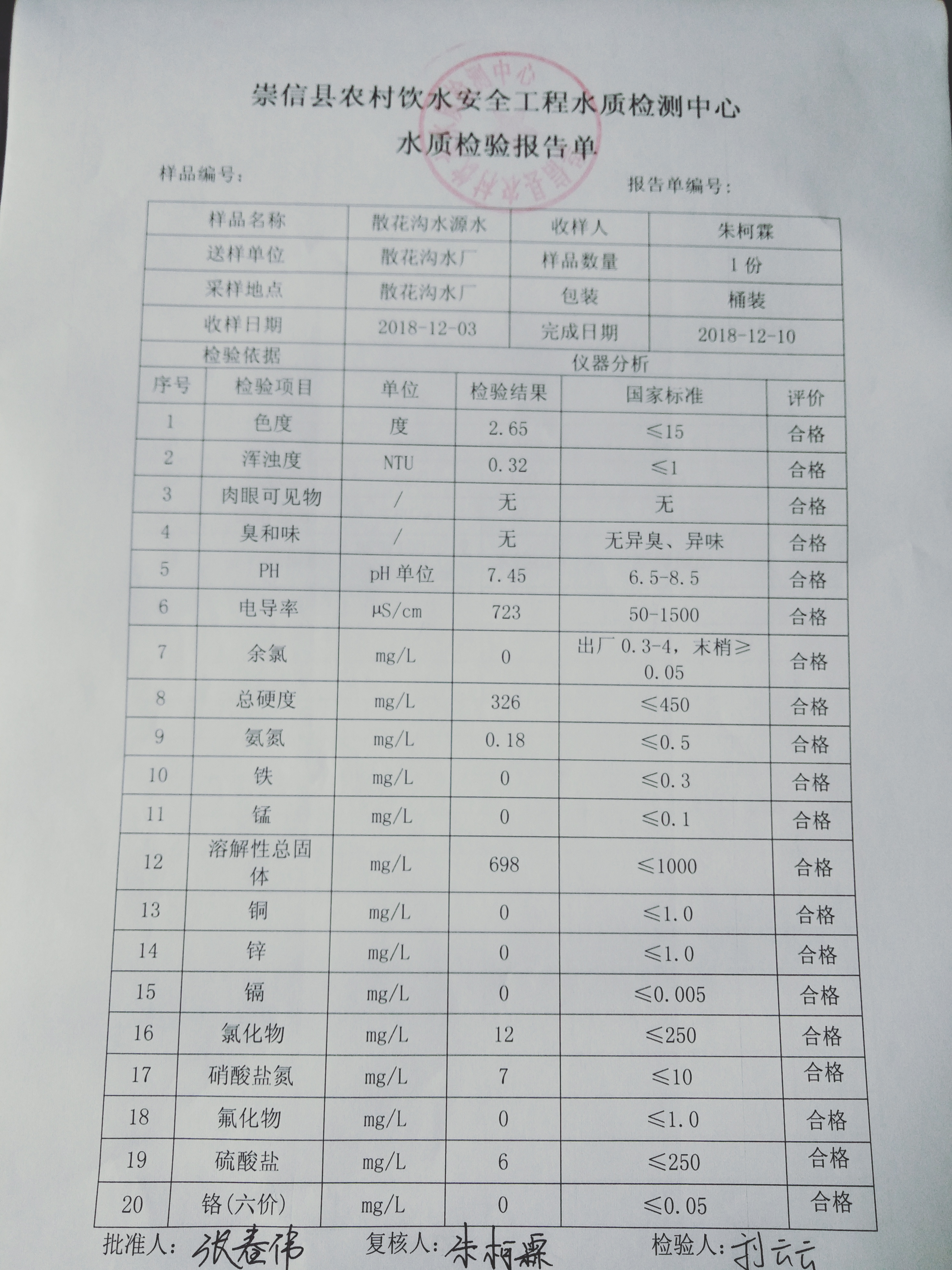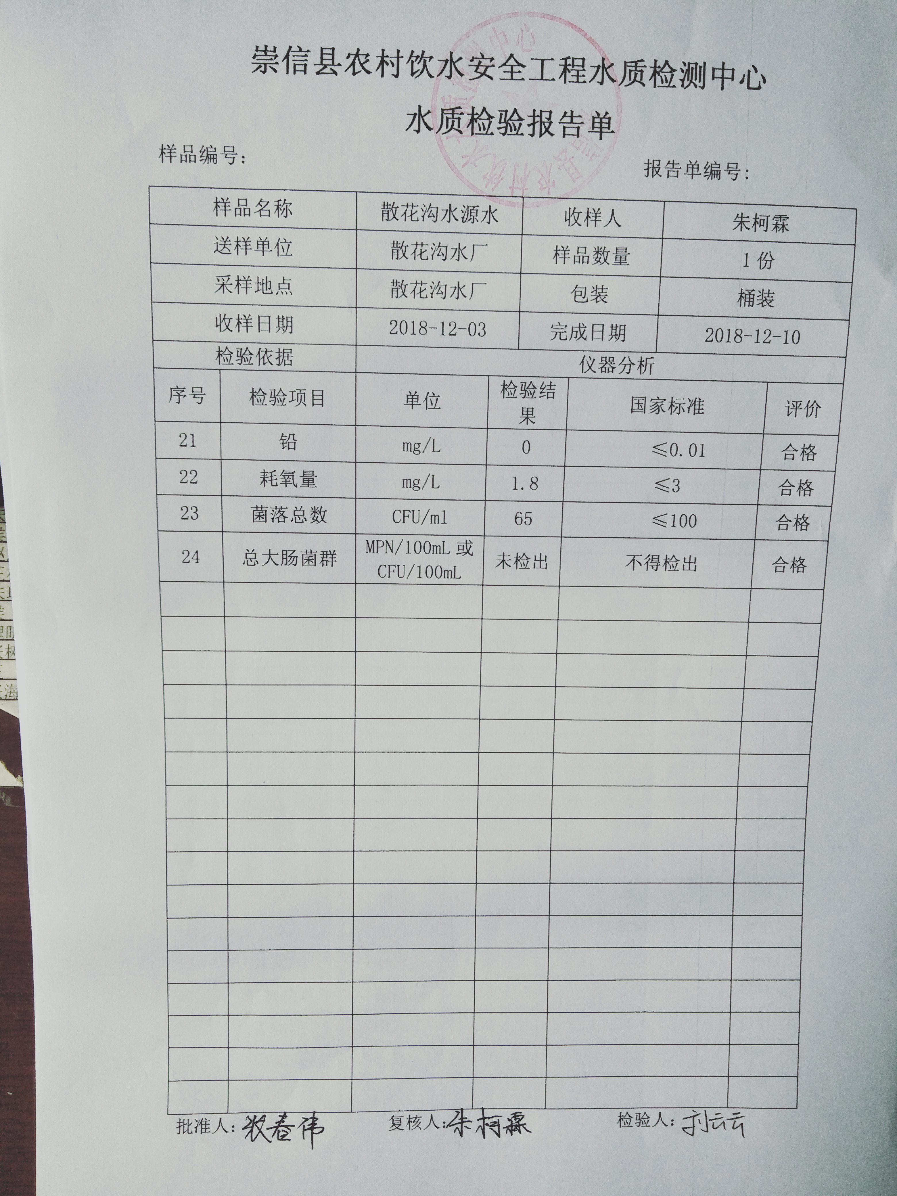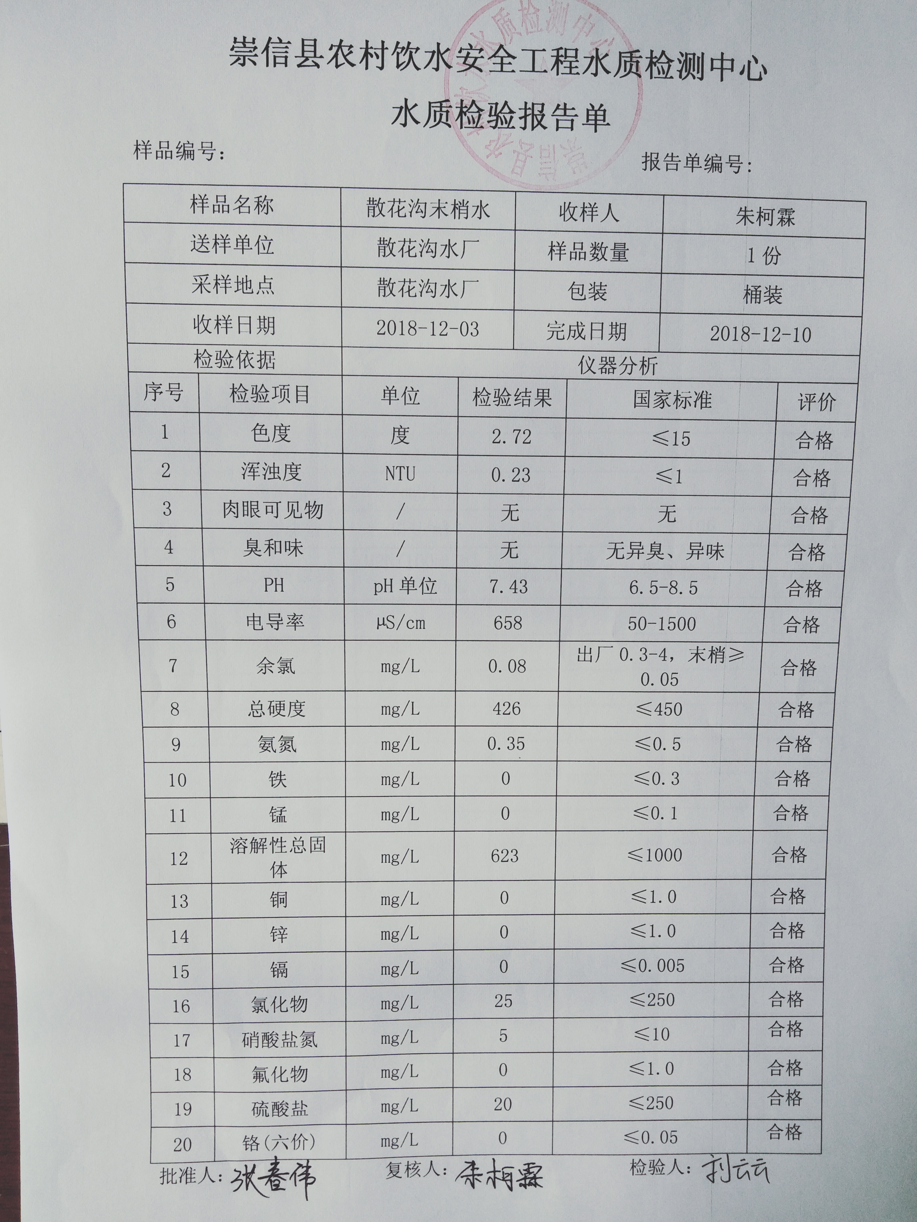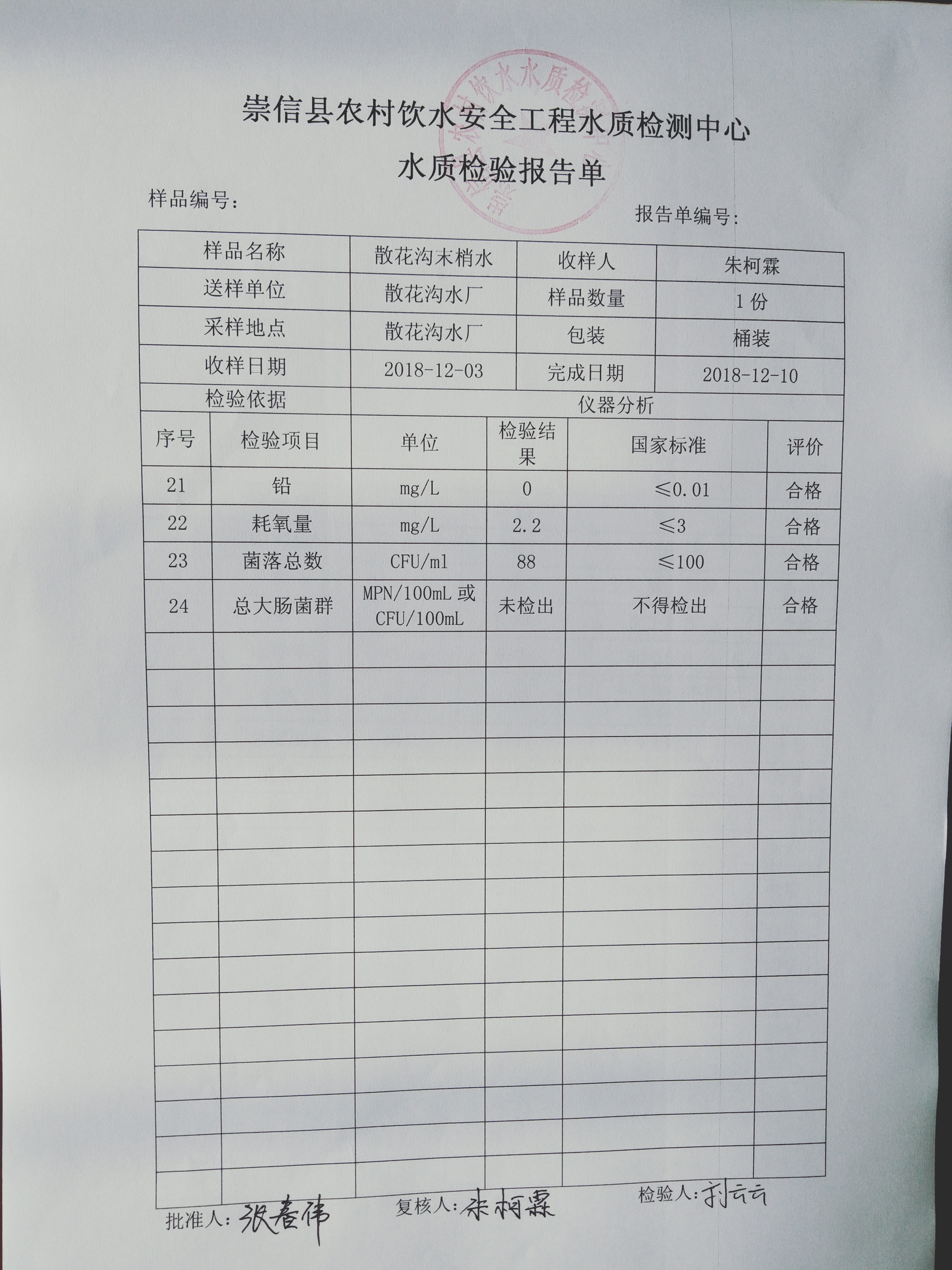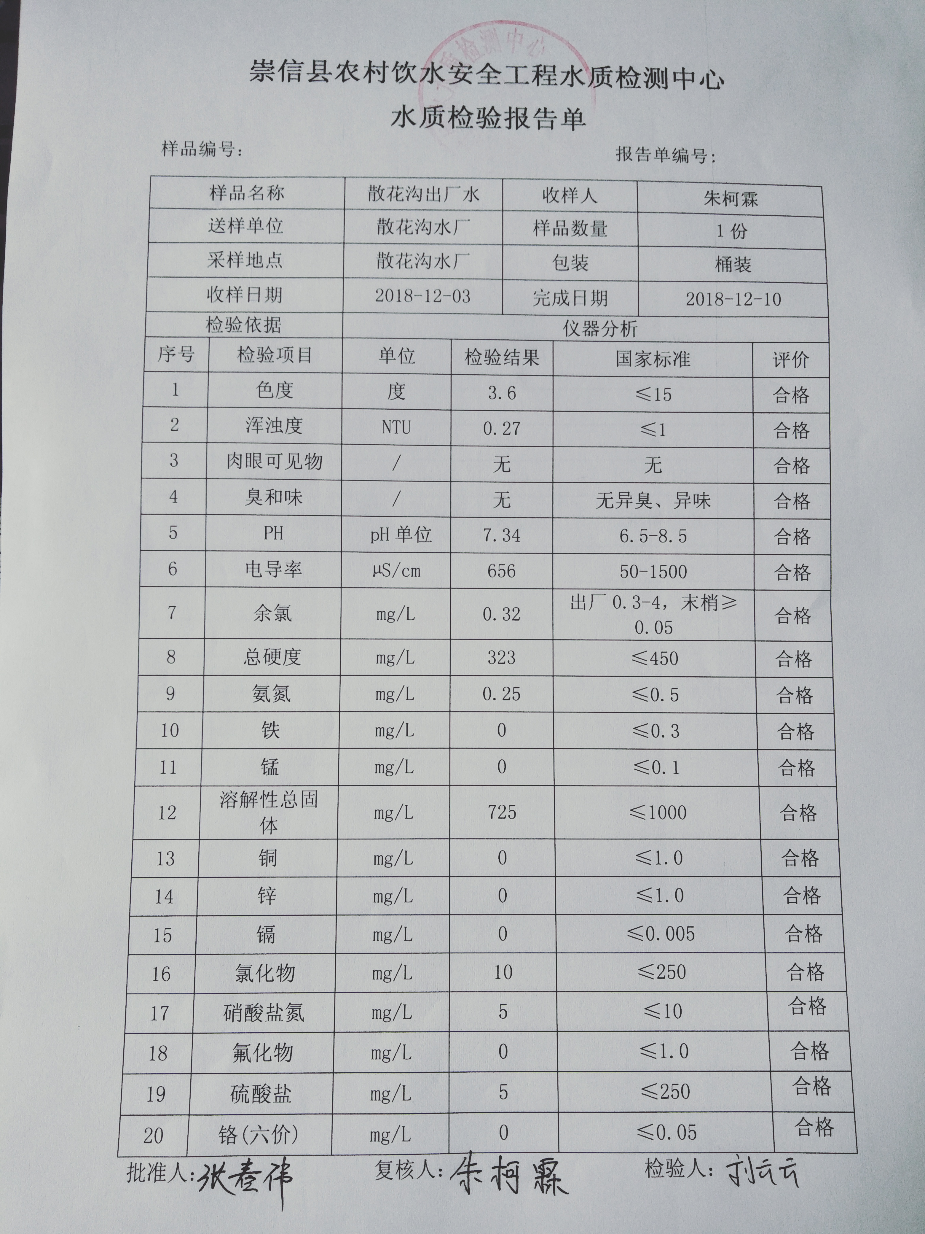 2018年12月份散花沟水厂水质检测报告单 发文日期:2018-12-27 17:33 来源:崇信县水务局 作者:崇信水务局 编辑:崇信水务局 IMG20181224114141 IMG20181224114156 IMG20181224114208 IMG20181224114221 IMG20181224114254 IMG20181224114306 扫一扫在手机打开当前页 上一篇: 2018年12份新窑水厂水质检测报告单 下一篇: 2018年左营沟水厂12月份水质检测报告单