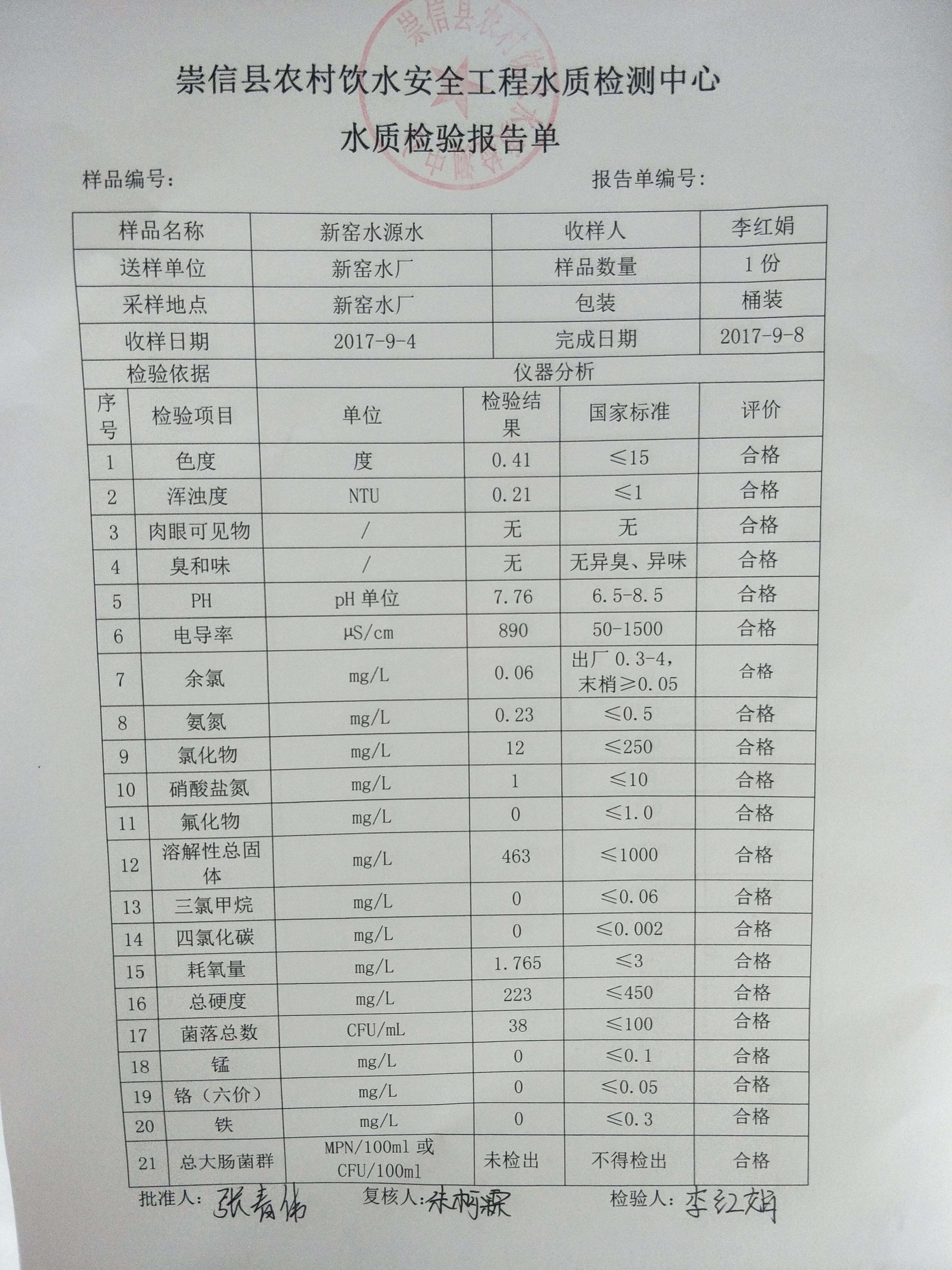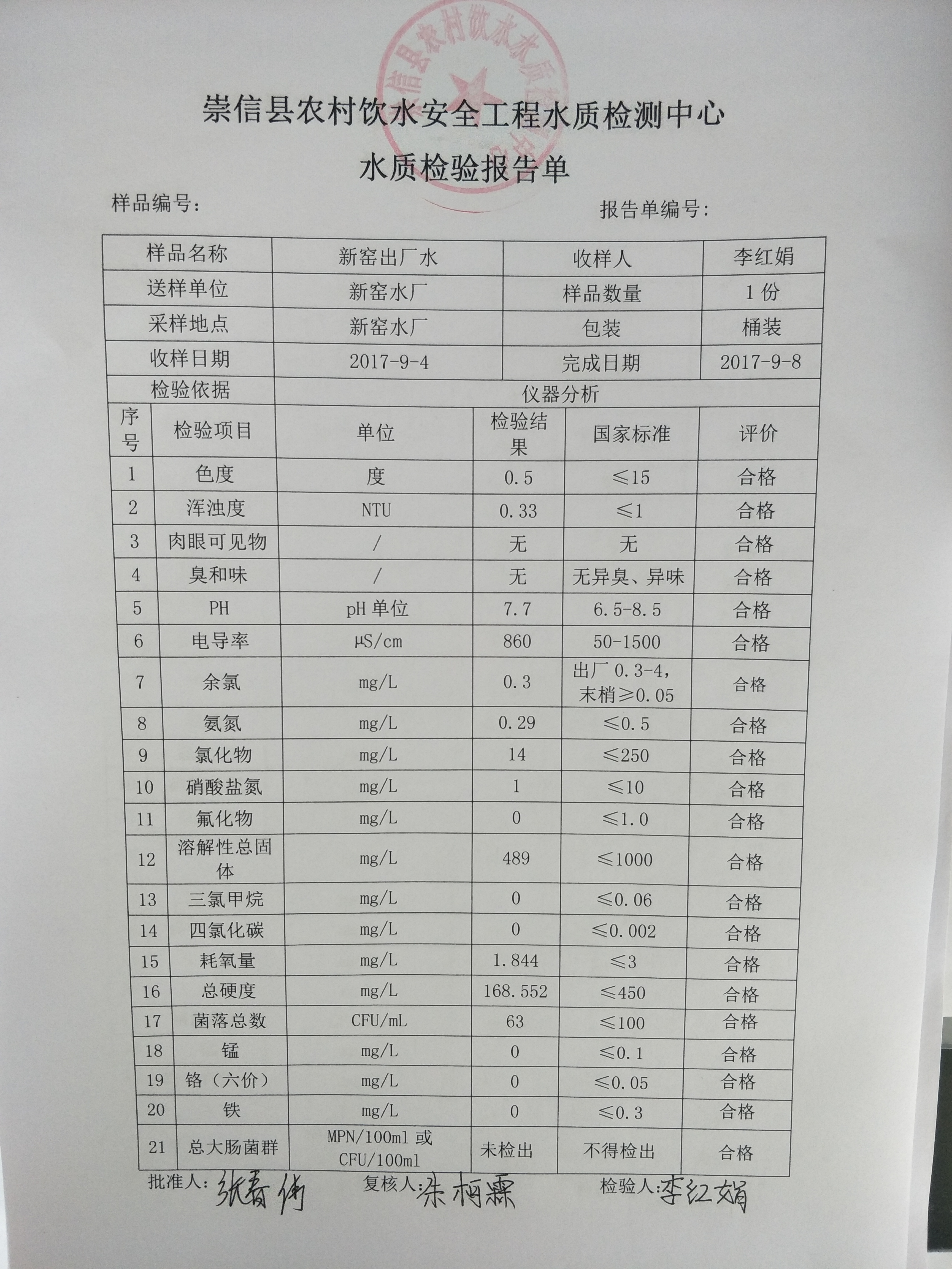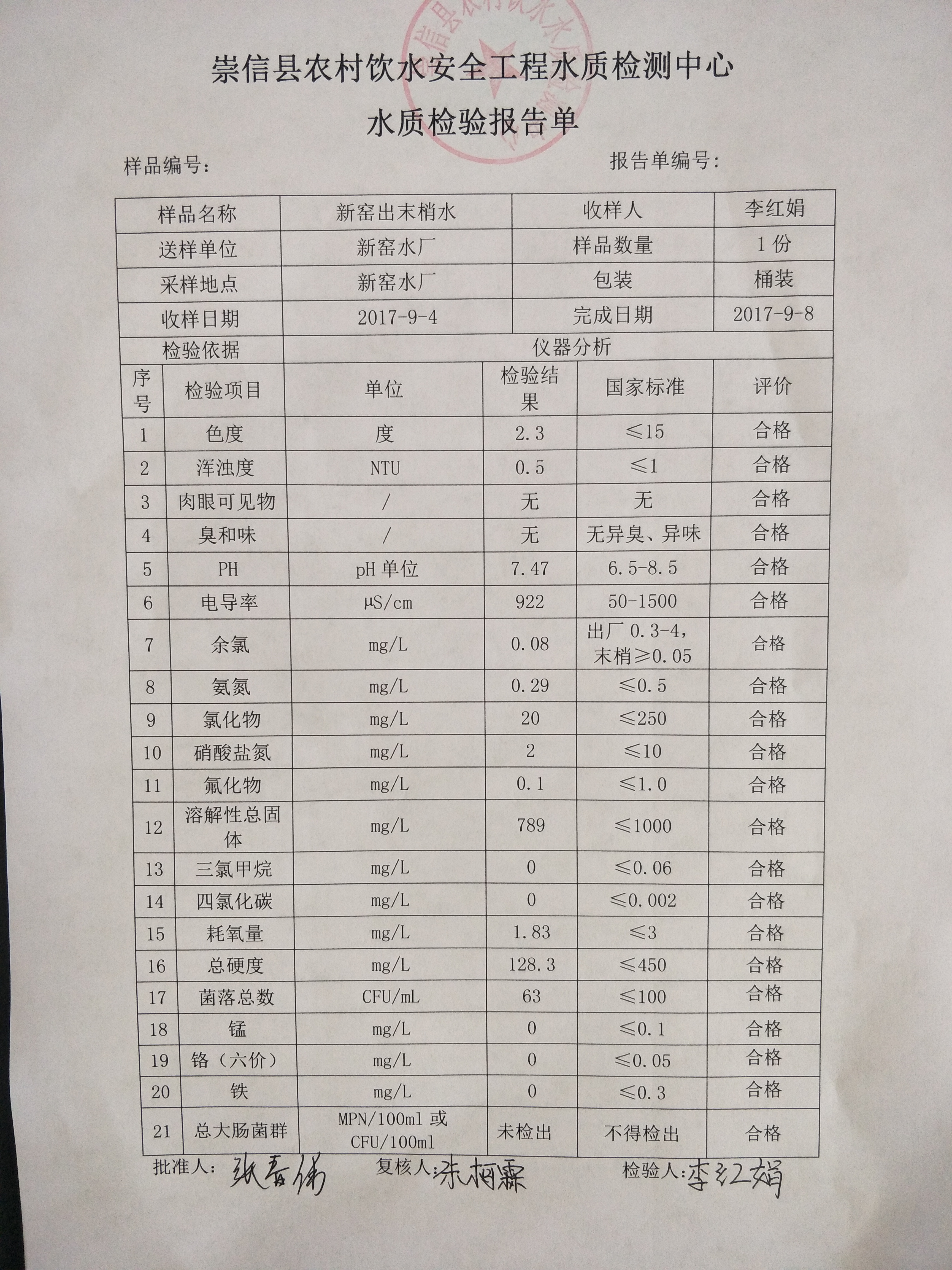 2017年9月份新窑水厂水质检测报告单 发文日期:2017-09-29 17:27 来源:崇信县水务局 作者:崇信水务局 编辑:崇信水务局 1506676971400 IMG20170929171009 IMG20170929171018 扫一扫在手机打开当前页 上一篇: 自来水9月水质化验报告单-新窑周寨水源井 下一篇: 2017年8月份新窑水厂水质检测报告单