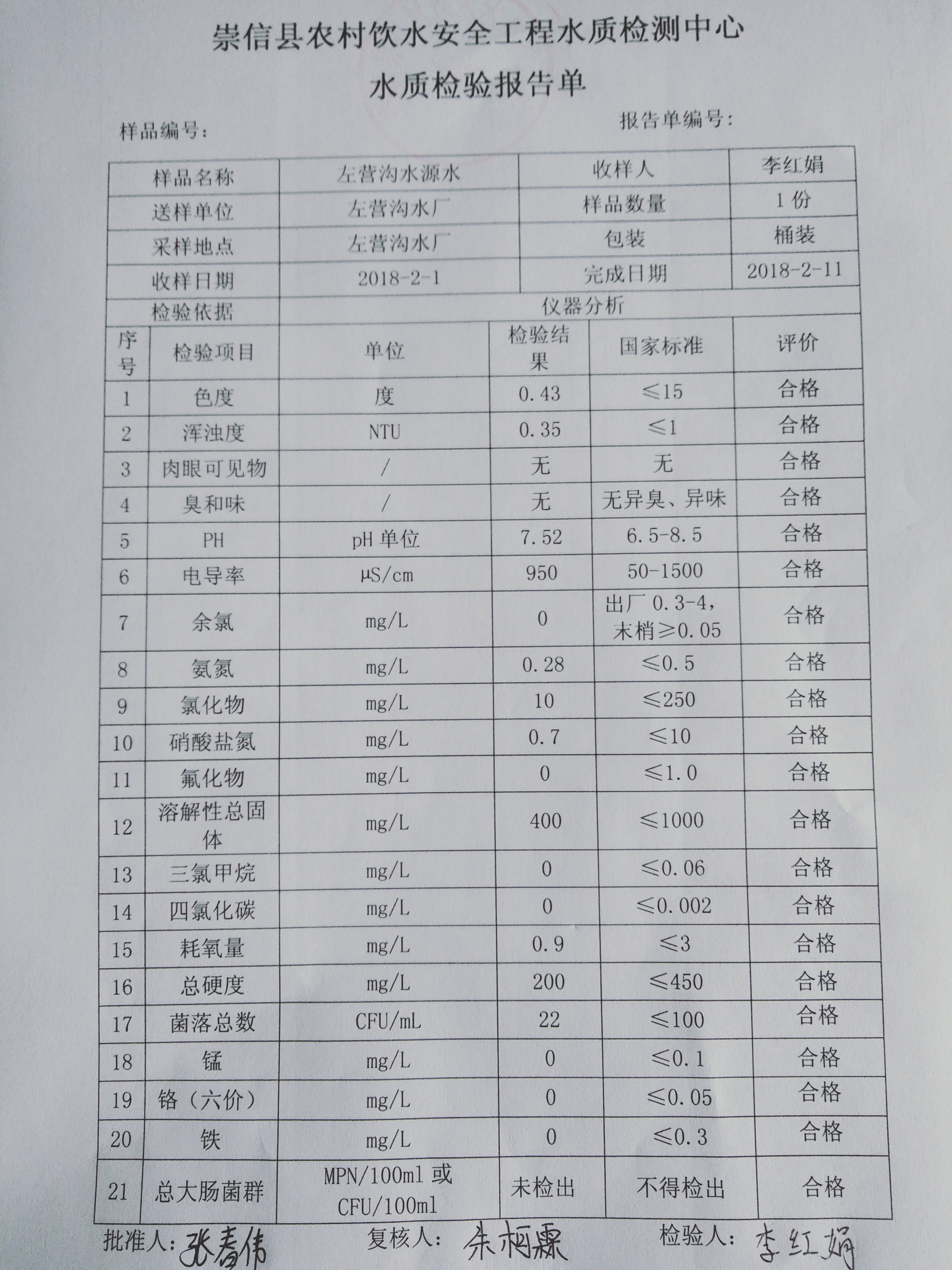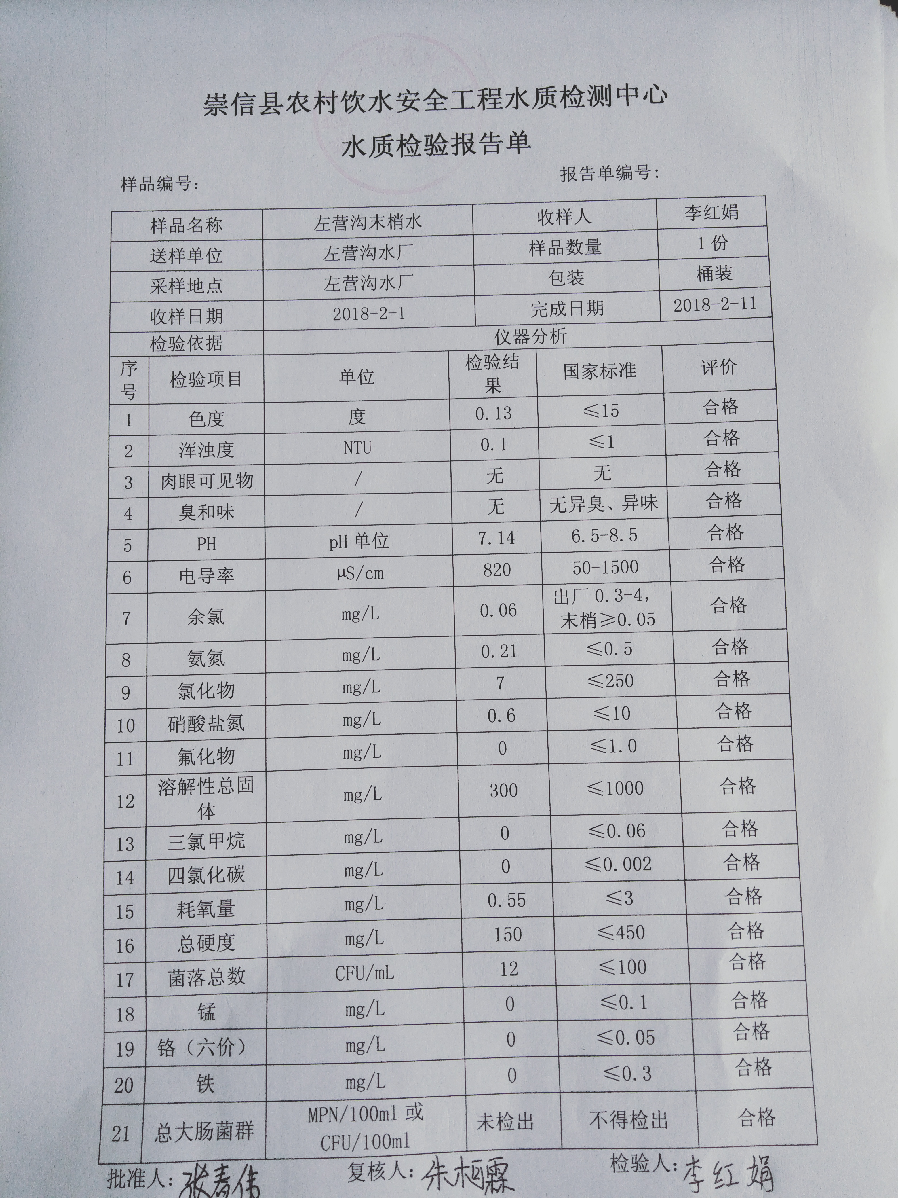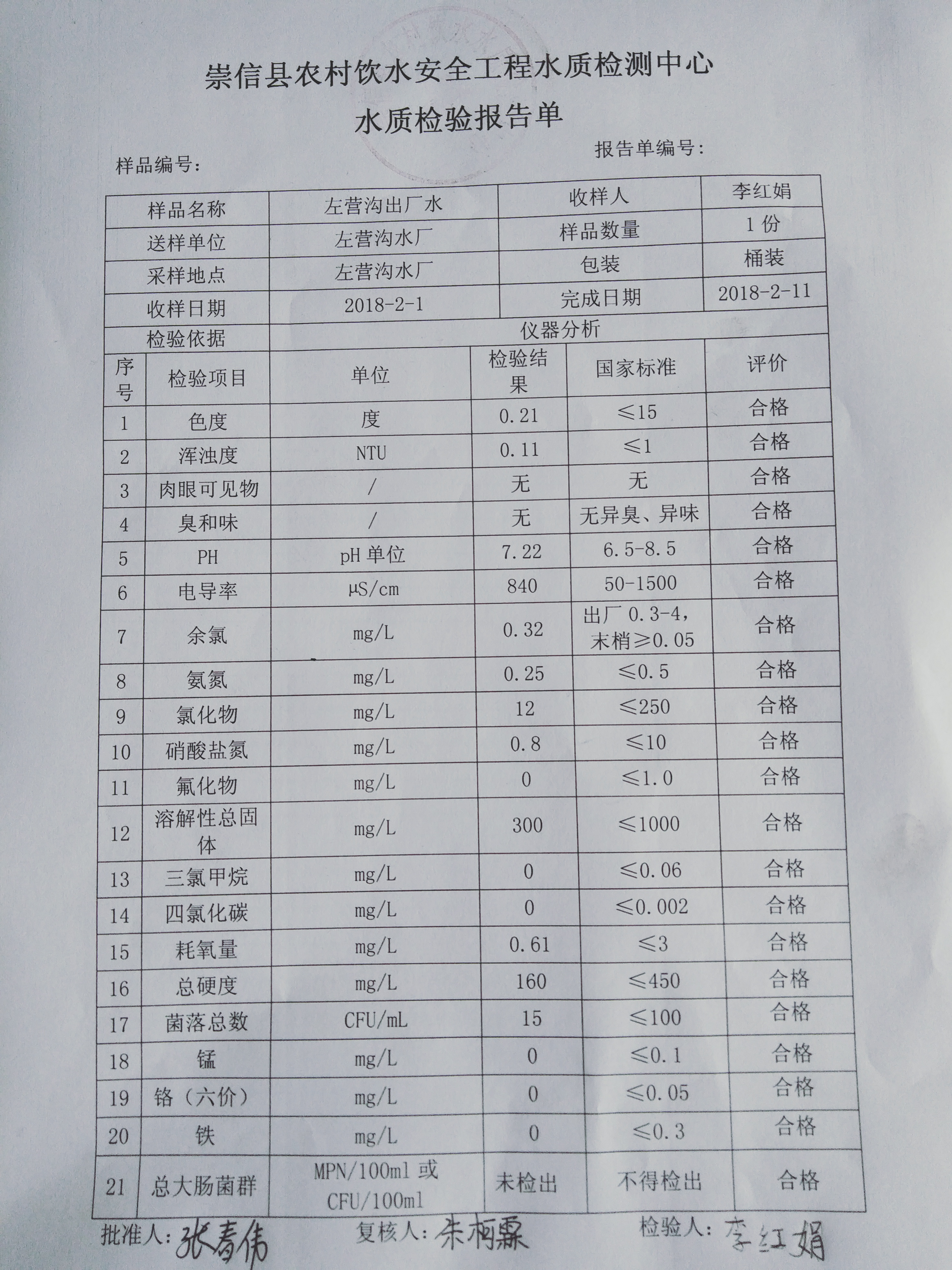 2018年左营沟水厂2月份水质检测报告单 发文日期:2018-03-09 11:48 来源:崇信县水务局 作者:崇信水务局 编辑:崇信水务局 1520564572683 1520564585461 IMG20180309110218 扫一扫在手机打开当前页 上一篇: 2018年新窑水厂2月份水质检测报告单 下一篇: 2018年2月份水质化验报告