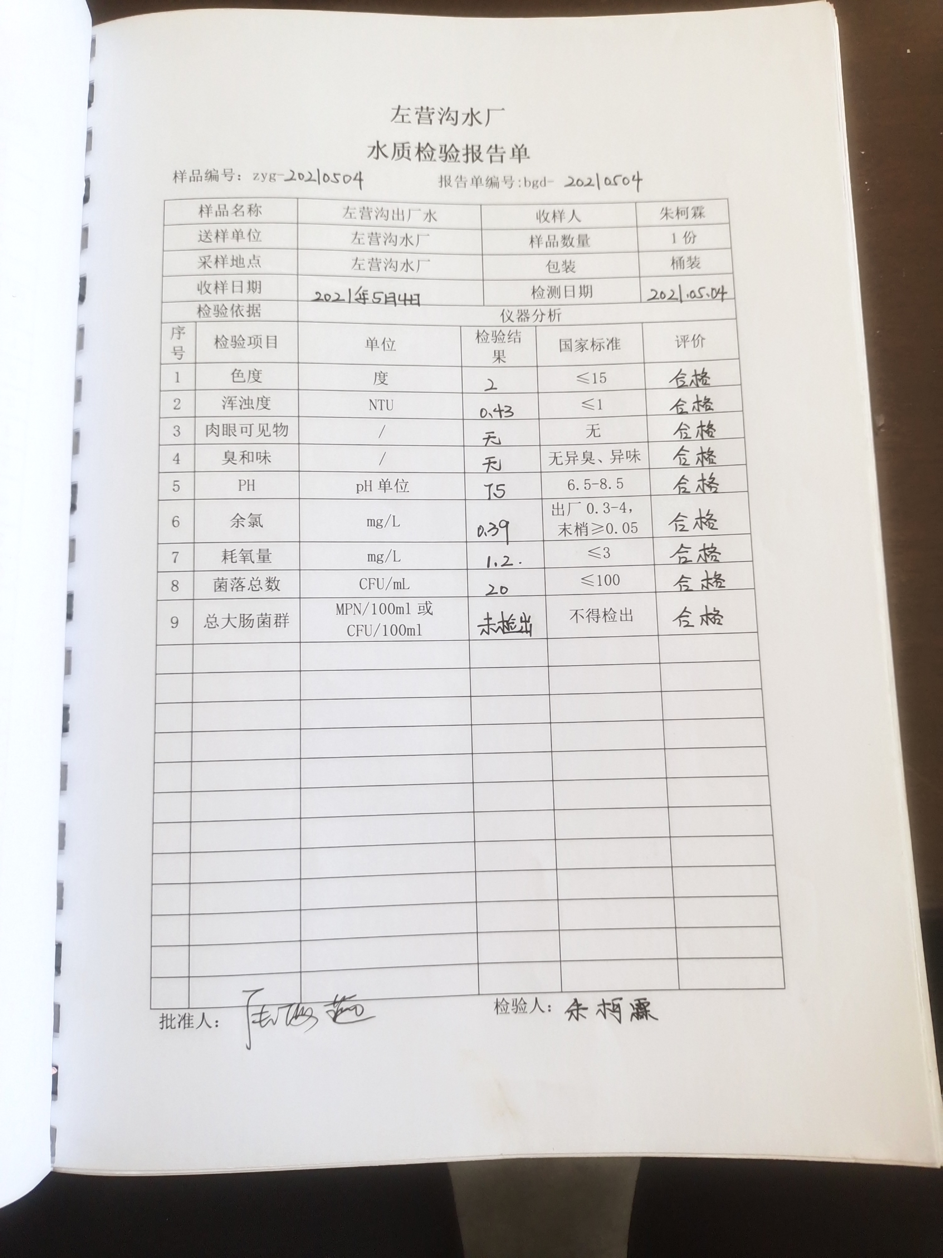 2021年左营沟水厂4月份水质检测报告单 发文日期:2021-08-24 00:00 来源:崇信县水务局 作者:崇信水务局 编辑:星云科技 C:fakepathIMG_20210824_114401.jpg 扫一扫在手机打开当前页 上一篇: 关于注销取水许可证的公示 下一篇: 2021年左营沟水厂6月份水质检测报告单
