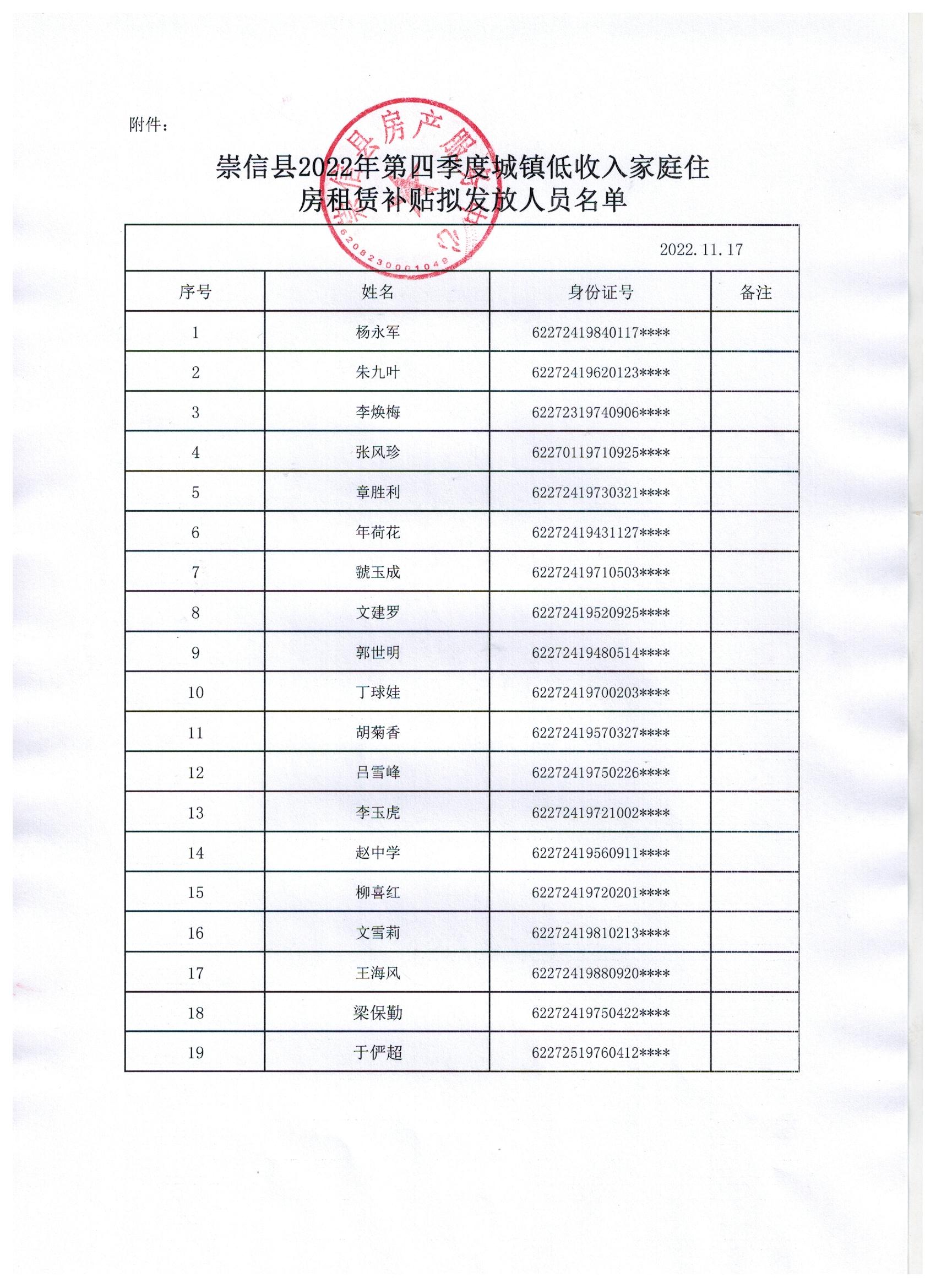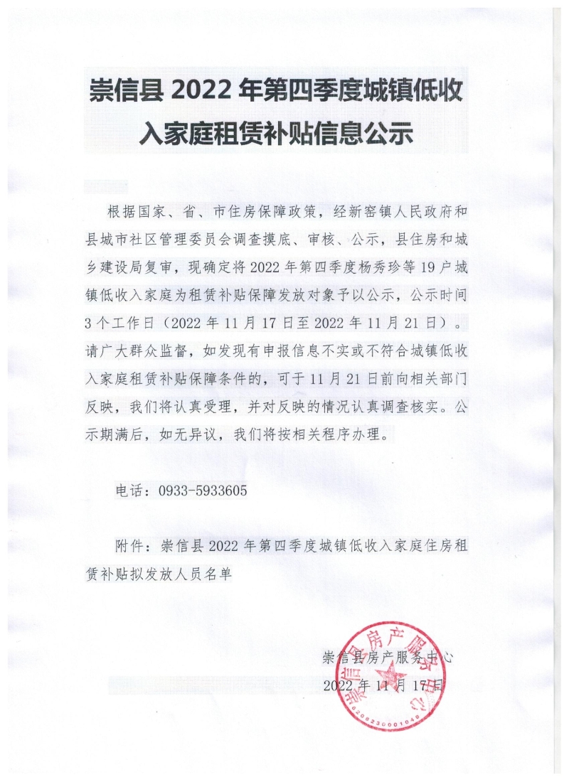 崇信县2022年第四季度城镇低收入家庭租赁补贴信息公示 发文日期:2022-11-17 16:59 来源:崇信县住建局 作者:朱晶 编辑:朱晶 扫一扫在手机打开当前页 上一篇: 2022年安全住房提升改造项目完成情况公示 下一篇: 崇信县2022年第三季度城镇低收入家庭租赁补贴信息公示