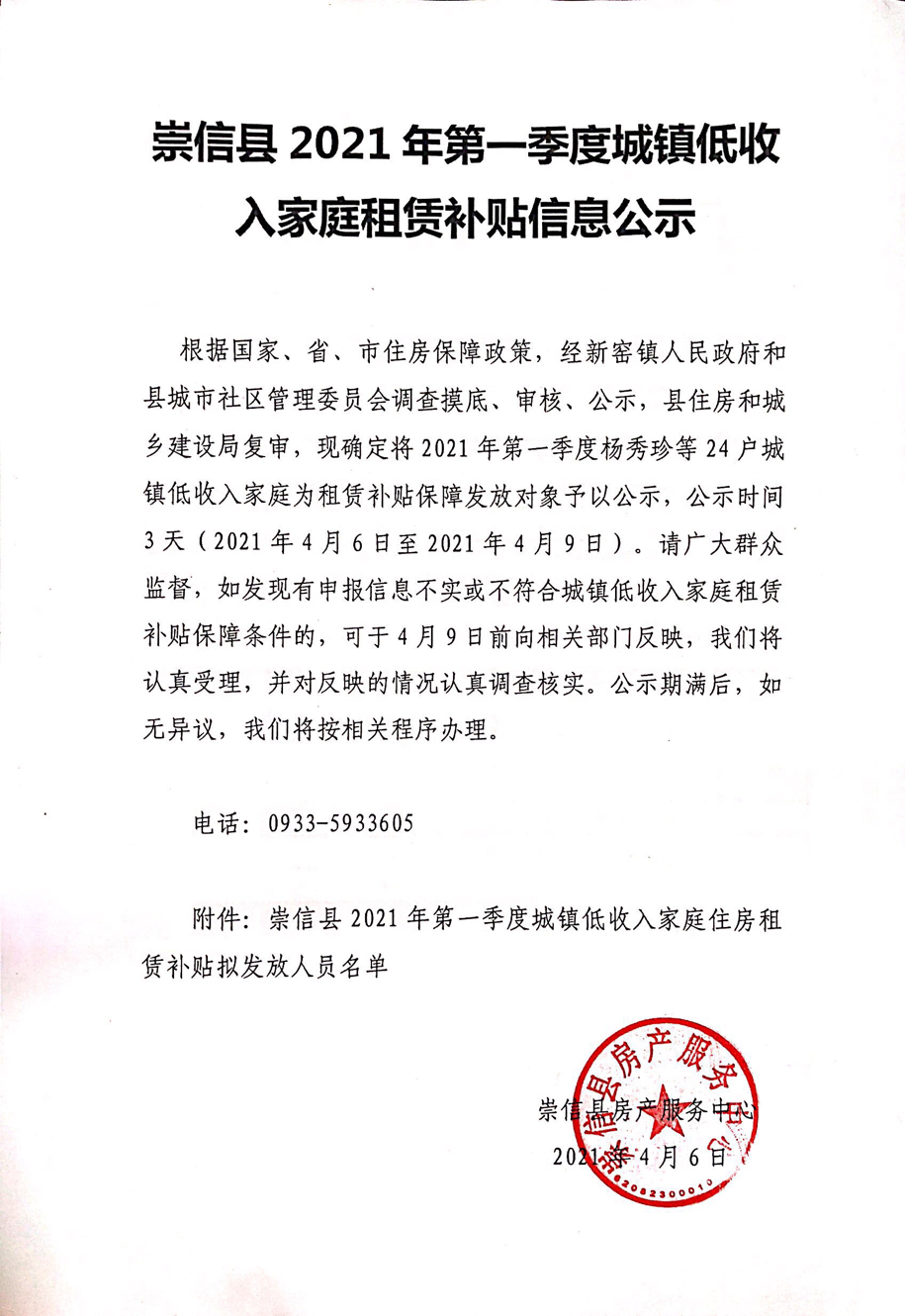 崇信县2021年第一季度城镇低收入家庭租赁补贴信息公示 发文日期:2021-04-09 00:00 来源:崇信县住房和城乡建设局 作者:崇信住建局 编辑:星云科技 扫一扫在手机打开当前页 上一篇: 公共租赁住房资产管理暂行办法 下一篇: 2020年第四季度城镇低收入家庭住房租赁补贴拟发放人员名单
