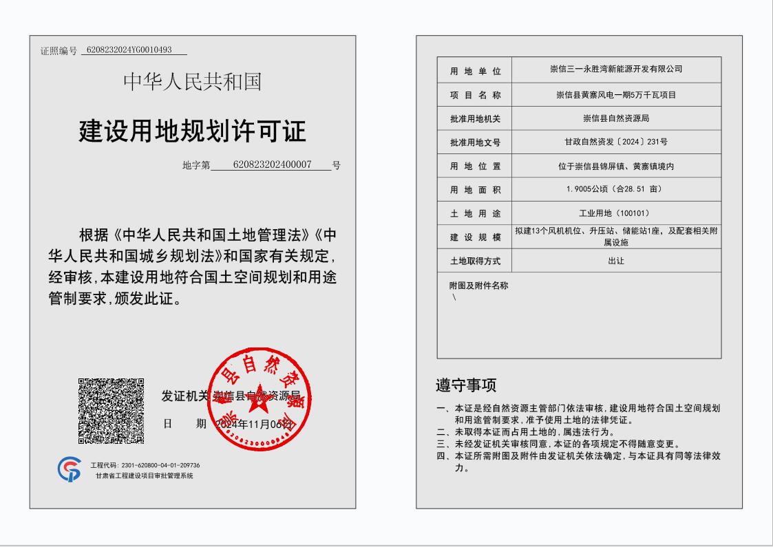 崇信县黄寨风电一期5万千瓦项目 建设用地规划许可证 公示 发文日期:2024-11-06 16:58 来源:崇信县自然资源局 作者:崇信县自然资源局 编辑:崇信县自然资源局 扫一扫在手机打开当前页 上一篇: 赤城煤矿炸药库及运输道路工程建设项目 建设项目用地预审与选址意见书 公示 下一篇: 崇信电厂附属设施凝结水回收泵房建设项目 建设用地规划许可证 公示