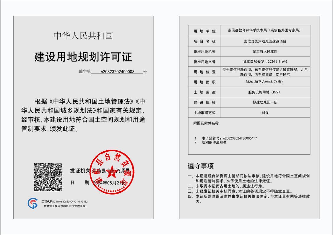 崇信县第六幼儿园建设项目 建设用地规划许可证 公示 发文日期:2024-05-22 11:21 来源:崇信县自然资源局 作者:崇信县自然资源局 编辑:崇信县自然资源局 扫一扫在手机打开当前页 上一篇: 崇信县芮溪文园C区住宅小区 建设工程规划许可证 公示 下一篇: 崇信县五举加油加气站项目 建设用地规划许可证 公示