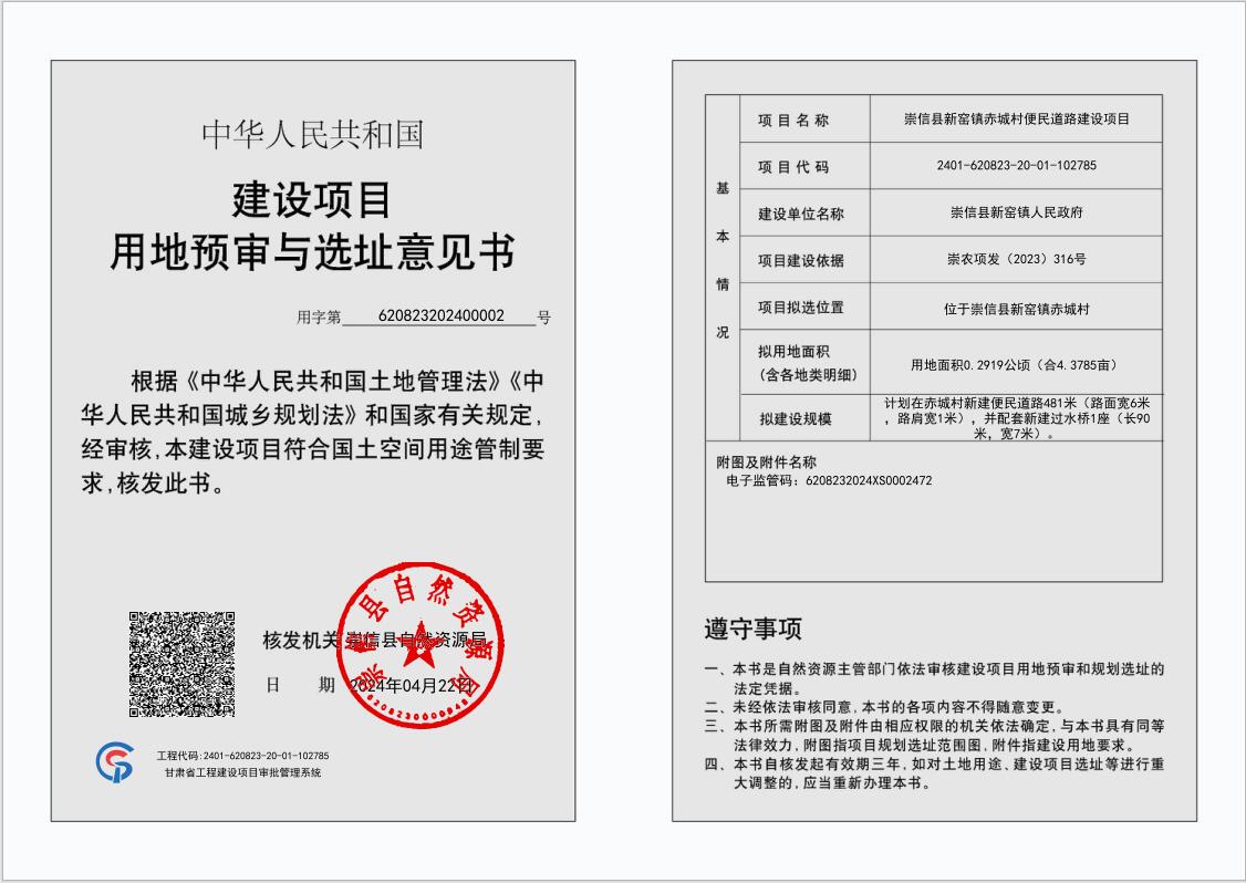 崇信县新窑镇赤城村便民道路建设项目 建设项目用地预审与选址意见书 公示 发文日期:2024-04-23 11:06 来源:崇信县自然资源局 作者:崇信县自然资源局 编辑:崇信县自然资源局 扫一扫在手机打开当前页 上一篇: 崇信县城区供热管道改造建设项目 建设用地规划许可证 公示 下一篇: 崇信县城区供热管道改造建设项目 建设项目用地预审与选址意见书 公示