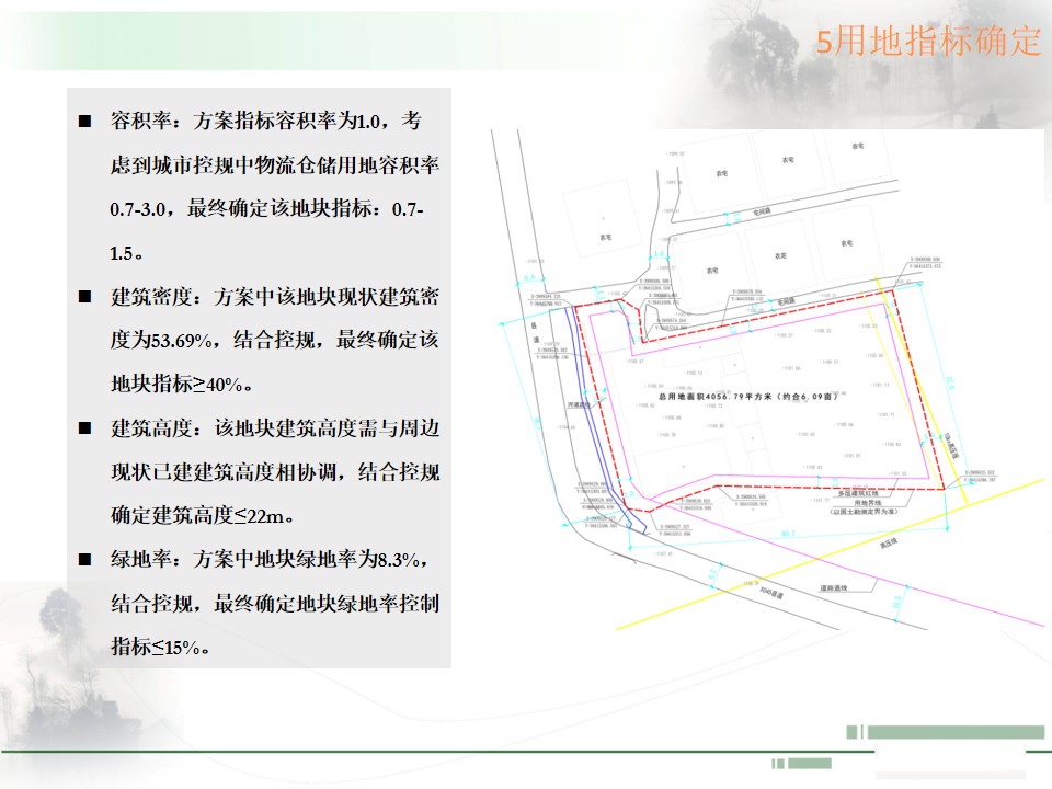 本地块位于锦屏镇关村村,关木路口北侧,规划总用地面积4056.79平方米(约合6.09亩),用地性质为一类物流仓储用地,容积率0.7-1.5(不含地下部分建筑面积),建筑密度不小于40%,建筑高度不大于22米,绿地率不大于15%。