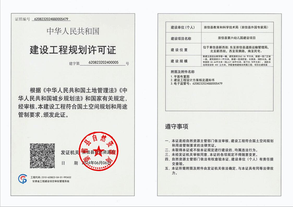 崇信县第六幼儿园建设项目 建设工程规划许可证 公示 发文日期:2024-06-06 16:03 来源:崇信县自然资源局 作者:崇信县自然资源局 编辑:崇信县自然资源局 扫一扫在手机打开当前页 上一篇: 关于撤销崇信县城市更新改造项目《建设项目用地预审与选址意见书》《建设用地规划许可证》的公告 下一篇: 平凉市宏泰热电有限公司背压式热电联产项目批前公示