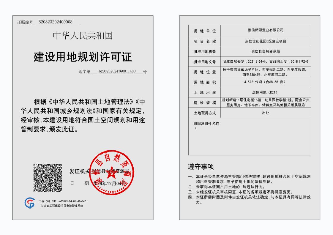 崇信世纪花园D区建设项目 建设用地规划许可证 公示 发文日期:2024-12-04 13:38 来源:崇信县自然资源局 作者:崇信县自然资源局 编辑:崇信县自然资源局 扫一扫在手机打开当前页 上一篇: 崇信县黄寨风电一期5万千瓦项目 建设工程规划许可证 公示 下一篇: 赤城煤矿炸药库及运输道路工程建设项目 建设项目用地预审与选址意见书 公示