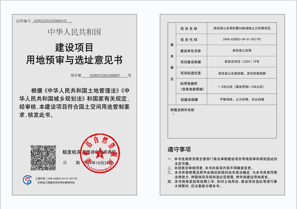 崇信县公安局民警训练场地土方回填项目 建设项目用地预审与选址意见书 公示 发文日期:2024-10-25 14:54 来源:崇信县自然资源局 作者:崇信县自然资源局 编辑:崇信县自然资源局 扫一扫在手机打开当前页 上一篇: 崇信县鲁瑞新型建筑材料有限责任公司五举工业固废处理项目 建设工程规划许可证 公示 下一篇: 崇信县新窑镇赤城村便民道路建设项目 建设项目用地预审与选址意见书 公示