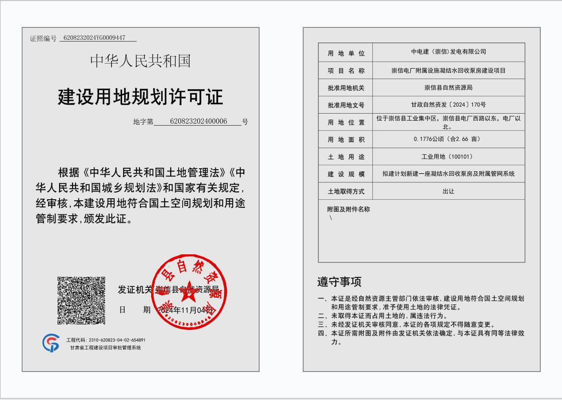 崇信电厂附属设施凝结水回收泵房建设项目 建设用地规划许可证 公示 发文日期:2024-11-04 10:01 来源:崇信县自然资源局 作者:崇信县自然资源局 编辑:崇信县自然资源局 扫一扫在手机打开当前页 上一篇: 崇信县黄寨风电一期5万千瓦项目 建设用地规划许可证 公示 下一篇: 崇信县鲁瑞新型建筑材料有限责任公司五举工业固废处理项目 批前公示