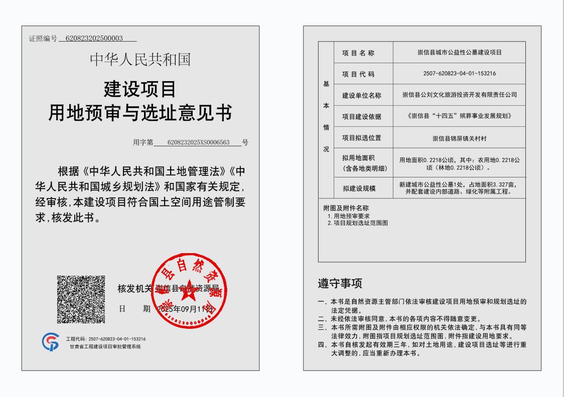 崇信县城市公益性公墓建设项目 建设项目用地预审与选址意见书 公示 发文日期:2025-09-11 09:15 来源:崇信县自然资源局 作者:崇信县自然资源局 编辑:崇信县自然资源局 扫一扫在手机打开当前页 上一篇: 崇信县火化车间及附属设施建设项目 建设项目用地预审与选址意见书 批前公示 下一篇: 崇信县城市公益性公墓建设项目 建设项目用地预审与选址意见书 批前公示