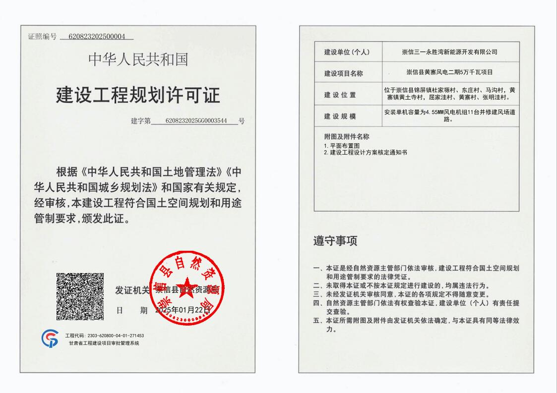 崇信县黄寨风电二期5万千瓦项目 建设工程规划许可证 公示