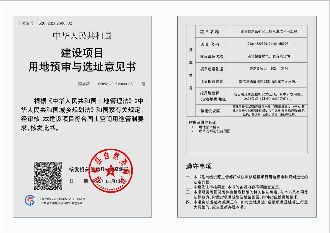 崇信县新窑矿区天然气清洁利用工程 建设项目用地预审与选址意见书 公示 发文日期:2025-05-15 10:37 来源:崇信县自然资源局 作者:崇信县自然资源局 编辑:崇信县自然资源局 扫一扫在手机打开当前页 上一篇: 崇信县凤鸣书院住宅小区建设项目 建设用地规划许可证 公示 下一篇: 崇信县龙泉水库工程 建设项目用地预审与选址意见书 公示