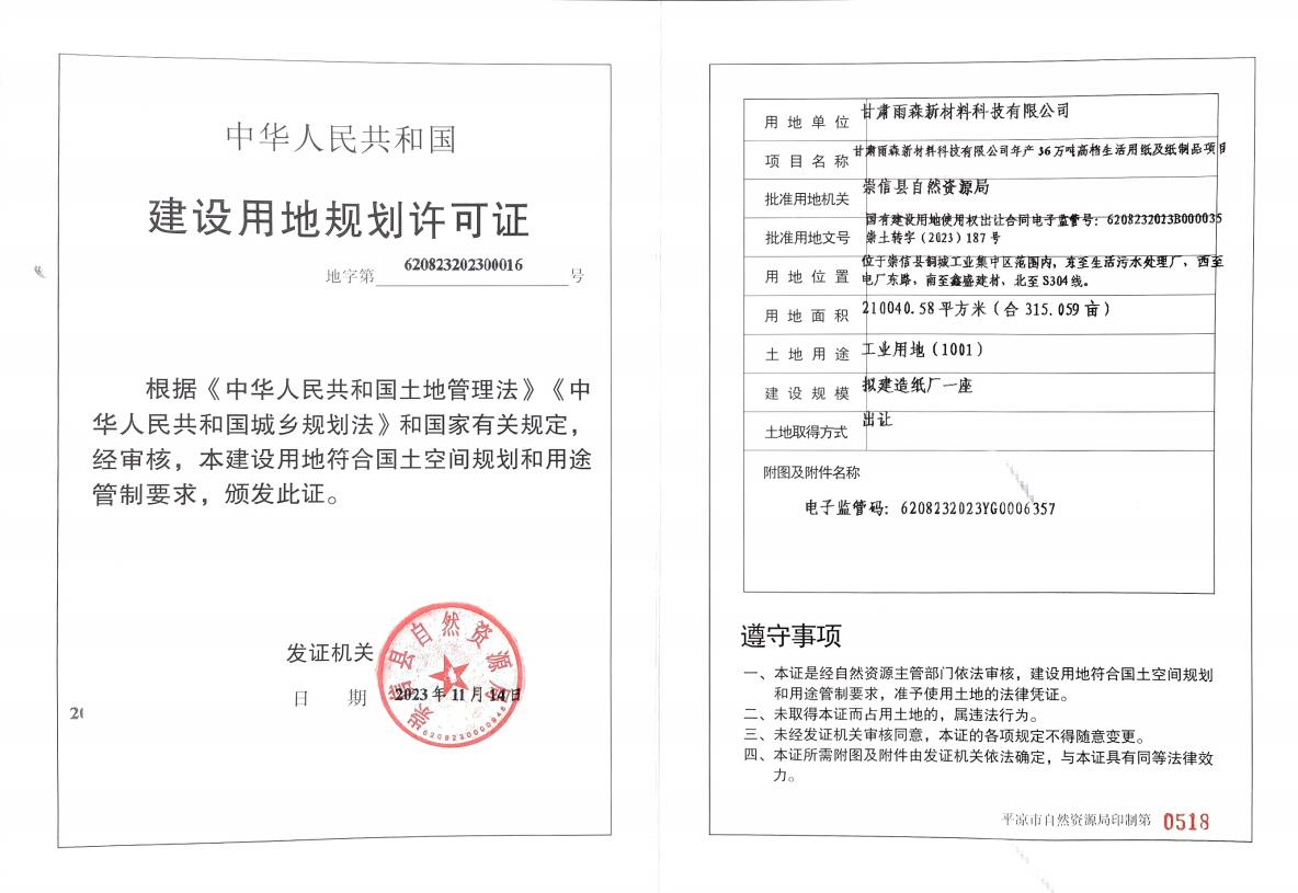 甘肃雨森新材料科技有限公司年产36万吨高档生活用纸及纸制品项目 建设用地规划许可证 公示 发文日期:2023-11-15 10:44 来源:崇信县自然资源局 作者:崇信县自然资源局 编辑:崇信县自然资源局 扫一扫在手机打开当前页 上一篇: 崇信县就业创业示范园建设项目(一期) 建设用地规划许可证 公示 下一篇: 关于崇信县锦屏镇等6个乡镇国土空间总体规划的公示