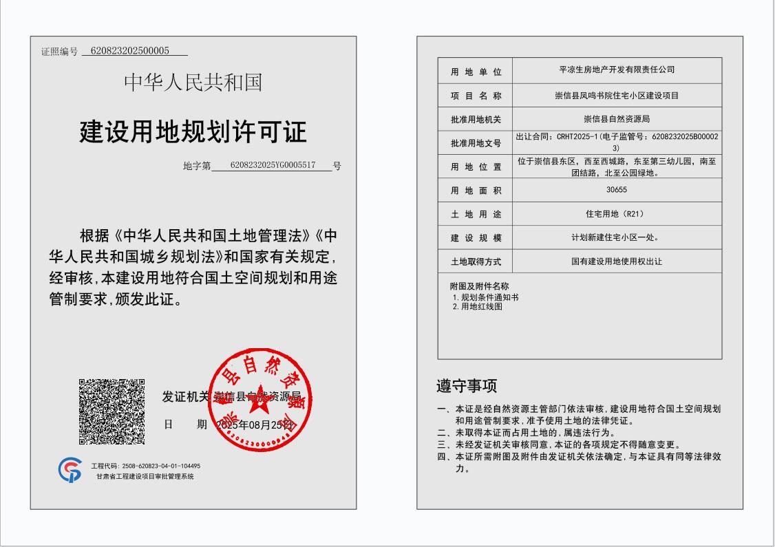 崇信县凤鸣书院住宅小区建设项目 建设用地规划许可证 公示 发文日期:2025-08-25 17:46 来源:崇信县自然资源局 作者:崇信县自然资源局 编辑:崇信县自然资源局 扫一扫在手机打开当前页 上一篇: 崇信县生活污水处理厂建设项目 批前公示 下一篇: 崇信县新窑矿区天然气清洁利用工程 建设项目用地预审与选址意见书 公示