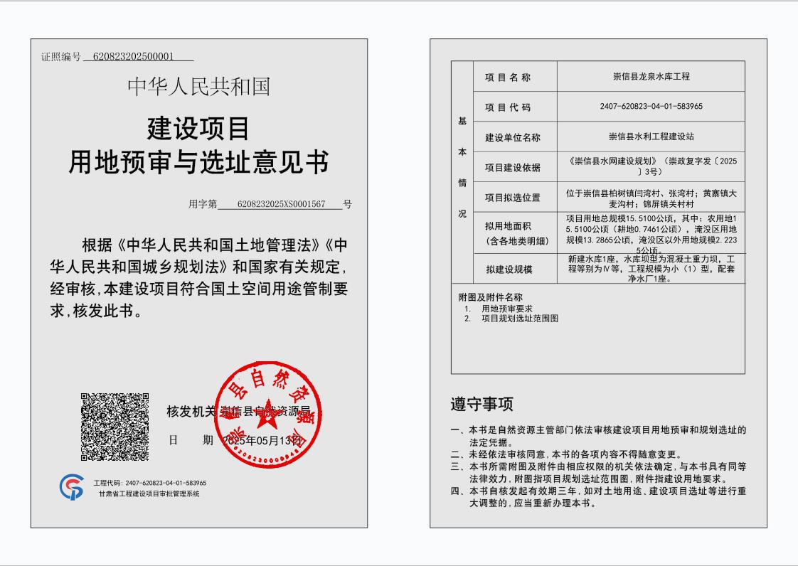 崇信县龙泉水库工程 建设项目用地预审与选址意见书 公示 发文日期:2025-05-13 17:24 来源:崇信县自然资源局 作者:崇信县自然资源局 编辑:崇信县自然资源局 扫一扫在手机打开当前页 上一篇: 崇信县新窑矿区天然气清洁利用工程 建设项目用地预审与选址意见书 公示 下一篇: 崇信县新窑矿区天然气清洁利用工程建设项目用地预审与选址意见书批前公示