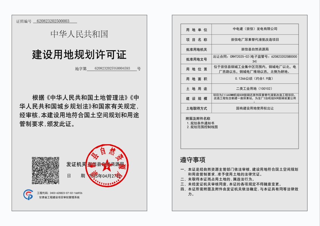 崇信电厂尿素替代液氨改造项目 建设用地规划许可证 公示 发文日期:2025-04-27 11:43 来源:崇信县自然资源局 作者:崇信县自然资源局 编辑:崇信县自然资源局 扫一扫在手机打开当前页 上一篇: 中电建崇信发电有限公司2660MW机组供热改造项目 建设用地规划许可证 公示 下一篇: 崇信县龙泉水库工程建设项目用地预审与选址意见书批前公示
