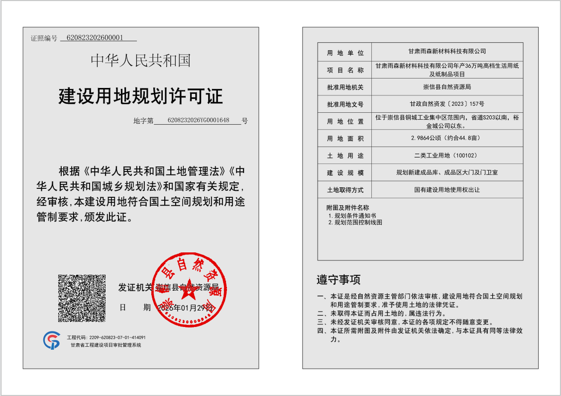 甘肃雨森新材料科技有限公司年产36万吨高档生活用纸及纸制品项目(二期一标段) 建设用地规划许可证 公示 发文日期:2026-01-29 12:11 来源:崇信县自然资源局 作者:崇信县自然资源局 编辑:崇信县自然资源局 扫一扫在手机打开当前页 上一篇: 崇信县尾矿处理项目 建设用地规划许可证 公示 下一篇: 关于《崇信县城西城区单元控制性详细规划》批前公示的公告