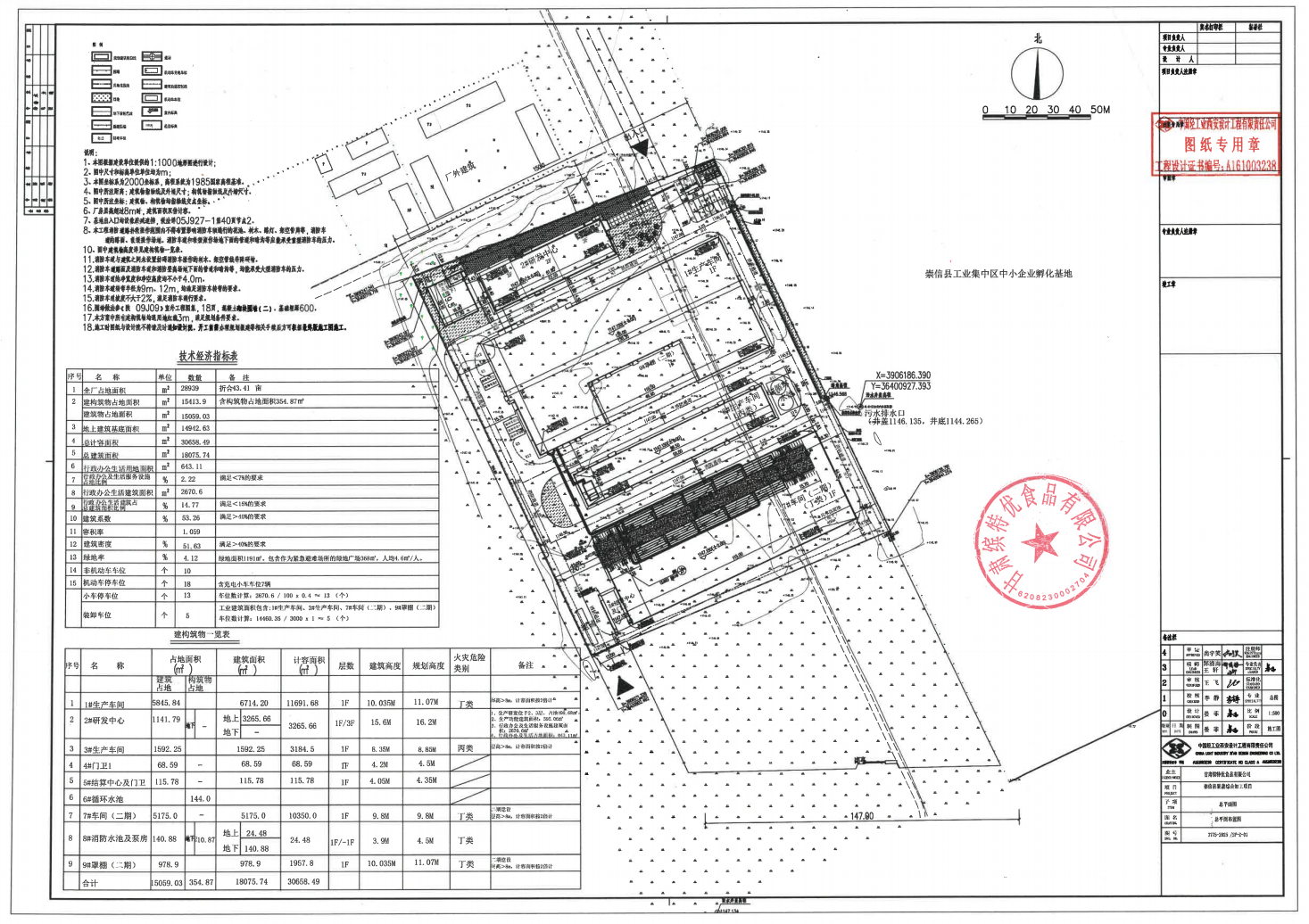 崇信县果蔬综合加工项目位于崇信县工业集中区(铜城片区),块北侧为铜城村委会及现状居民点,东侧为叶润食品加工厂,西侧及南侧现状为耕地。项目规划用地性质为二类工业用地(100102),用地面积28939平方米(合43.41亩),容积率1.059,建筑系数53.26%,绿地率4.12%。项目计划新建1#生产车间、2#研发中心、3#生产车间、4#门卫、5#结算中心及门卫、6#循环水池、7#车间、8#消防水池及泵房、9#罩棚,并配套相关设施。