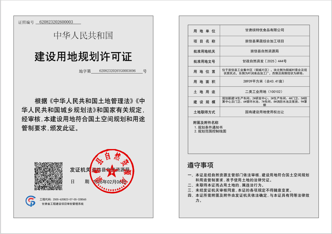 崇信县果蔬综合加工项目 建设用地规划许可证 公示 发文日期:2026-02-06 11:22 来源:崇信县自然资源局 作者:崇信县自然资源局 编辑:崇信县自然资源局 扫一扫在手机打开当前页 上一篇: 崇信县果蔬综合加工项目 批前公示 下一篇: 崇信县尾矿处理项目 建设用地规划许可证 公示