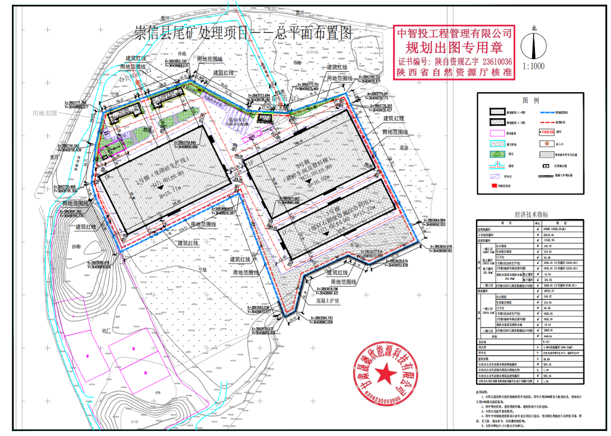 崇信县尾矿处理项目位于崇信县新窑镇赤城村,县道049以南,污水处理厂以东。项目规划用地性质为二类工业用地(100102),用地面积37055平方米(合55.58亩),容积率0.912,建筑系数56.09%,绿地率4.5%。项目计划新建1号棚(免烧砖生产线)、2号棚(破碎车间及原料棚)、3号棚(煤矸石固废资源综合利用)、办公用房、生活服务用房、门卫室、消防水泵房及消防水池,并配套相关设施。