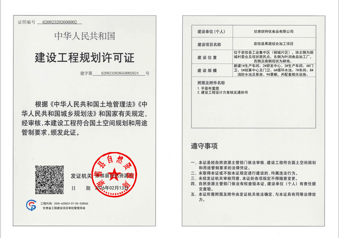 崇信县果蔬综合加工项目 建设工程规划许可证 公示 发文日期:2026-02-13 15:46 来源:崇信县自然资源局 作者:崇信县自然资源局 编辑:崇信县自然资源局 扫一扫在手机打开当前页 上一篇: 中国电建电建电投公司崇信2×660MW燃煤发电项目封闭煤场改造 建设工程规划许可证 公示 下一篇: 崇信县尾矿处理项目 建设工程规划许可证 公示