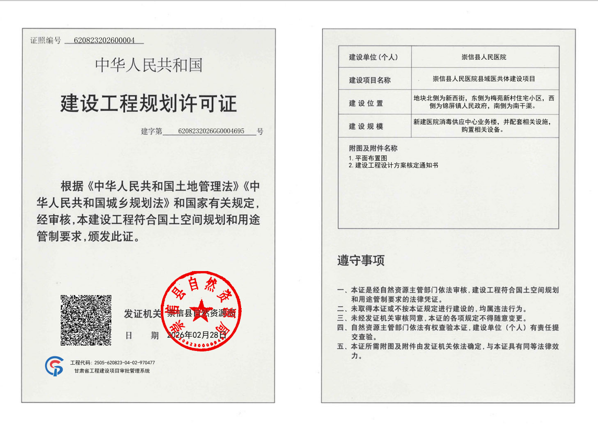崇信县人民医院县域医共体建设项目 建设工程规划许可证 公示 发文日期:2026-02-28 15:49 来源:崇信县自然资源局 作者:崇信县自然资源局 编辑:崇信县自然资源局 扫一扫在手机打开当前页 上一篇: 崇信县新窑镇污水处理厂尾水人工湿地水质净化工程 批前公示 下一篇: 崇信县人民医院县域医共体建设项目 批前公示