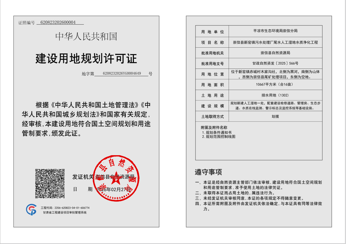 崇信县新窑镇污水处理厂尾水人工湿地水质净化工程 建设用地规划许可证 公示 发文日期:2026-02-27 19:57 来源:崇信县自然资源局 作者:崇信县自然资源局 编辑:崇信县自然资源局 扫一扫在手机打开当前页 上一篇: 崇信县人民医院县域医共体建设项目 批前公示 下一篇: 中国电建电建电投公司崇信2×660MW燃煤发电项目封闭煤场改造 建设工程规划许可证 公示