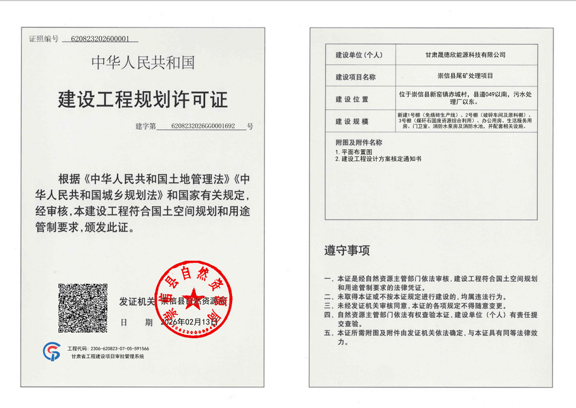 崇信县尾矿处理项目 建设工程规划许可证 公示 发文日期:2026-02-13 15:44 来源:崇信县自然资源局 作者:崇信县自然资源局 编辑:崇信县自然资源局 扫一扫在手机打开当前页 上一篇: 崇信县果蔬综合加工项目 建设工程规划许可证 公示 下一篇: 中电建(崇信)发电有限公司封闭煤场改造项目 批前公示